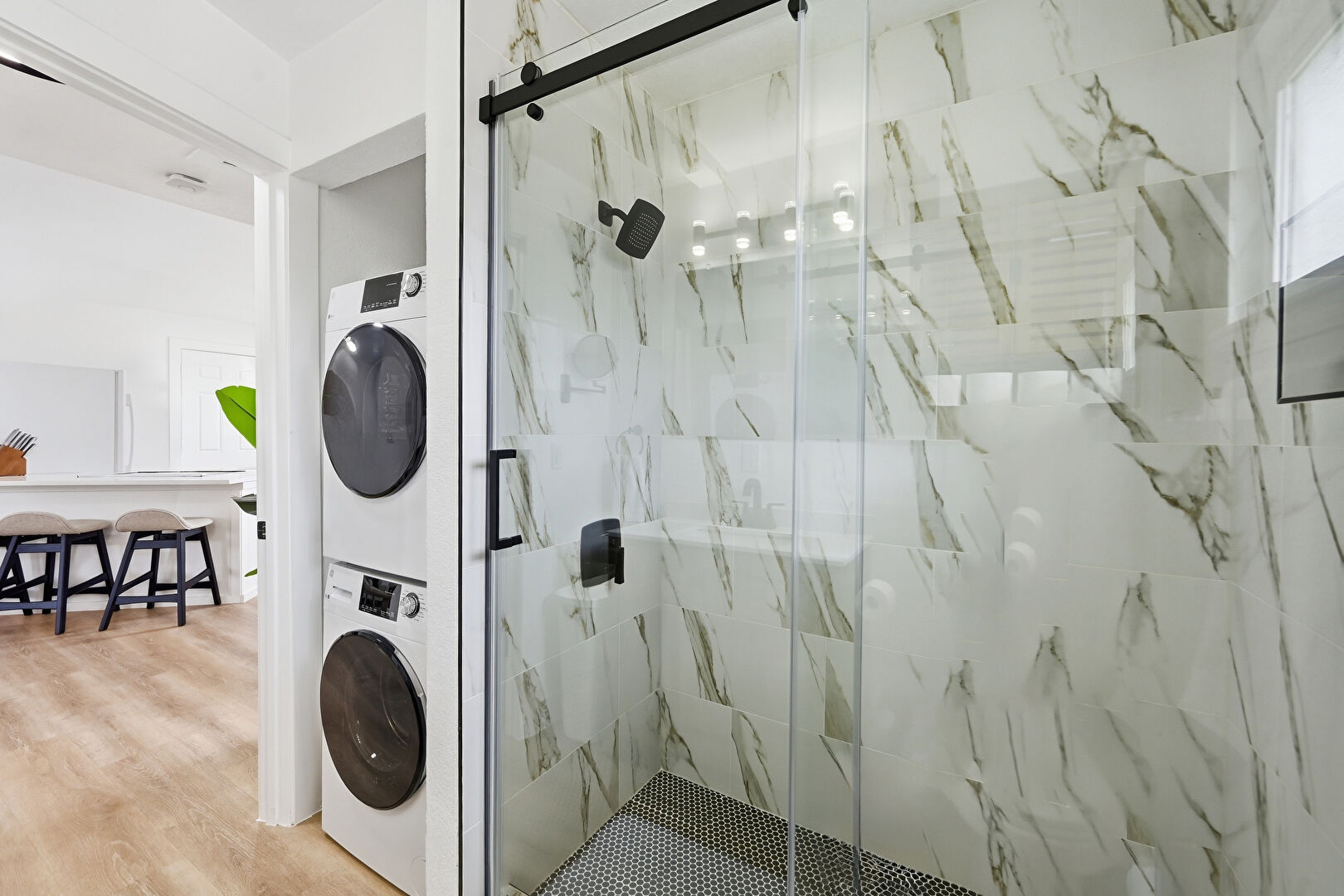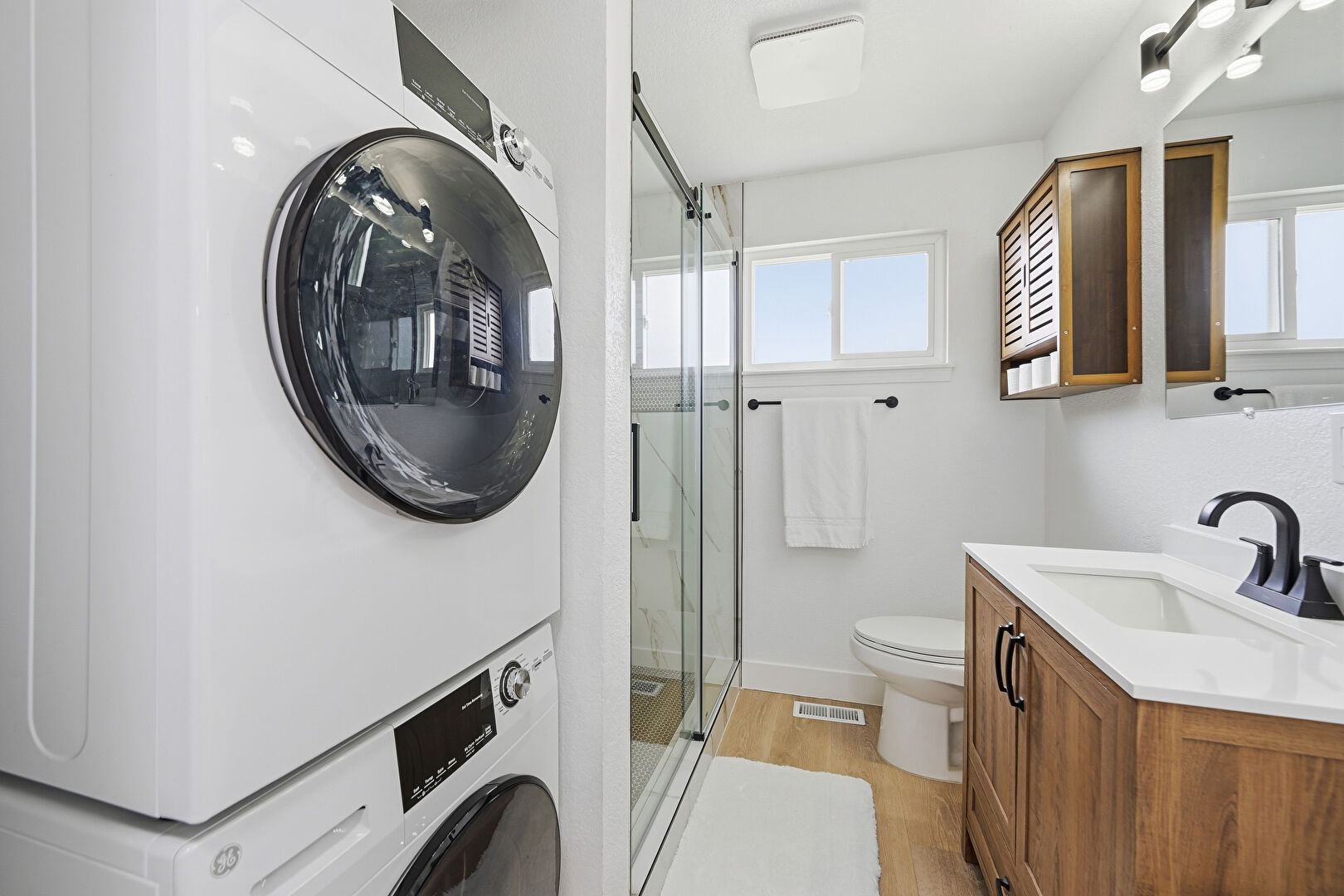 Baseboards Wall, Drywall, Full Bathroom, Laundry, Natural Light, Textured Wall, Vanity, Vent, Wood Finish Floor, Full Bathroom, Natural Light, Wood Finish Floor