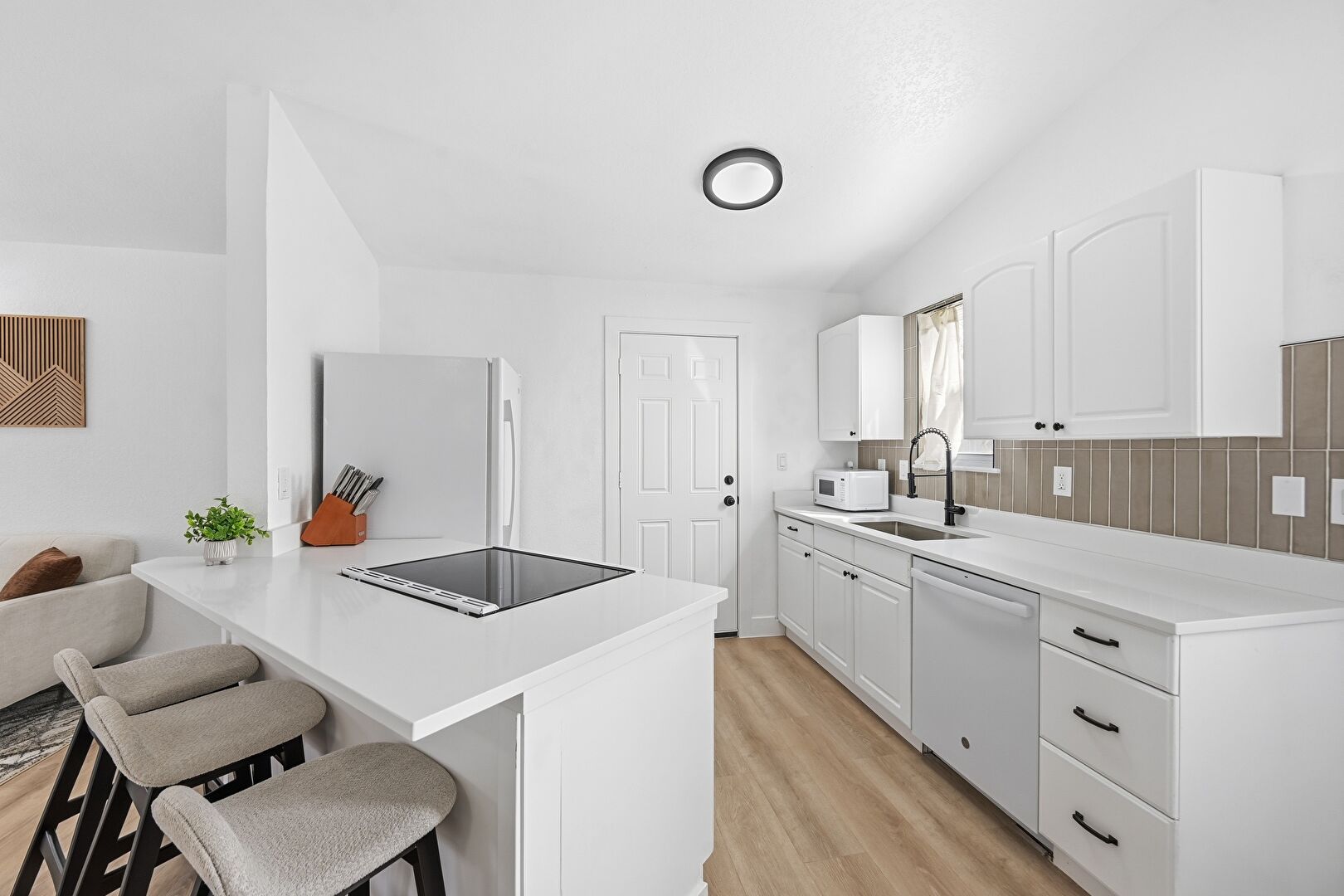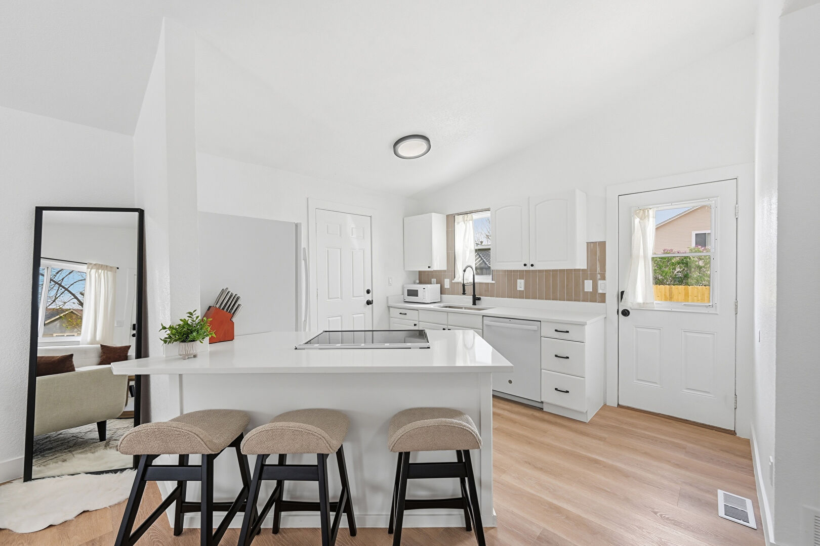 Arched Cabinets, Baseboards Wall, Drywall, Kitchen Bar, Kitchen Peninsula, Natural Light, Opens To Living Area, Raised Cabinets, Stone Countertops, Vaulted Ceiling, Vent, Wood Finish Floor, Arched Cabinets, Kitchen Peninsula, Natural Light, Stone Countertops
