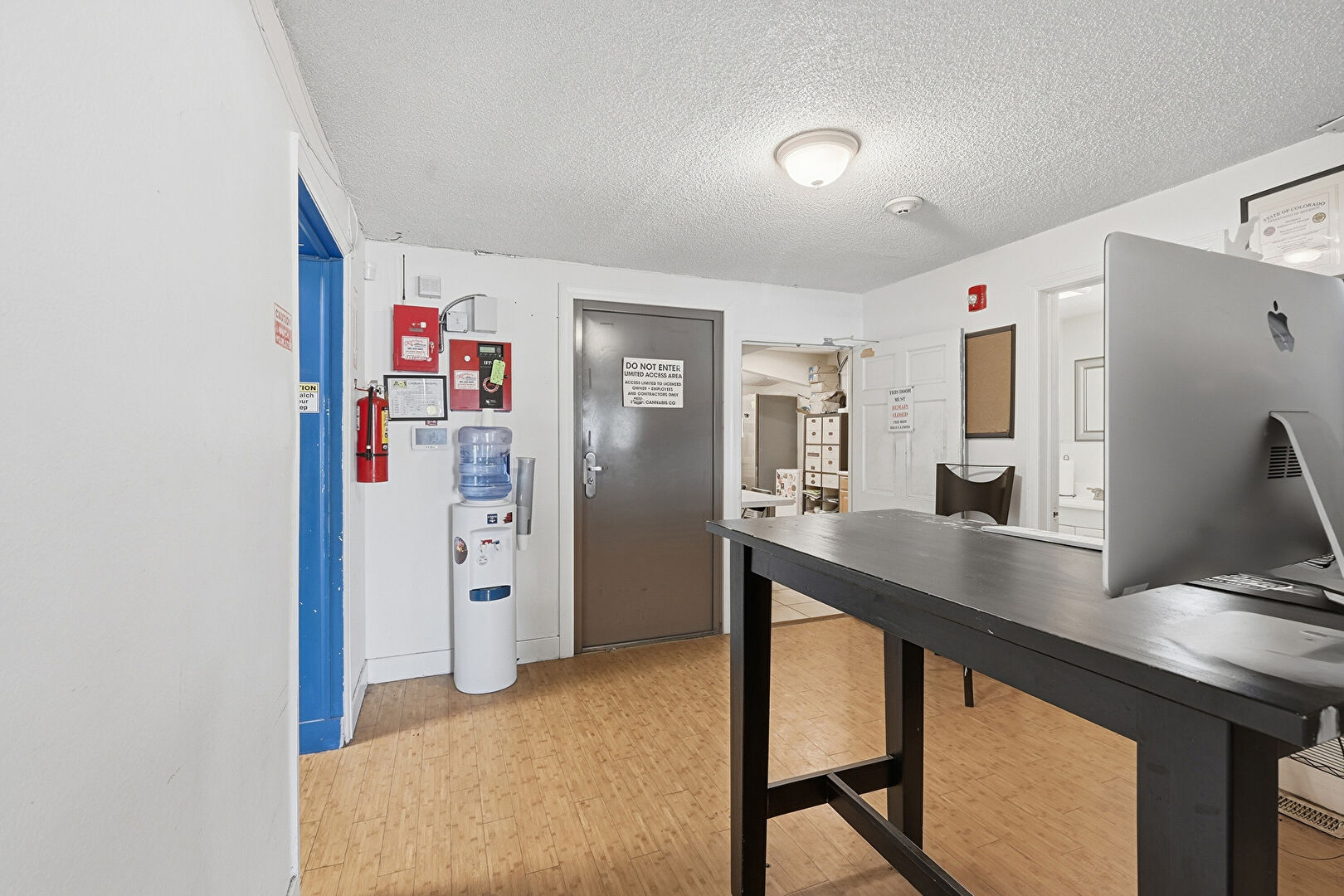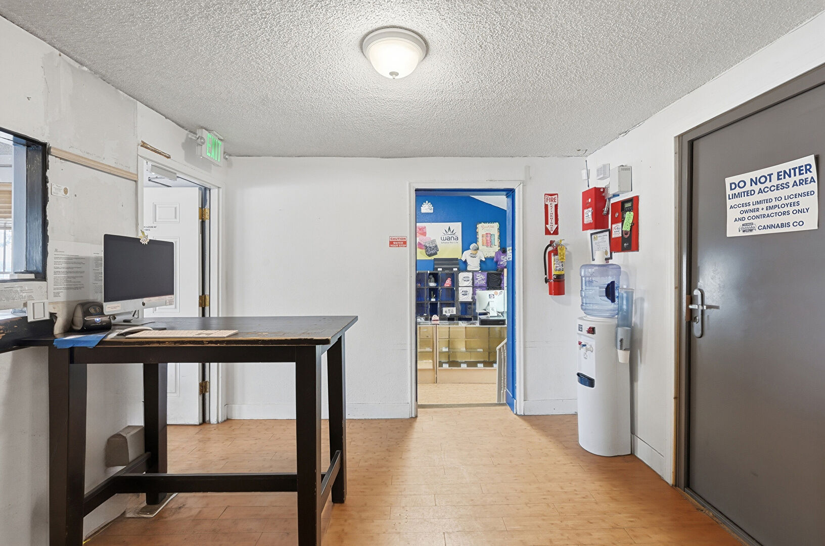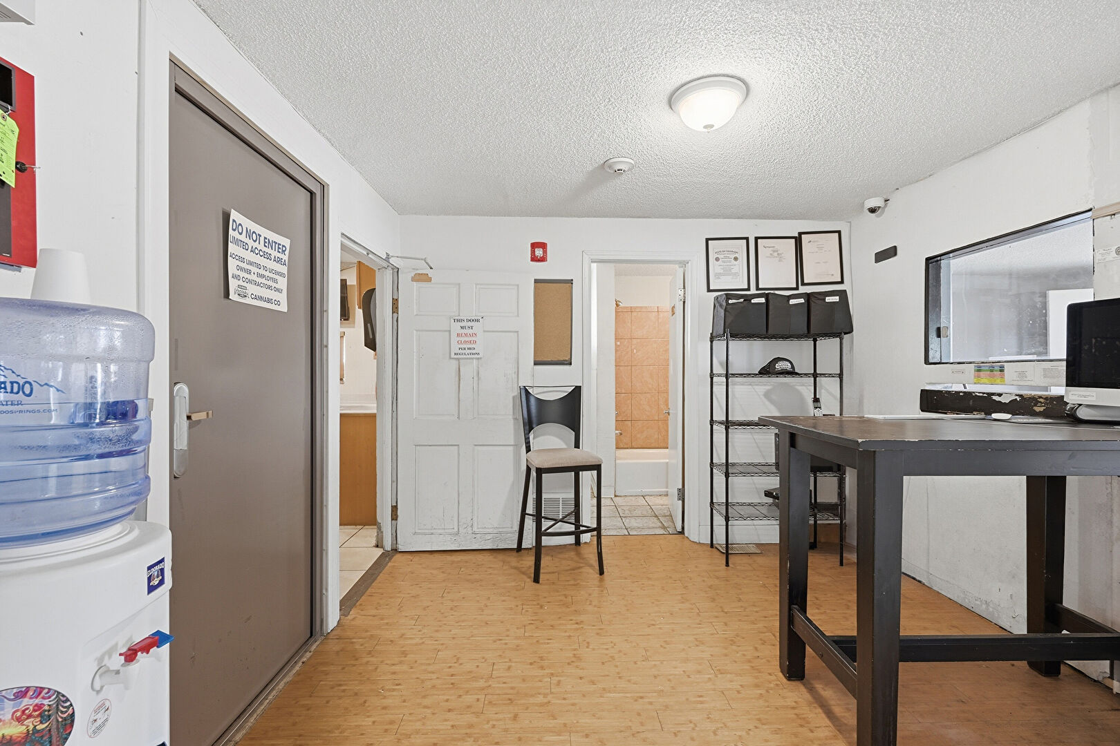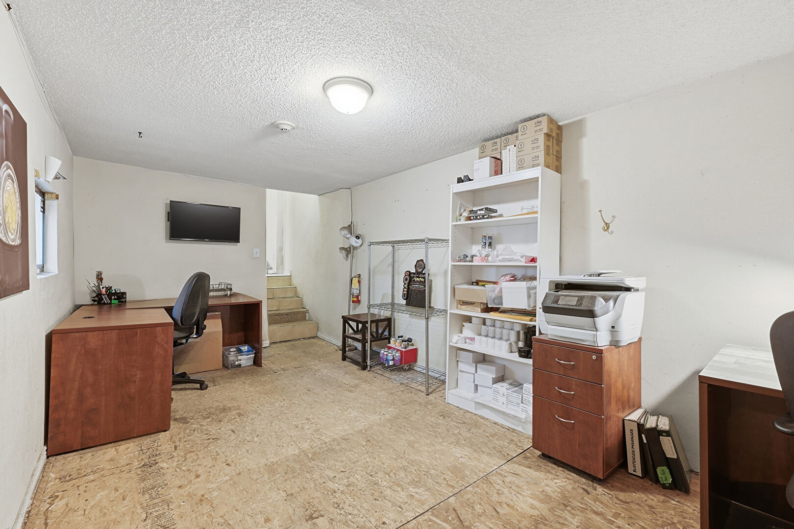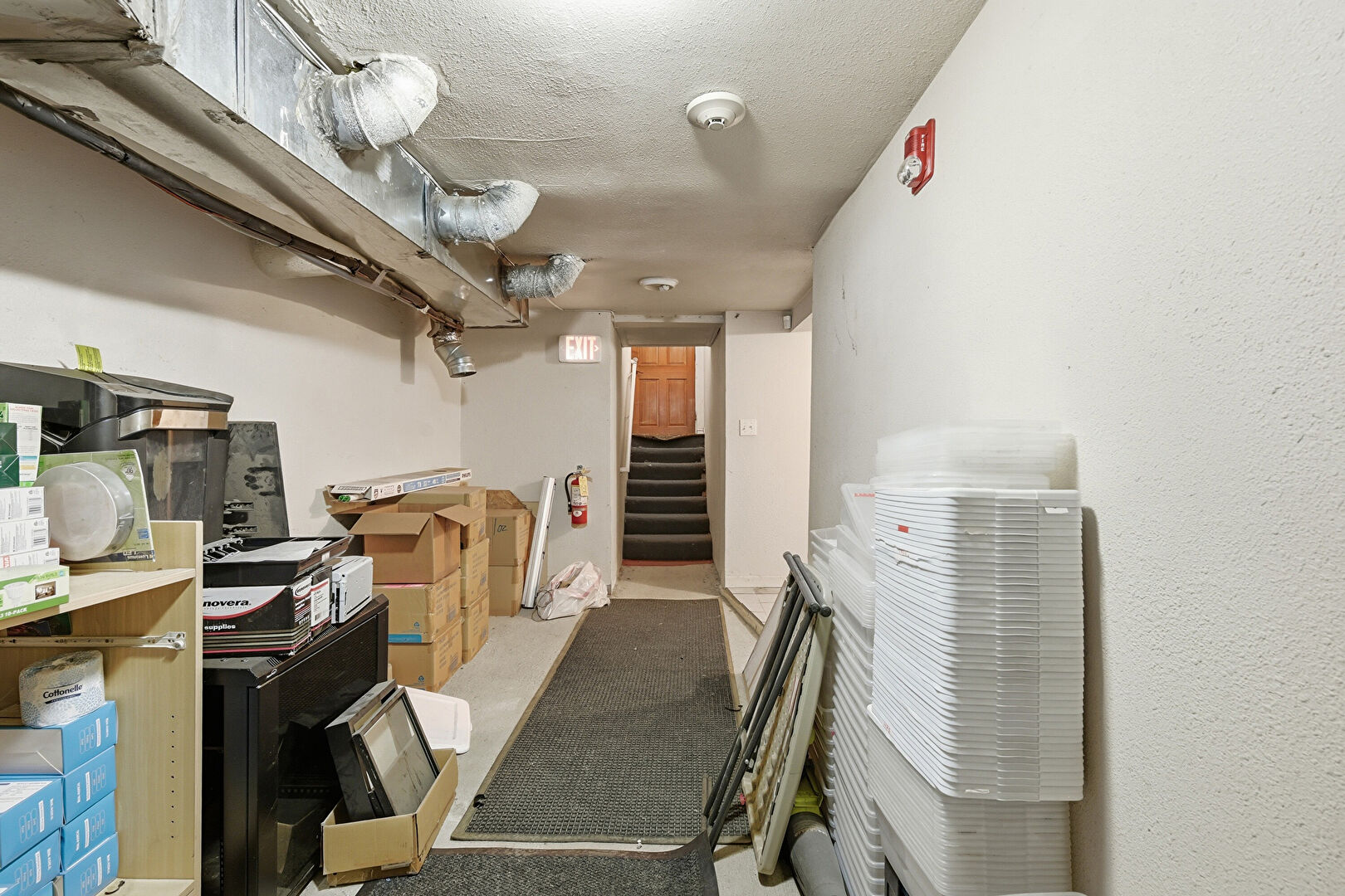 Baseboards Wall, Basement, Drywall, Fire Alarm, Office Area, Security Camera, Smoke Carbon Monoxide Detector, Textured Ceiling, Vinyl Floor, Drywall, Fire Extinguisher, Office Area, Security Camera, Smoke Carbon Monoxide Detector