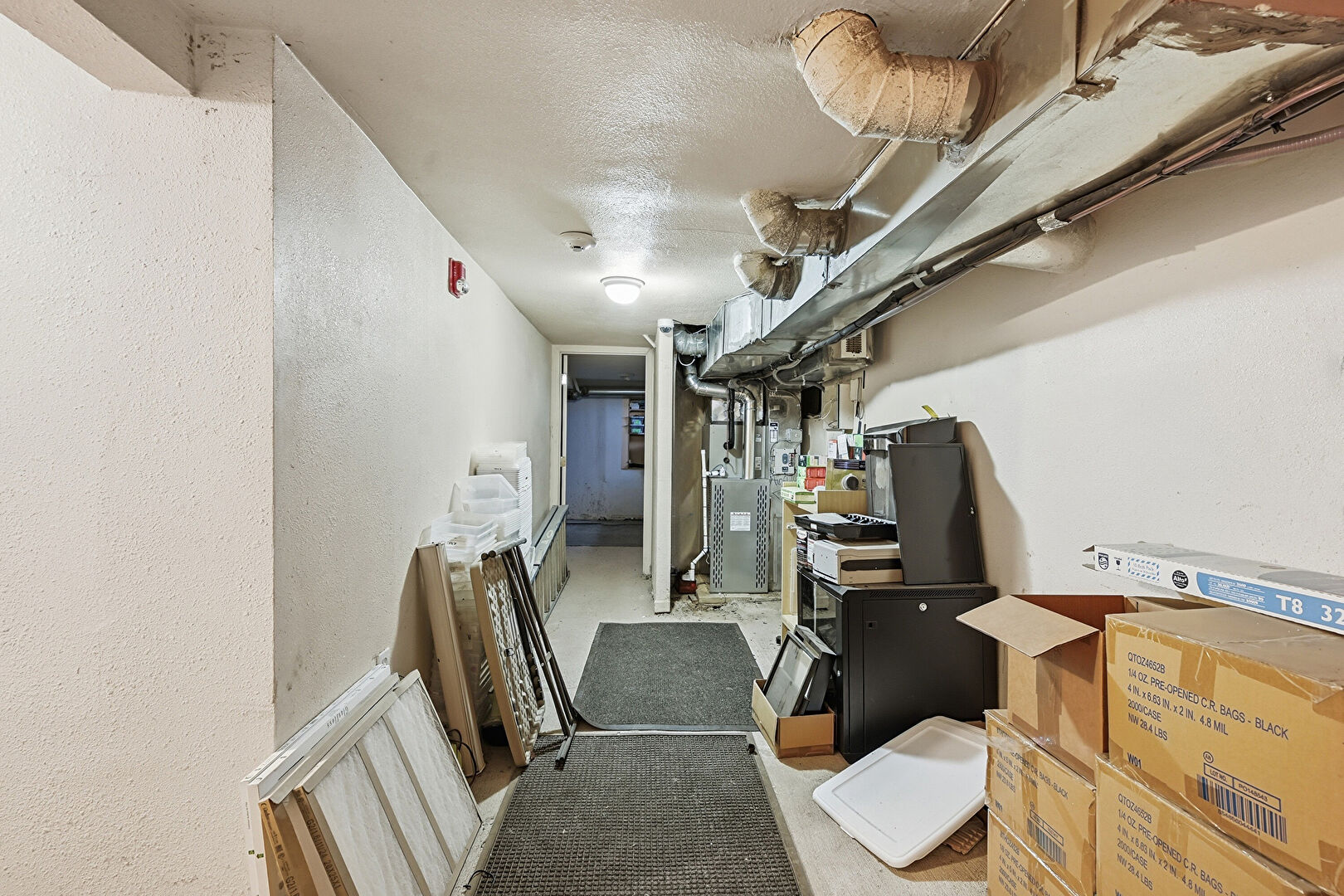Basement, Drywall, Fire Alarm, Furnace, Smoke Carbon Monoxide Detector, Textured Ceiling, Textured Wall, Basement, Fire Extinguisher, Smoke Carbon Monoxide Detector, Vinyl Floor