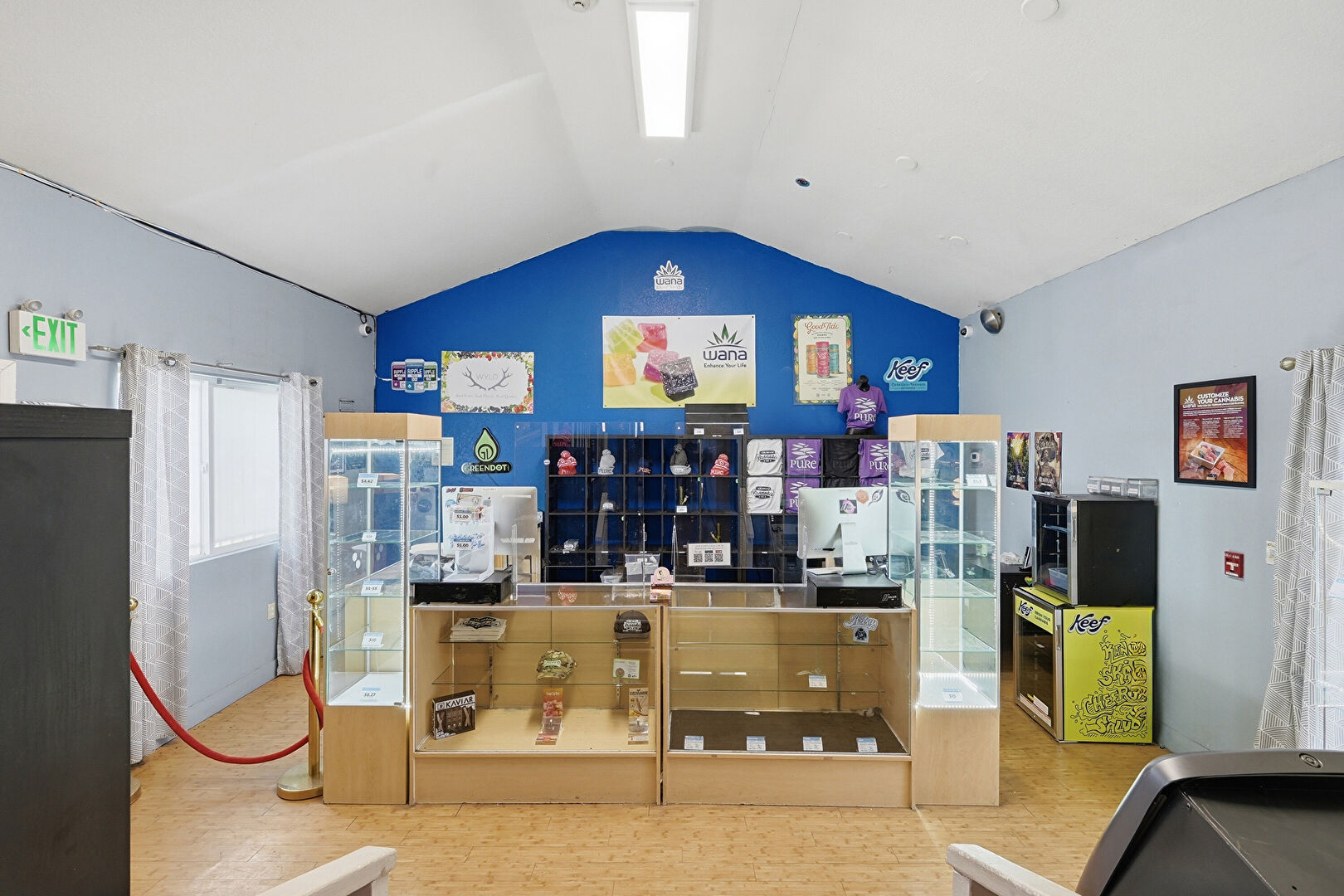 Baseboards Wall, Drywall, Medium Brown Cabinets, Open Shelves, Raised Cabinets, Recessed Lighting, Security Camera, Smoke Carbon Monoxide Detector, Natural Light, Smoke Carbon Monoxide Detector, Tile Floor