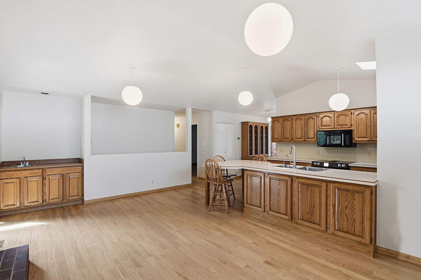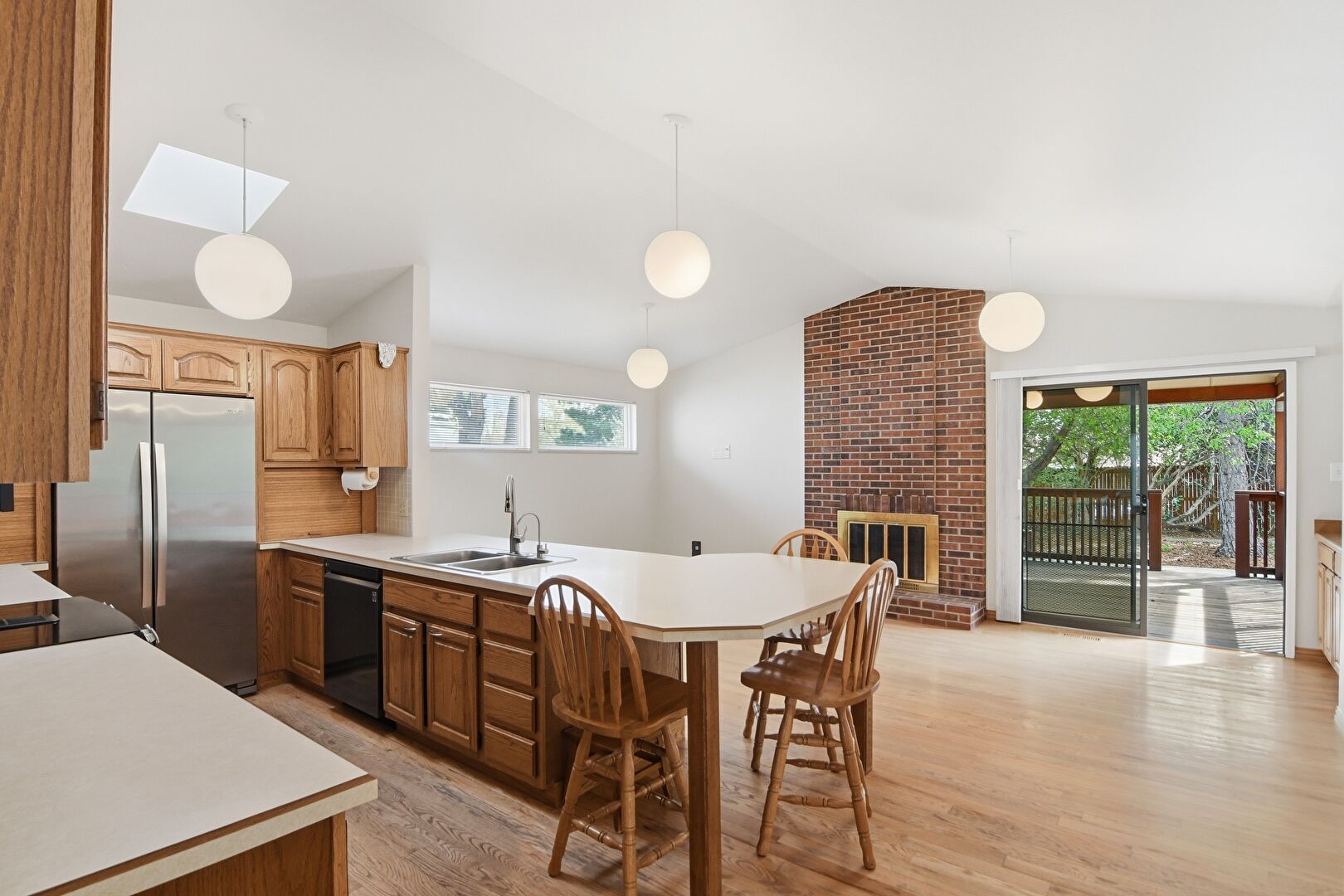 Arched Cabinets, Baseboards Wall, Cathedral Ceiling, Crown Molding Cabinets, Drywall, Fireplace, High Ceiling, Kitchen Bar, Kitchen Peninsula, Medium Brown Cabinets, Natural Light, Pendant Lighting, Raised Cabinets, Skylight, Vaulted Ceiling, Vent, Visible Hinge Cabinets, Wood Finish Floor, Medium Brown Cabinets, Visible Hinge Cabinets