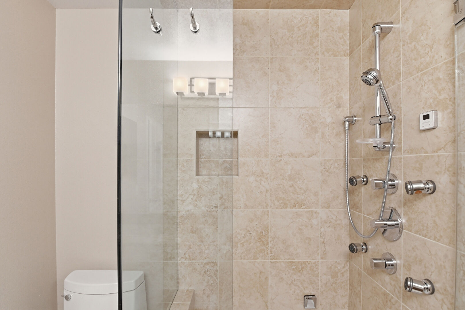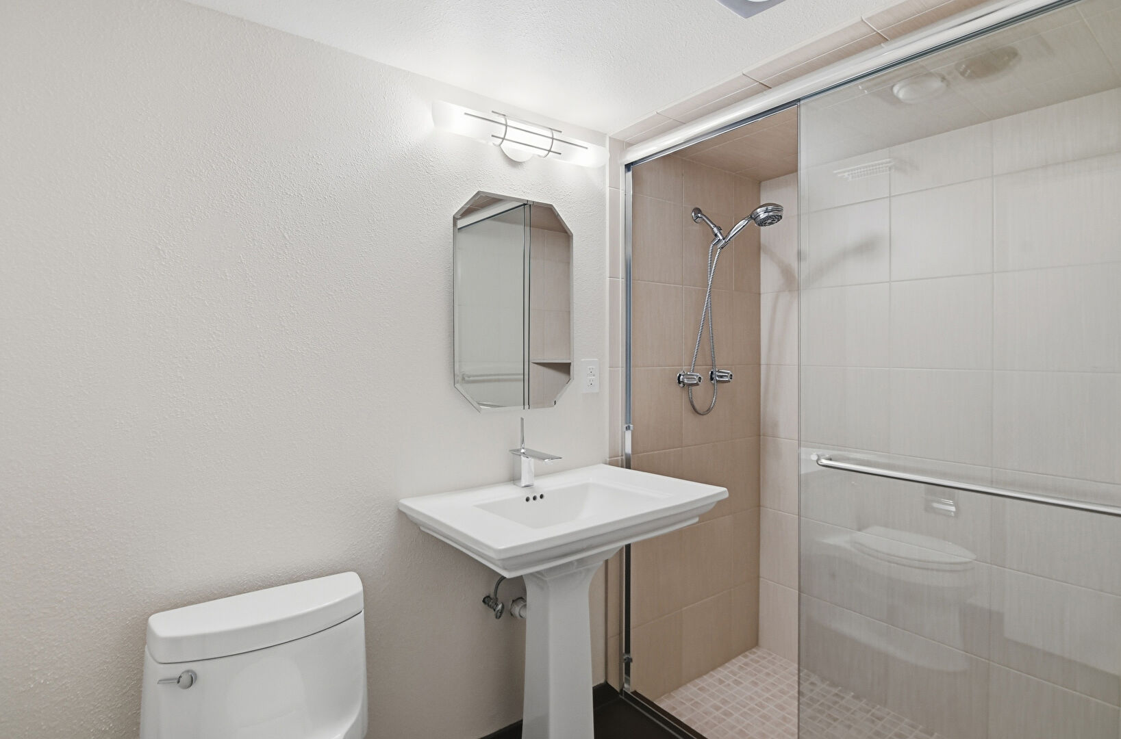 Combined Bath Shower, Drywall, Textured Wall, Tile Floor, Vanity, Vent, Full Bathroom