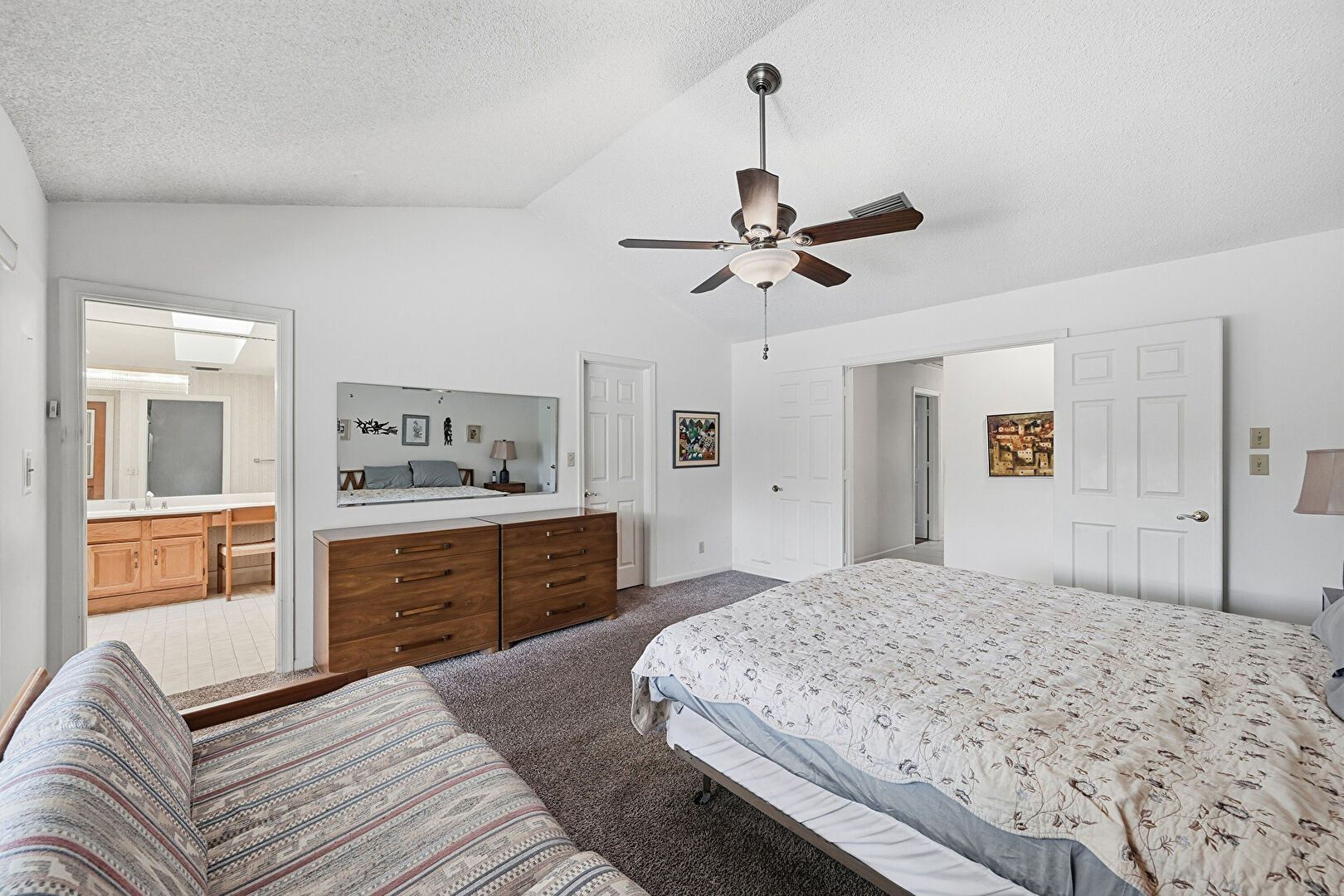 Access To Exterior, Baseboards Wall, Carpet, Cathedral Ceiling, Ceiling Fan, Drywall, Ensuite Bathroom, High Ceiling, Natural Light, Textured Ceiling, Vaulted Ceiling, Vent, Baseboards Wall, Carpet, Drywall, High Ceiling