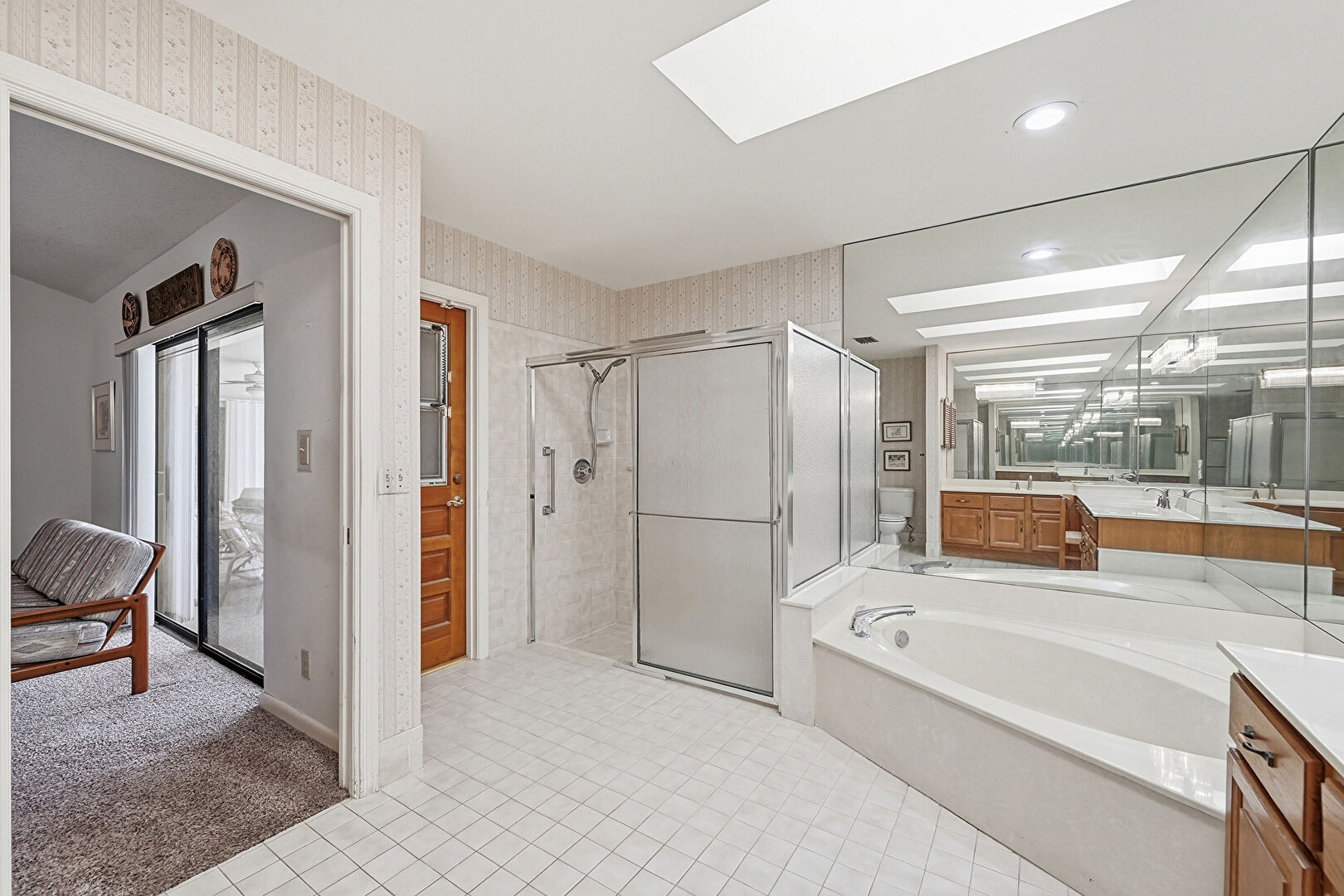 Baseboards Wall, Carpet, Closet, Natural Light, Recessed Lighting, Skylight, Tile Floor, Vanity, Wallpaper Wall, Full Bathroom