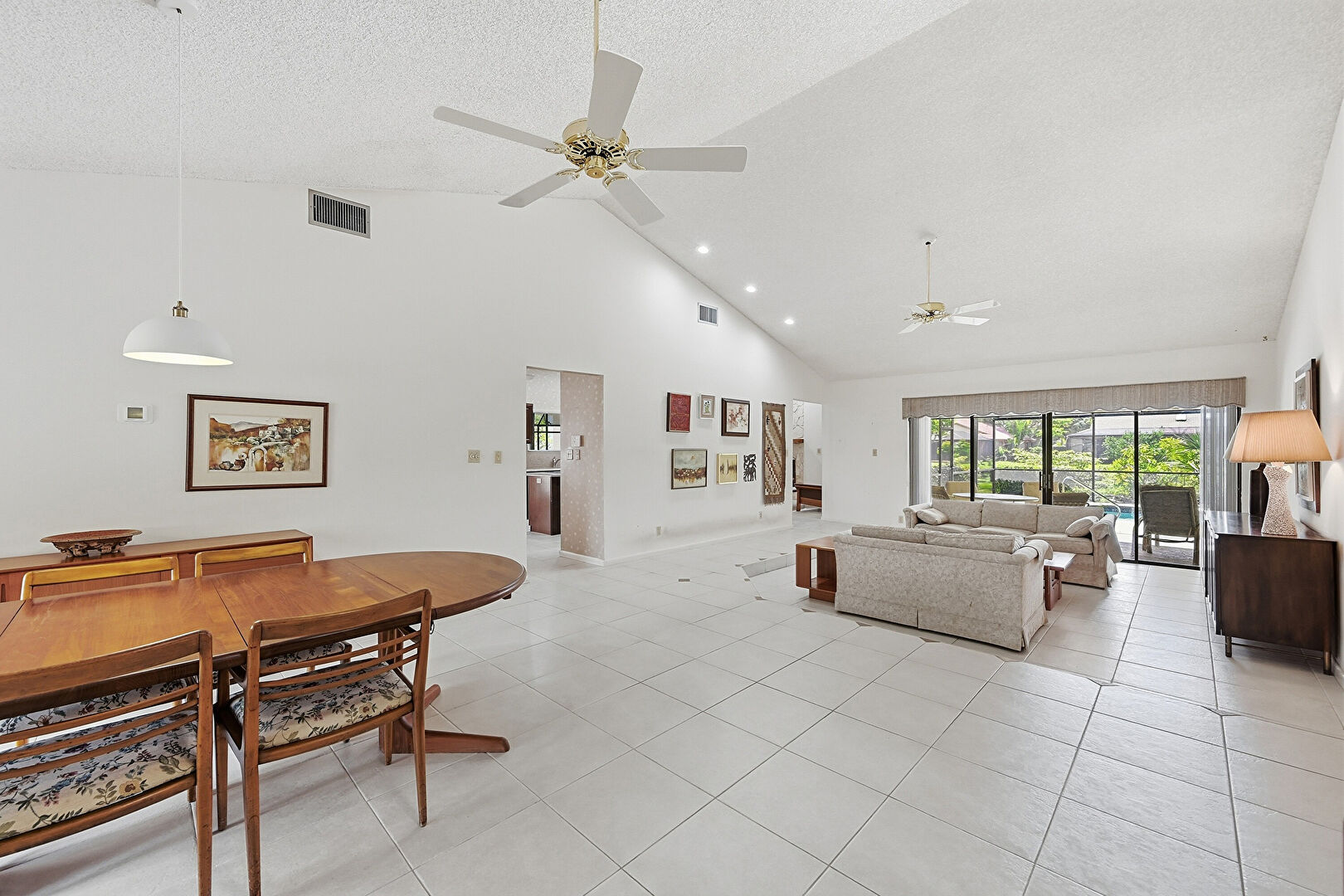 Baseboards Wall, Ceiling Fan, Drywall, High Ceiling, Natural Light, Recessed Lighting, Textured Ceiling, Tile Floor, Vent, Vaulted Ceiling