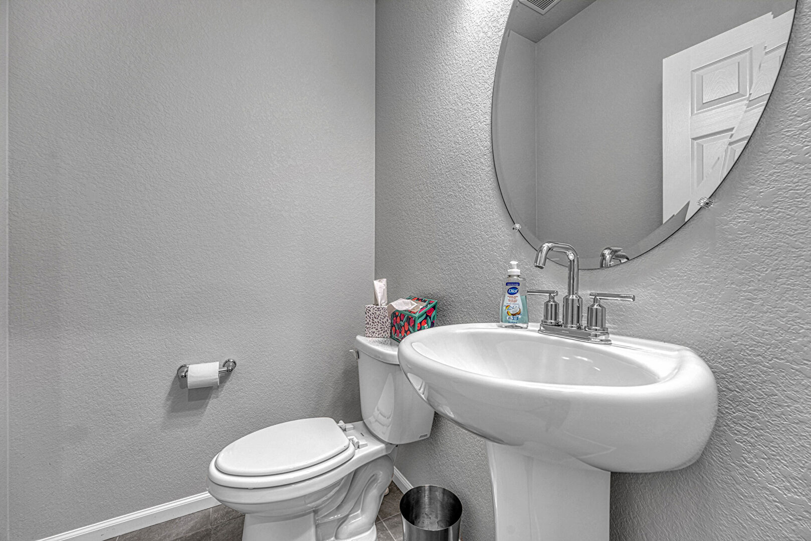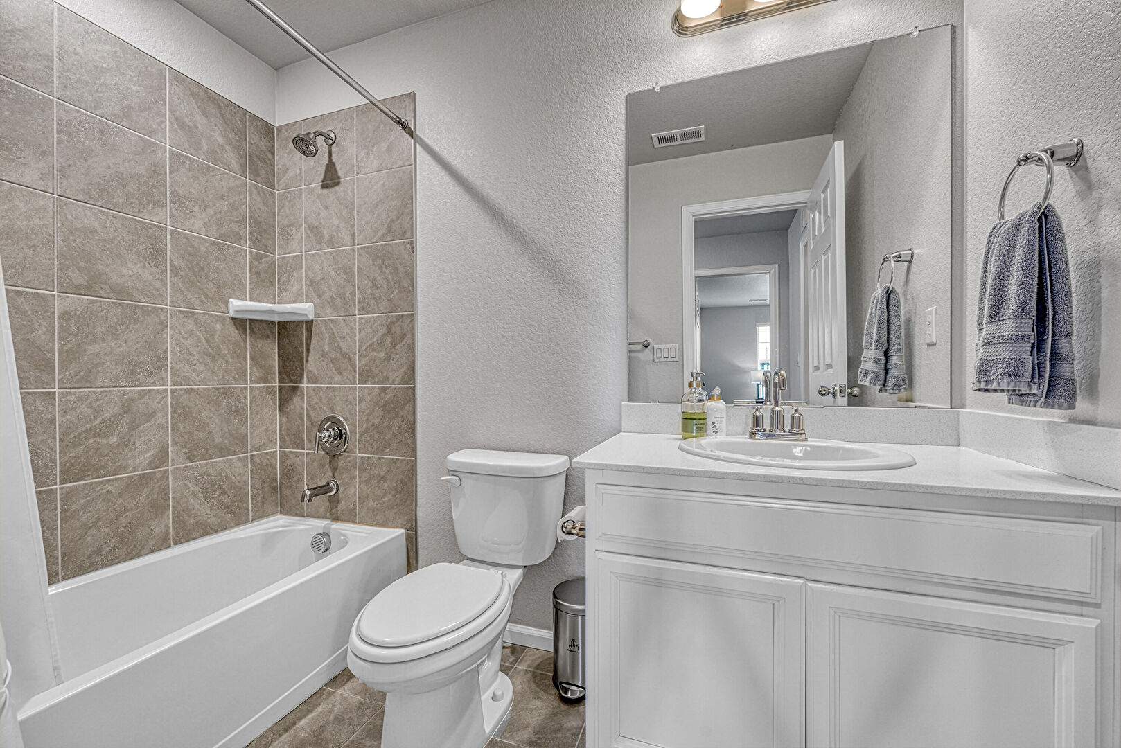 Baseboards Wall, Combined Bath Shower, Full Bathroom, Textured Wall, Tile Floor, Vanity, Vent, Baseboards Wall, Half Bathroom