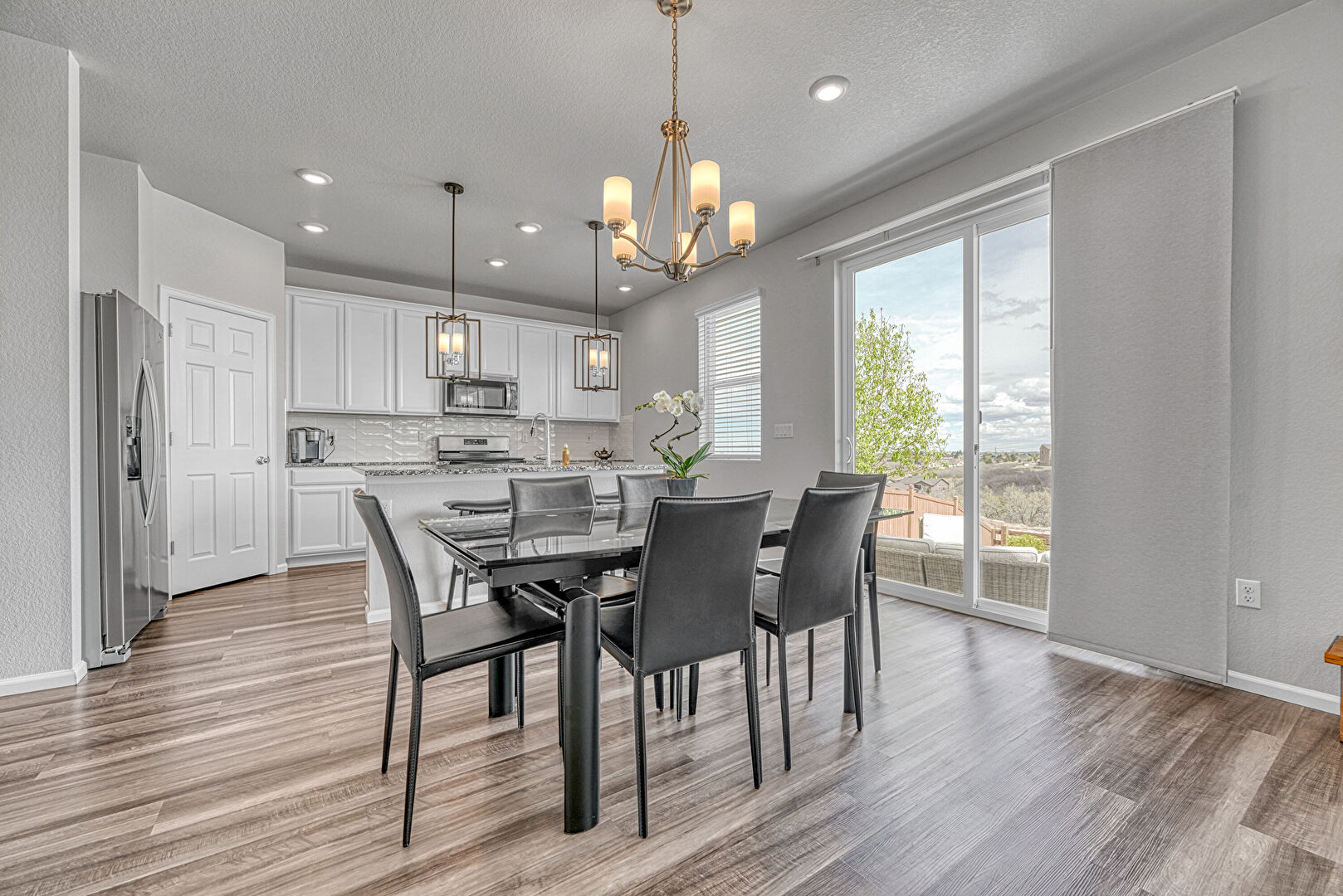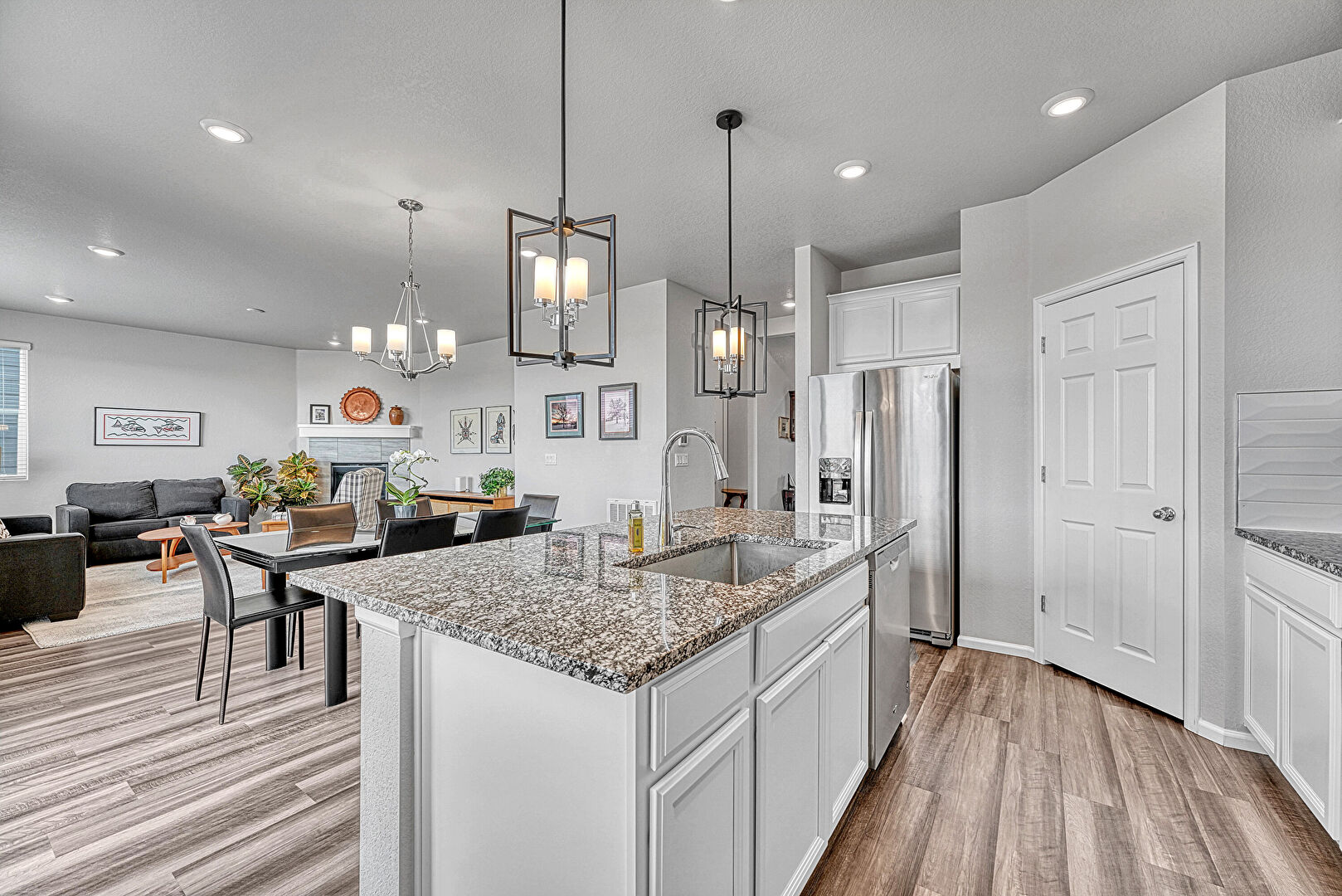 Baseboards Wall, Crown Molding Cabinets, Drywall, Fireplace, Kitchen Bar, Kitchen Island, L Shaped Kitchen, Natural Light, Notable Chandelier, Opens To Living Area, Pendant Lighting, Recessed Lighting, Shaker Cabinets, Stone Countertops, Textured Ceiling, Textured Wall, Vent, Wood Finish Floor, Fireplace, Natural Light, Notable Chandelier, Shaker Cabinets