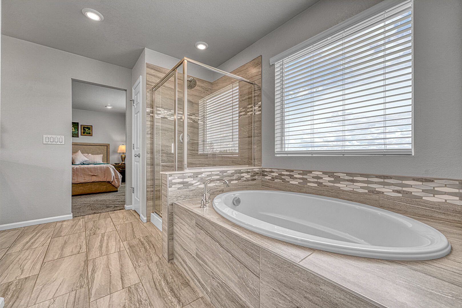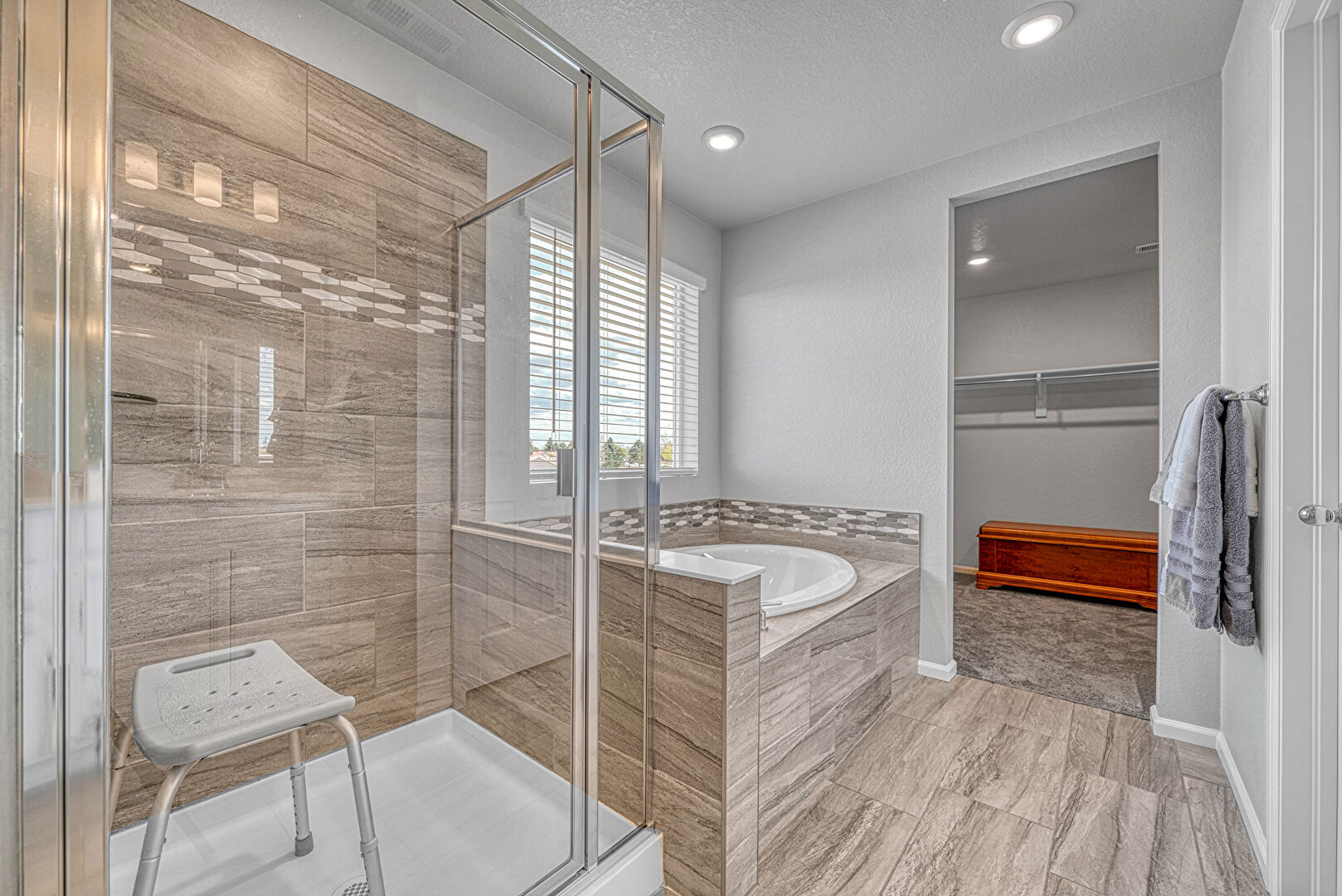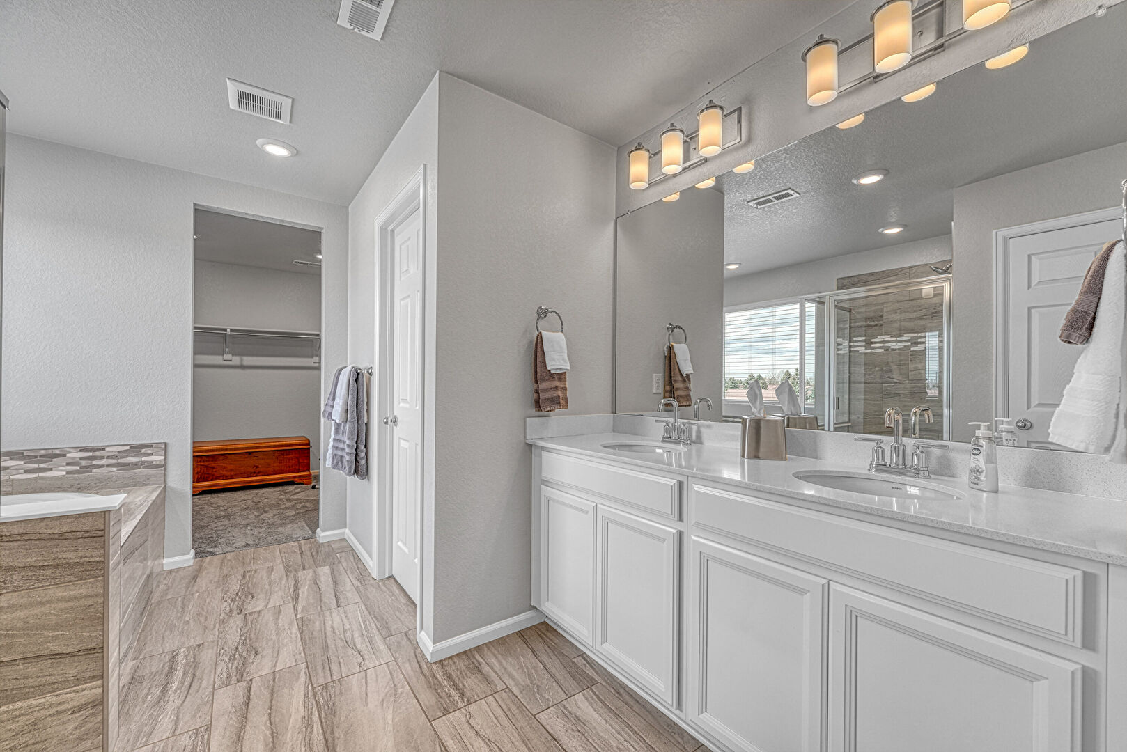 Baseboards Wall, Double Vanity, Drywall, Ensuite Bathroom, Full Bathroom, Natural Light, Recessed Lighting, Textured Ceiling, Vent, Walk In Closet, Natural Light, Textured Wall, Walk In Closet