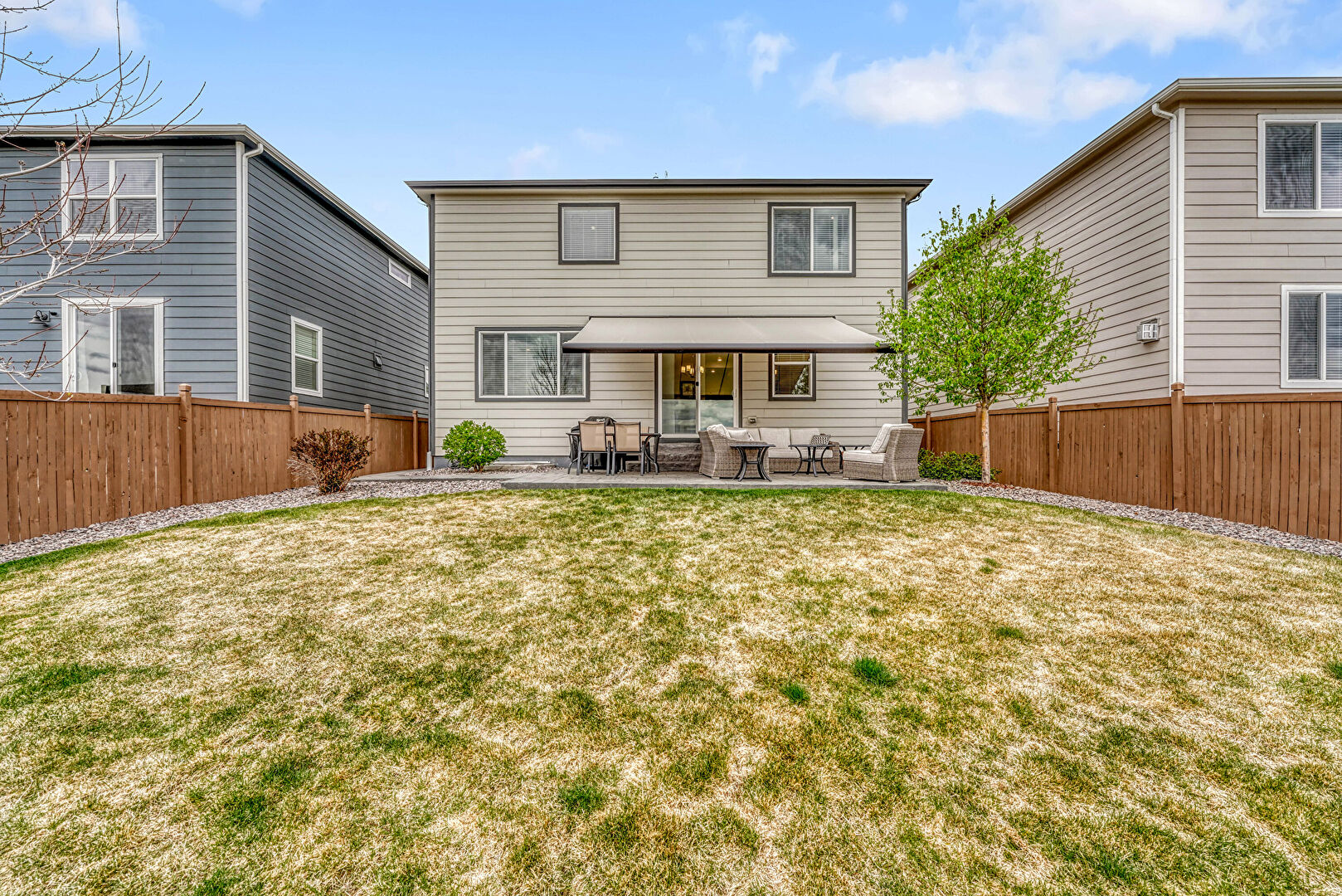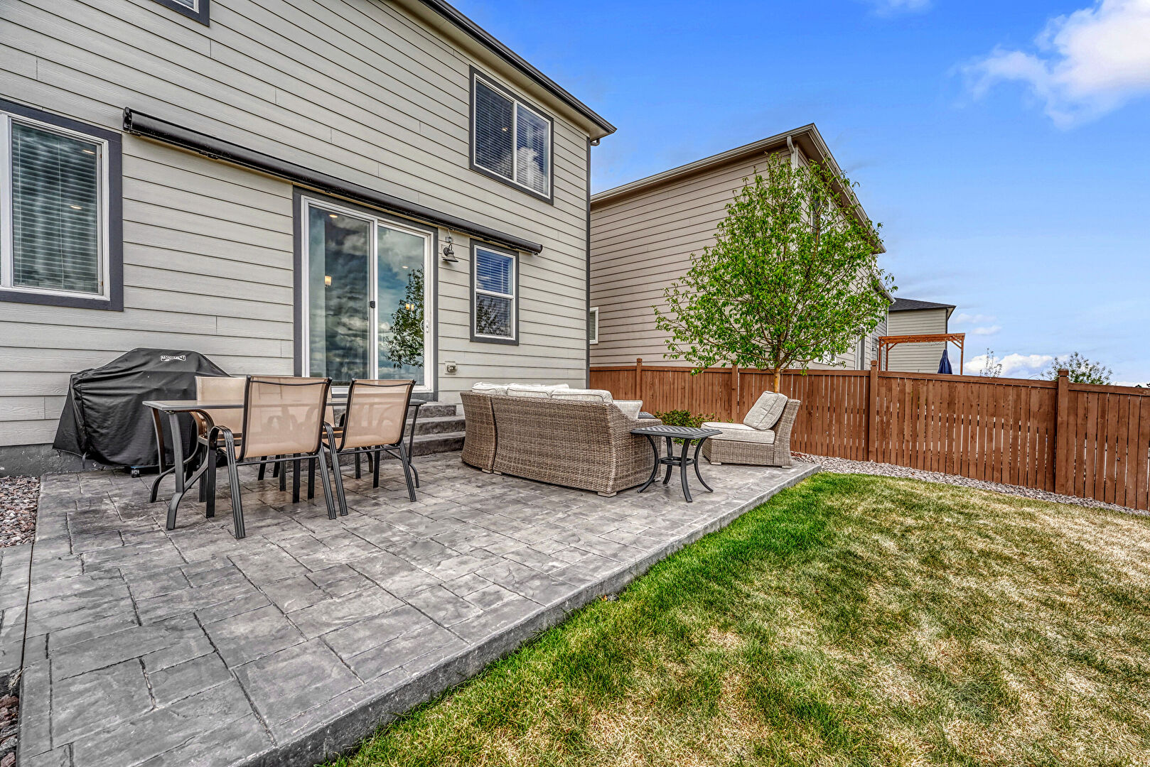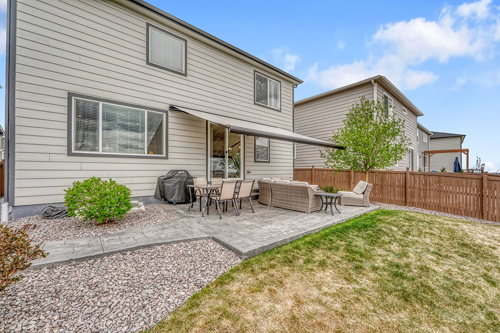 Awning, Concrete Foundation, Downspout, Fence, Grill, Gutters, Horizontal Siding, Lawn, Outdoor Dining Area, Outdoor Living Space, Patio, Fence, Lawn, Patio
