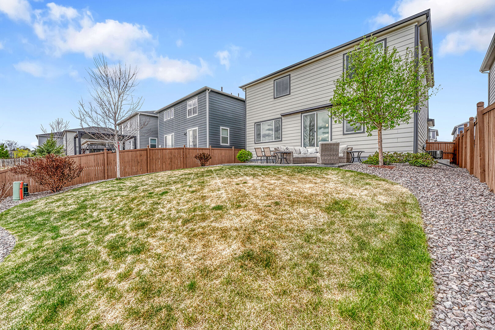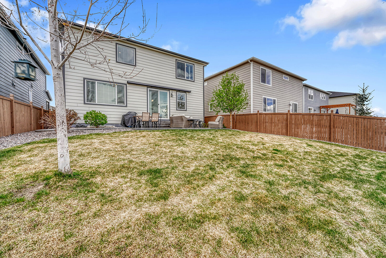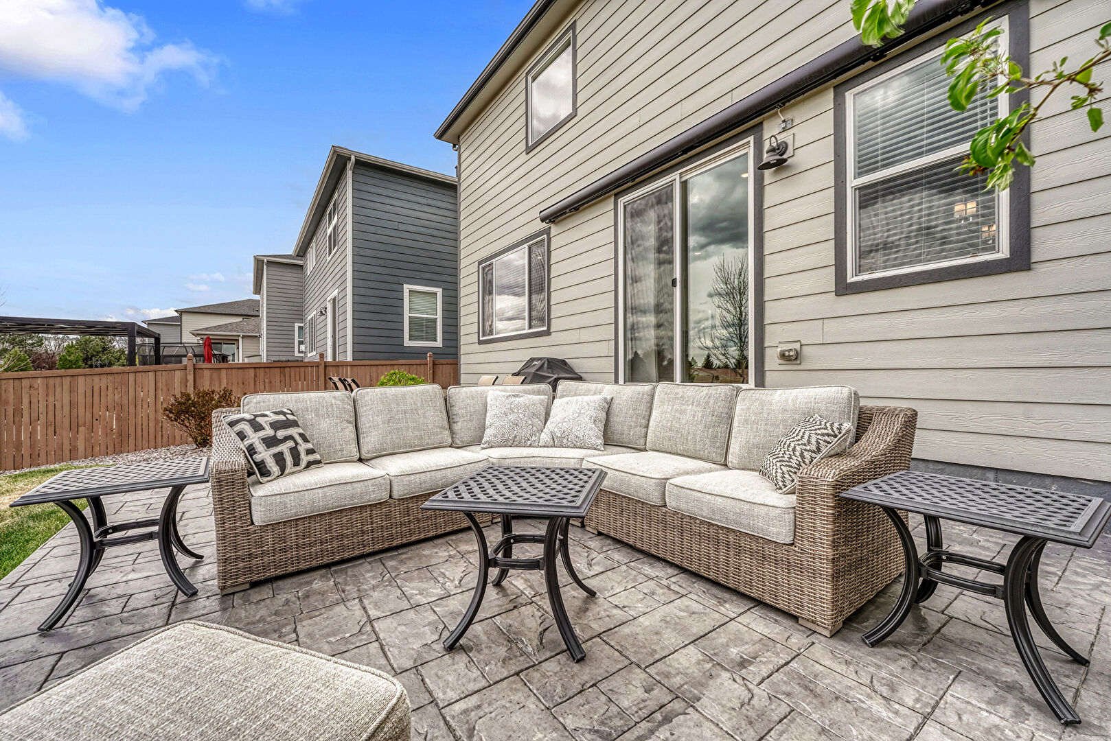 Awning, Concrete Foundation, Downspout, Fence, Grill, Gutters, Horizontal Siding, Lawn, Outdoor Dining Area, Outdoor Living Space, Patio, Fence, Lawn, Patio