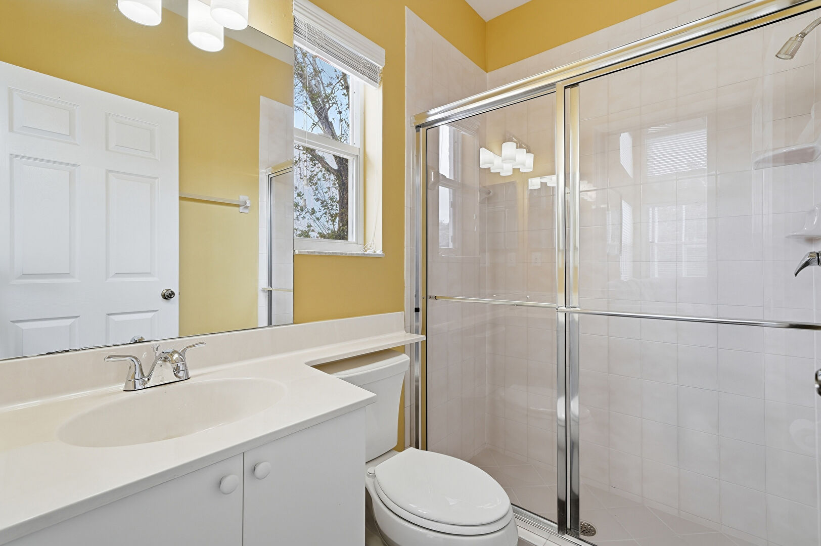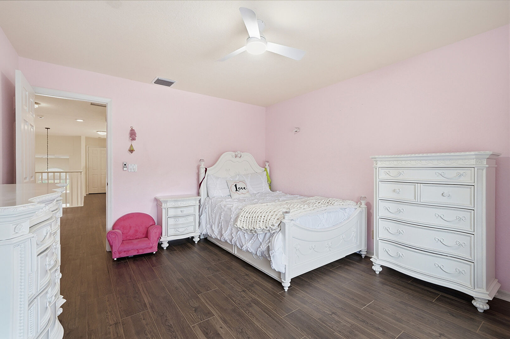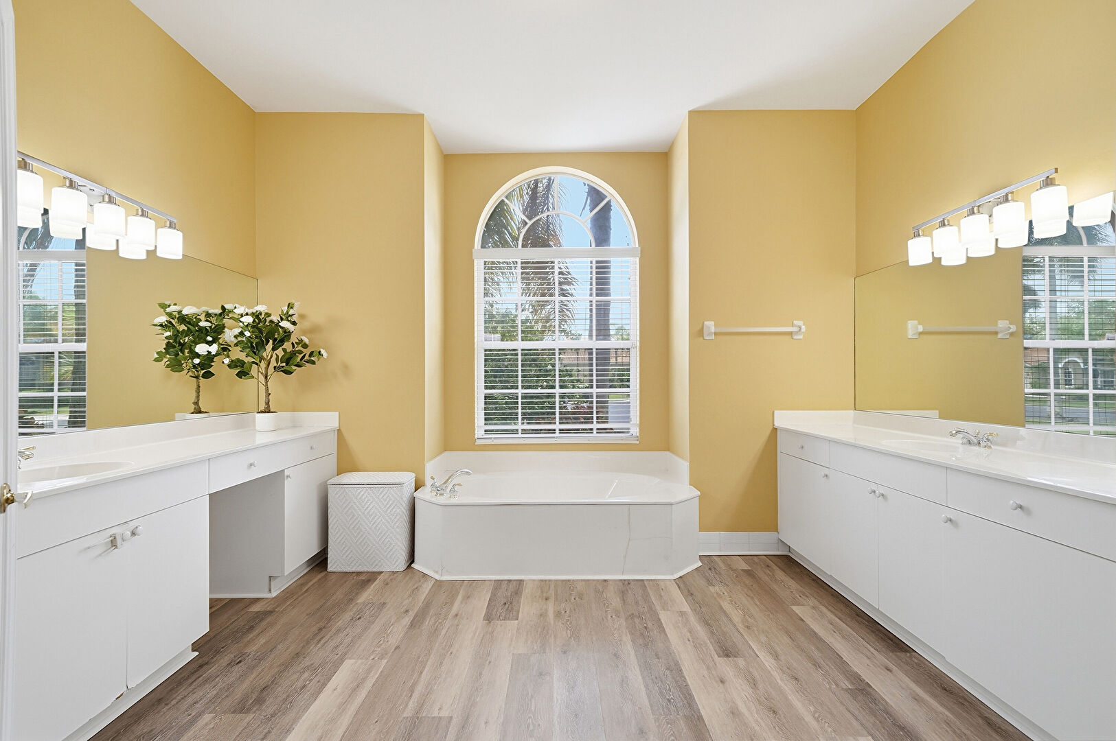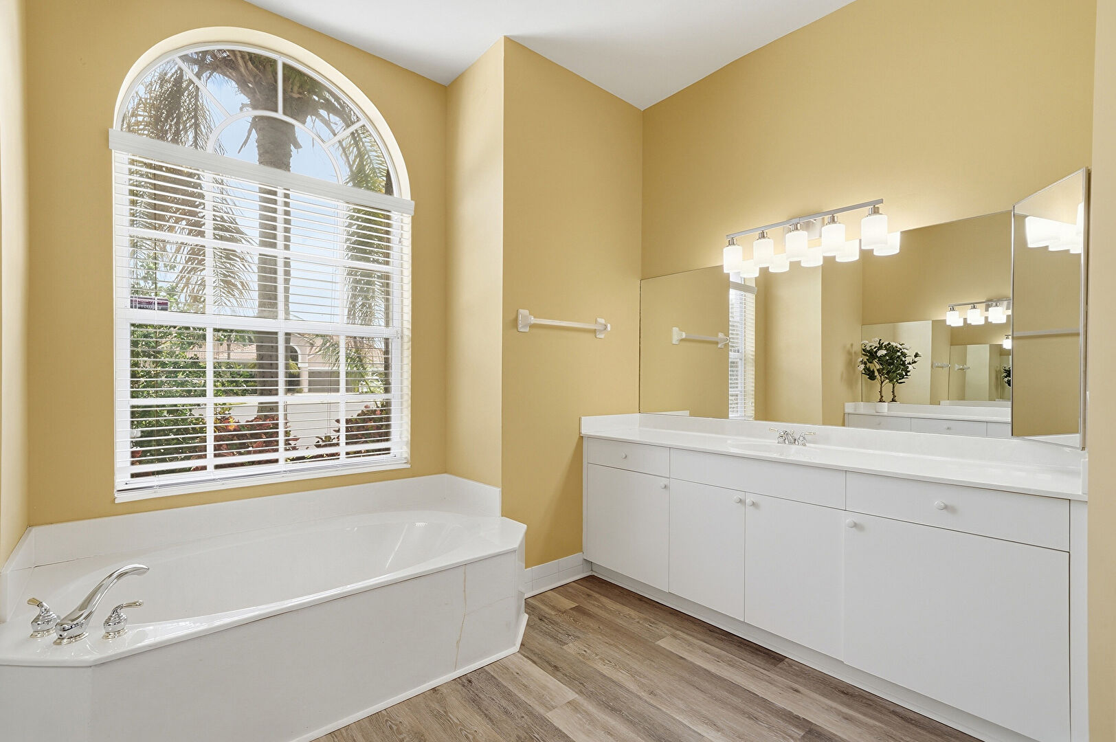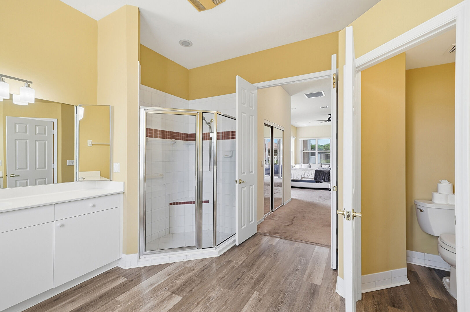 Baseboards Wall, Ceiling Fan, Drywall, Ensuite Bathroom, Full Bathroom, Natural Light, Two Single Vanities, Vanity, Vent, Water Closet, Wood Finish Floor, Natural Light, Vanity