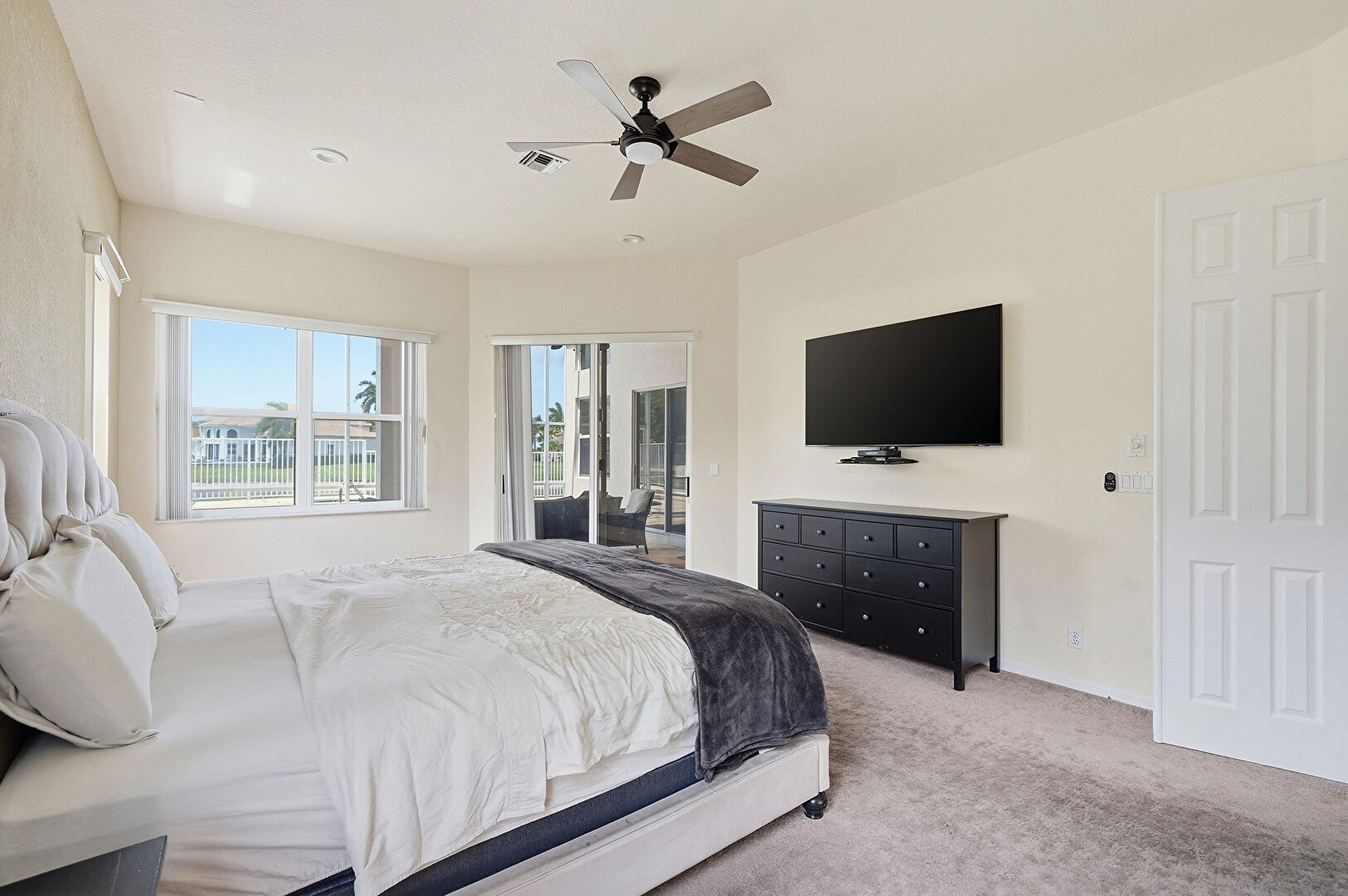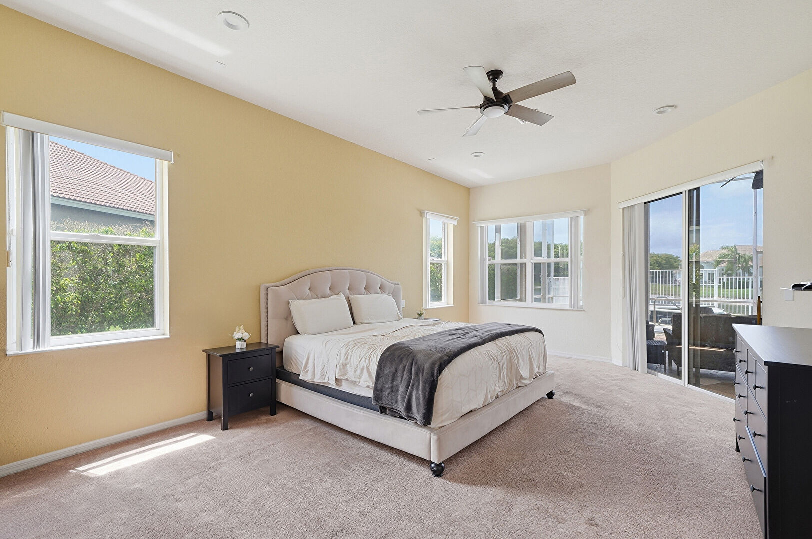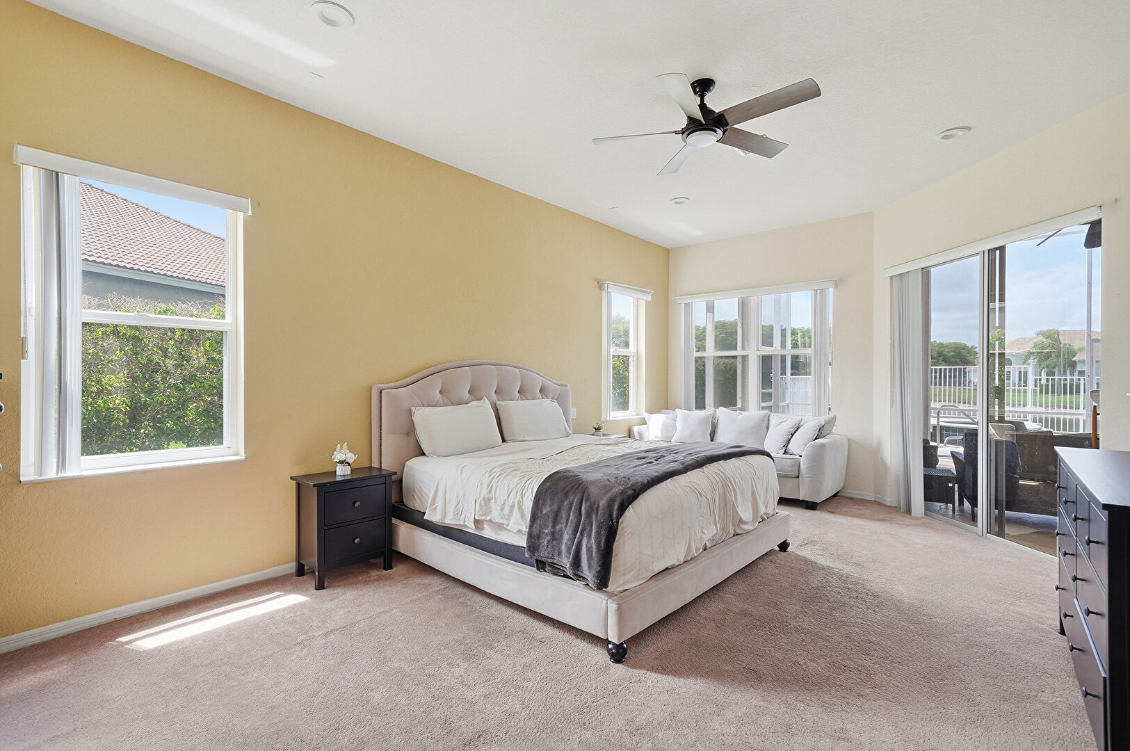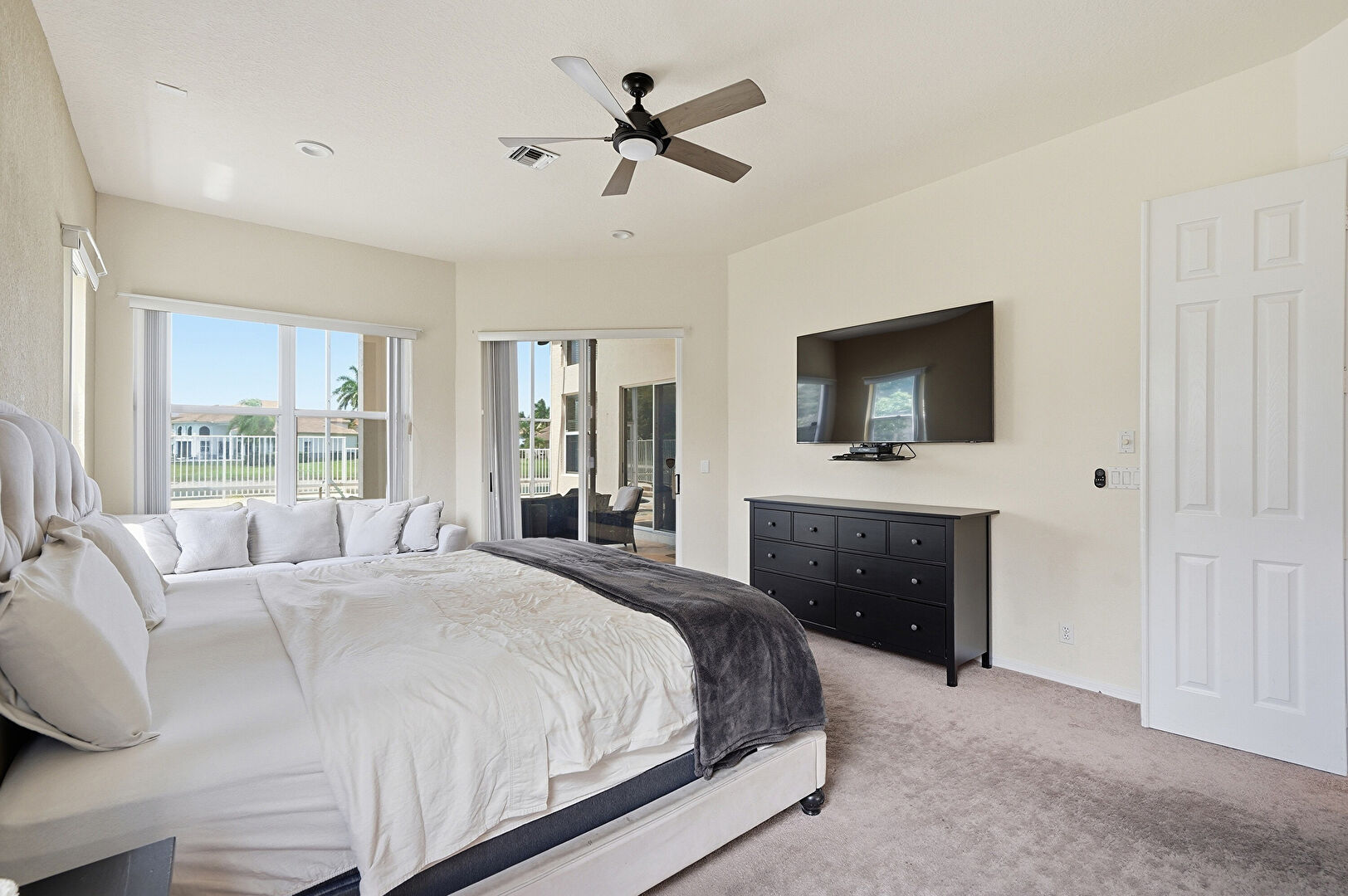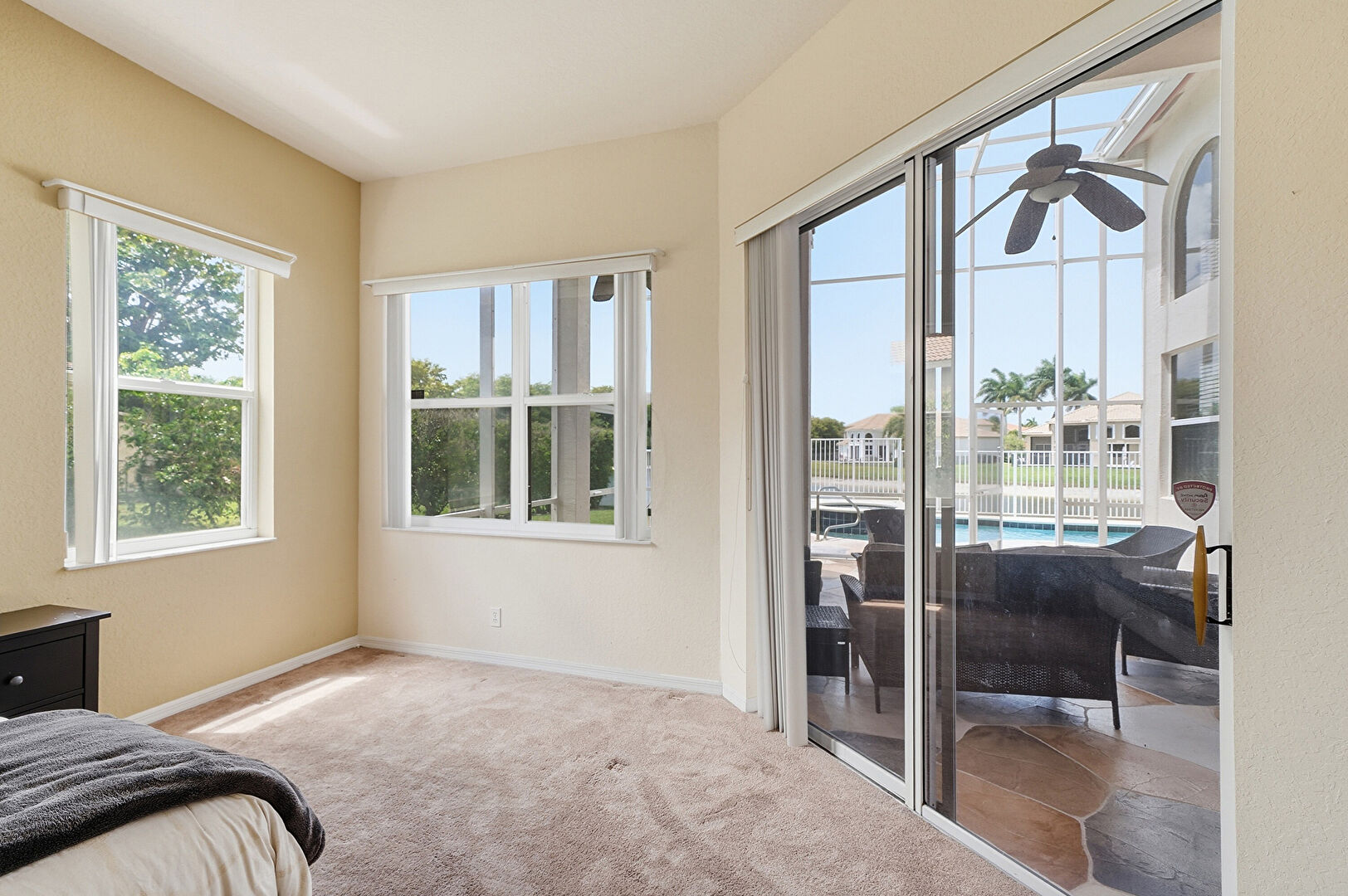 Access To Exterior, Baseboards Wall, Carpet, Ceiling Fan, Closet, Drywall, Ensuite Bathroom, Natural Light, Vent, Drywall, Pool View