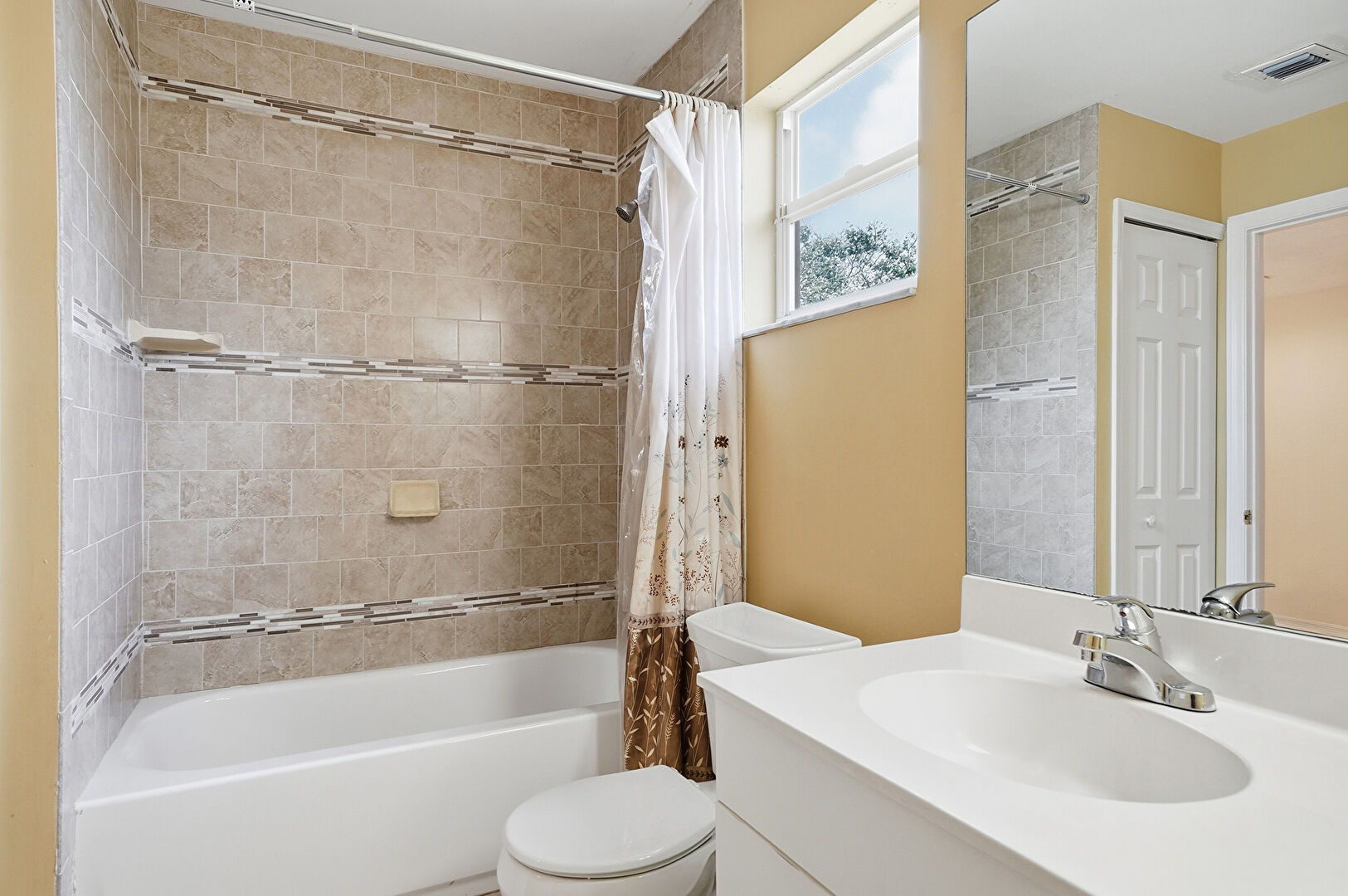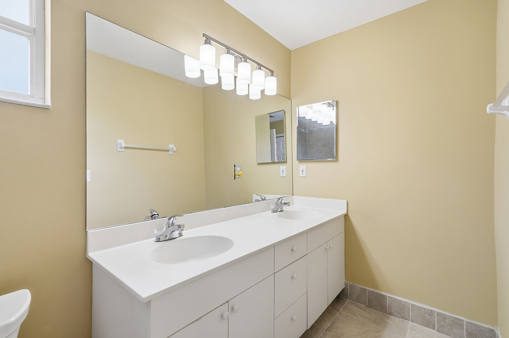 Baseboards Wall, Combined Bath Shower, Double Vanity, Drywall, Full Bathroom, Natural Light, Notable Chandelier, Tile Floor, Vent, Full Bathroom, Vanity