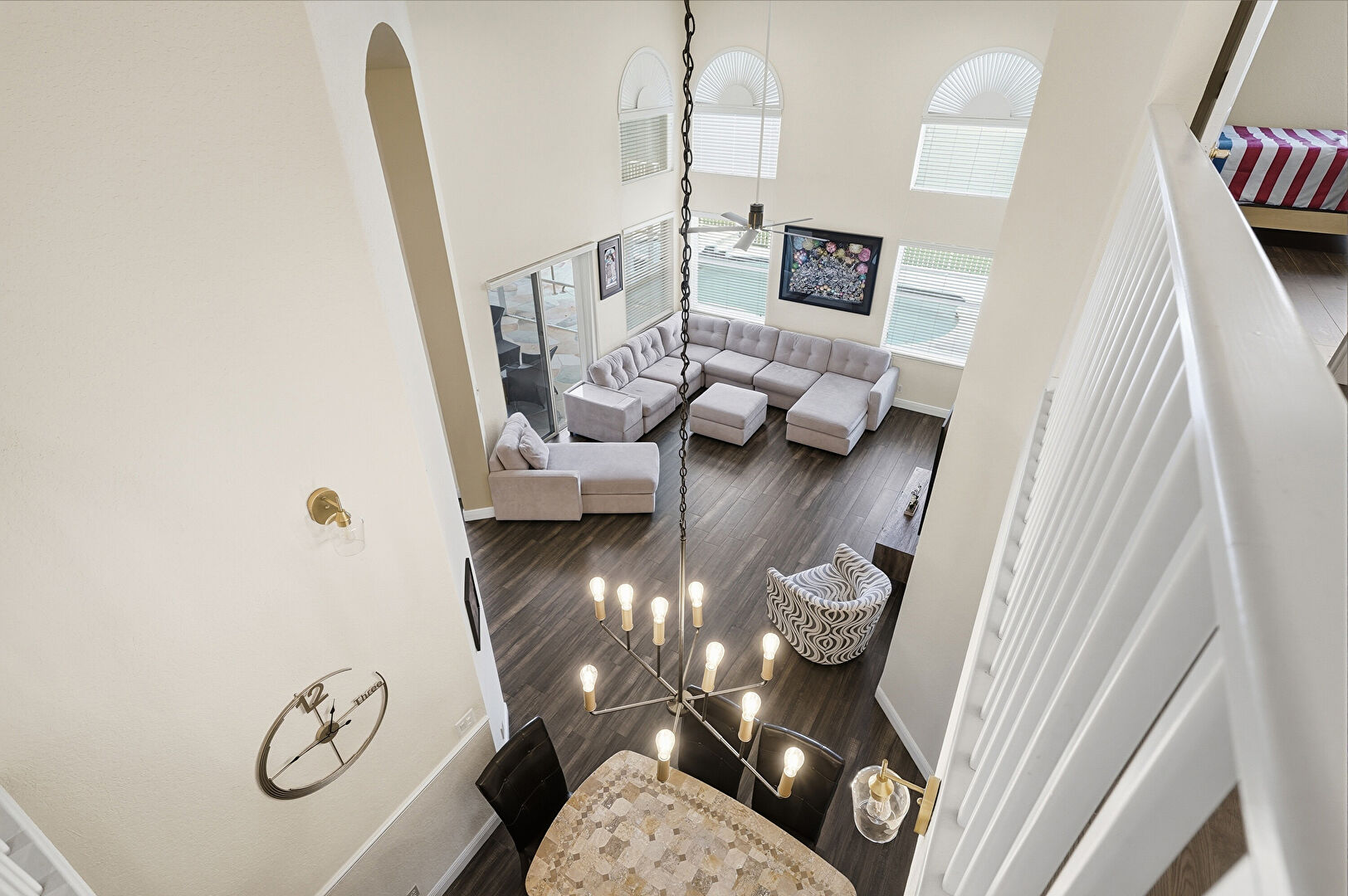 Baseboards Wall, Ceiling Fan, Drywall, High Ceiling, Natural Light, Notable Chandelier, Recessed Lighting, Stairs, Vent, Wood Finish Floor, Baseboards Wall, Drywall