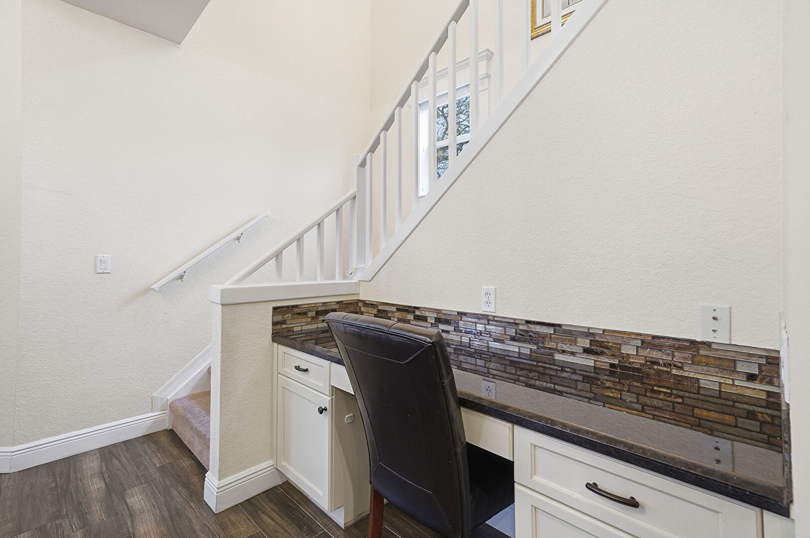 Baseboards Wall, Built In Desk, Natural Light, Textured Wall, Wood Finish Floor, Office Area