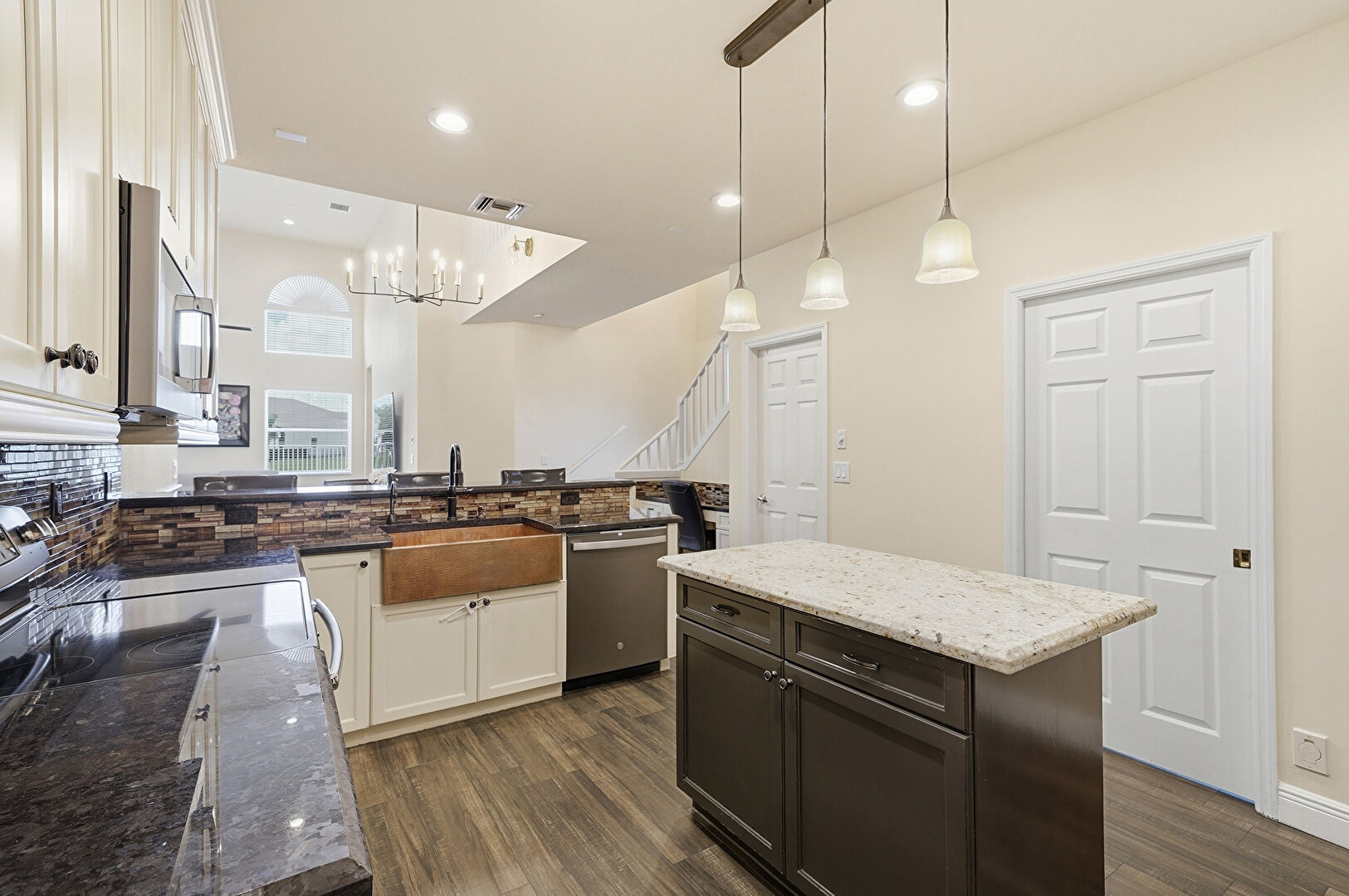 Arched Walkways, Baseboards Wall, Ceiling Fan, Cream Cabinets, Crown Molding, Crown Molding Cabinets, Dark Brown Cabinets, Drywall, Kitchen Island, Kitchen Peninsula, Natural Light, Notable Chandelier, Opens To Living Area, Pendant Lighting, Recessed Lighting, Shaker Cabinets, Stone Countertops, Vent, Wood Finish Floor, Crown Molding Cabinets, Natural Light, Shaker Cabinets, Stone Countertops