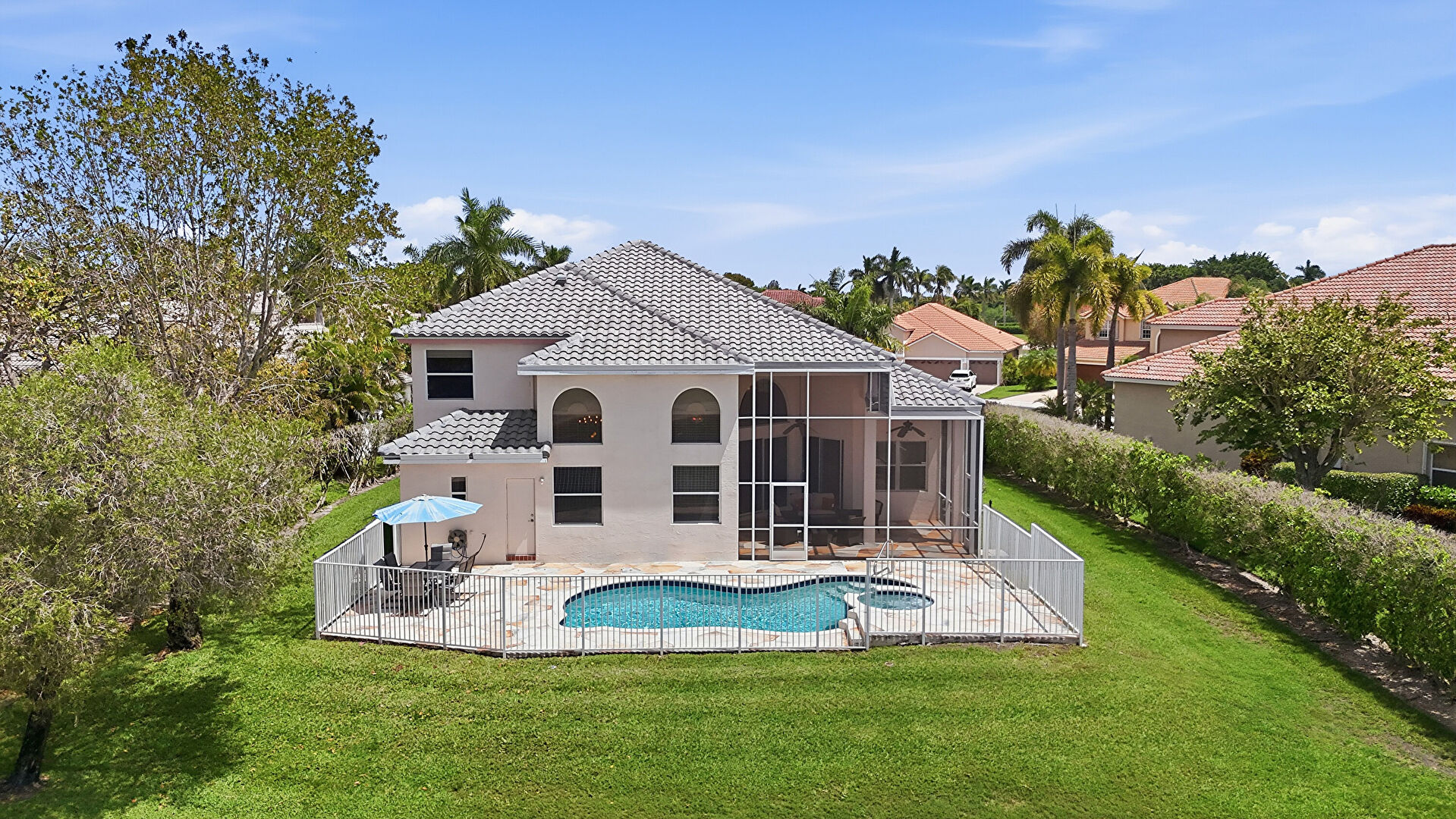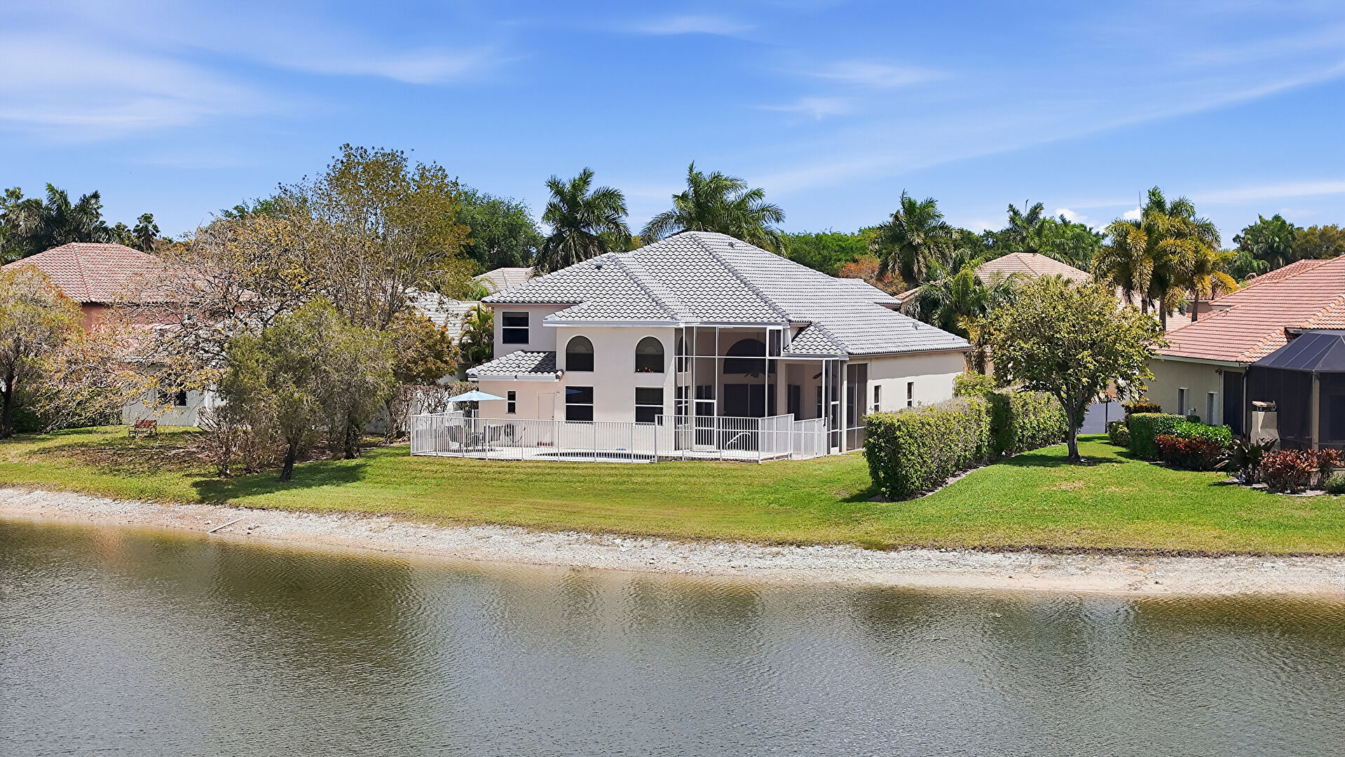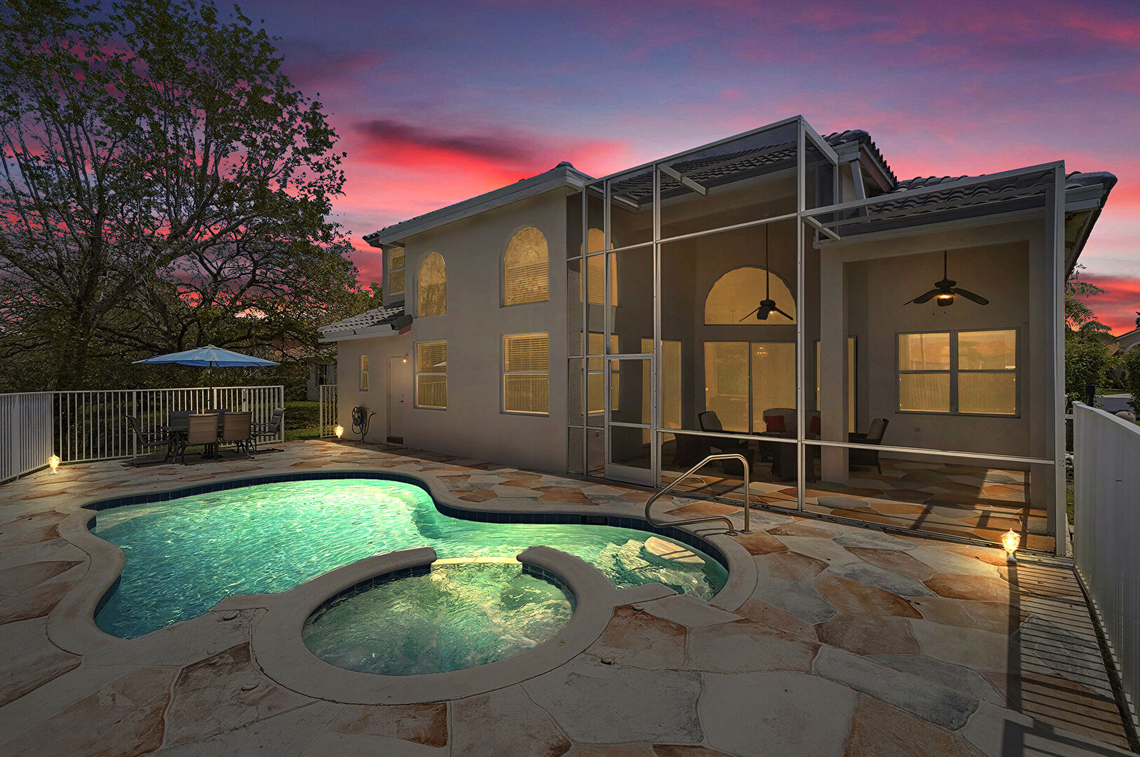 Balcony, Ceiling Fan, Fence, Handrail, Hot Tub, Lanai, Lawn, Outdoor Dining Area, Patio, Pool, Pool Hot Tub Combo, Stucco Siding, Sunroom, Tile Roof, Water View, Waterfront, Handrail, Patio, Sunroom, Tile Roof