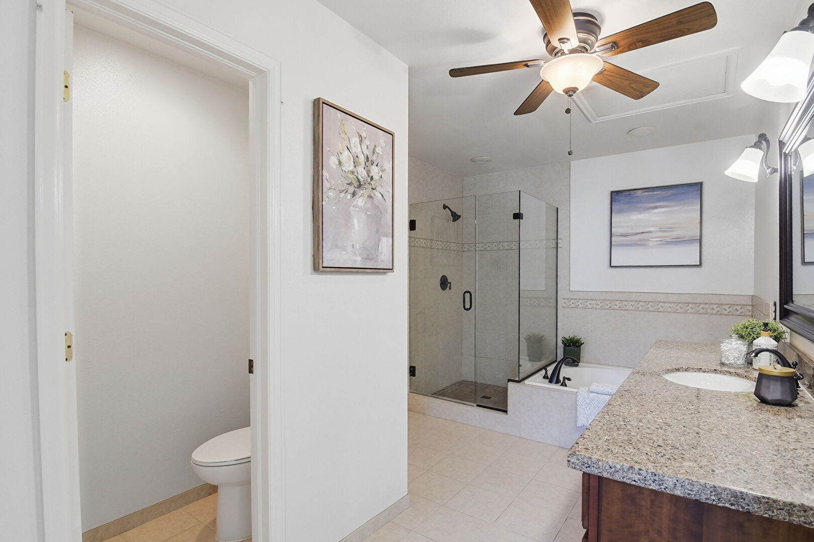 Ceiling Fan, Drywall, Full Bathroom, Tile Floor, Vanity, Water Closet, Drywall, Full Bathroom