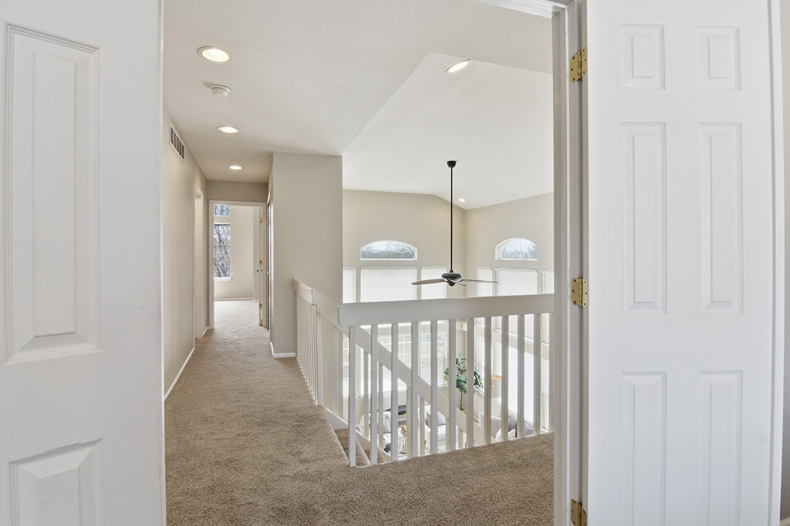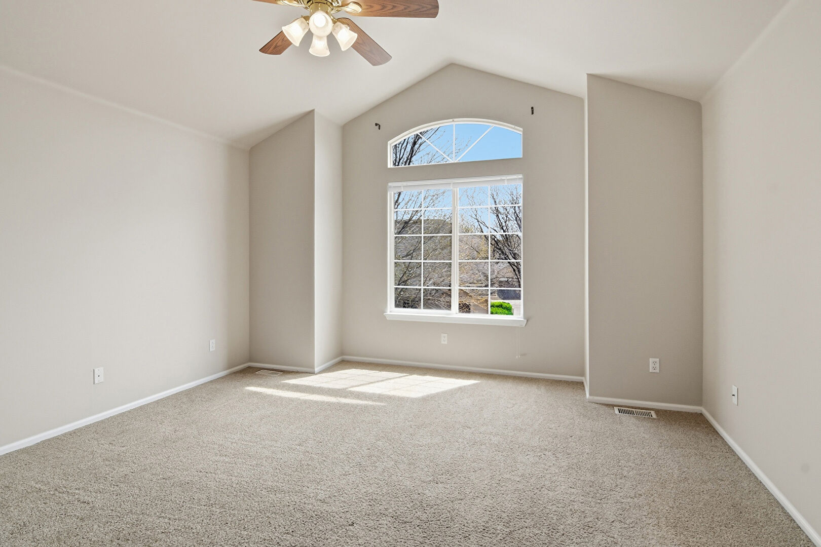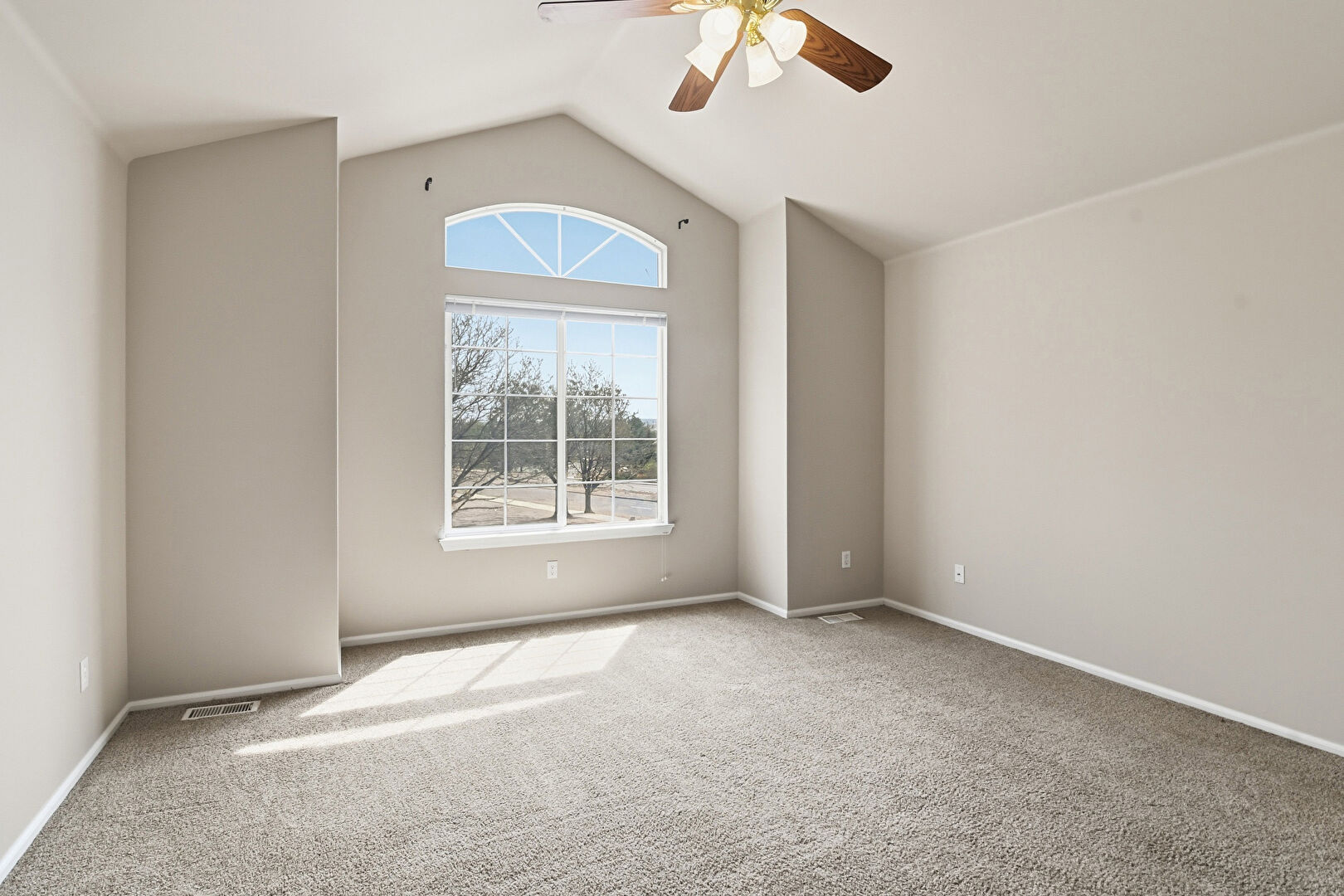 Arched Walkways, Baseboards Wall, Carpet, Cathedral Ceiling, Ceiling Fan, Drywall, Natural Light, Vaulted Ceiling, Vent, Baseboards Wall, Vent