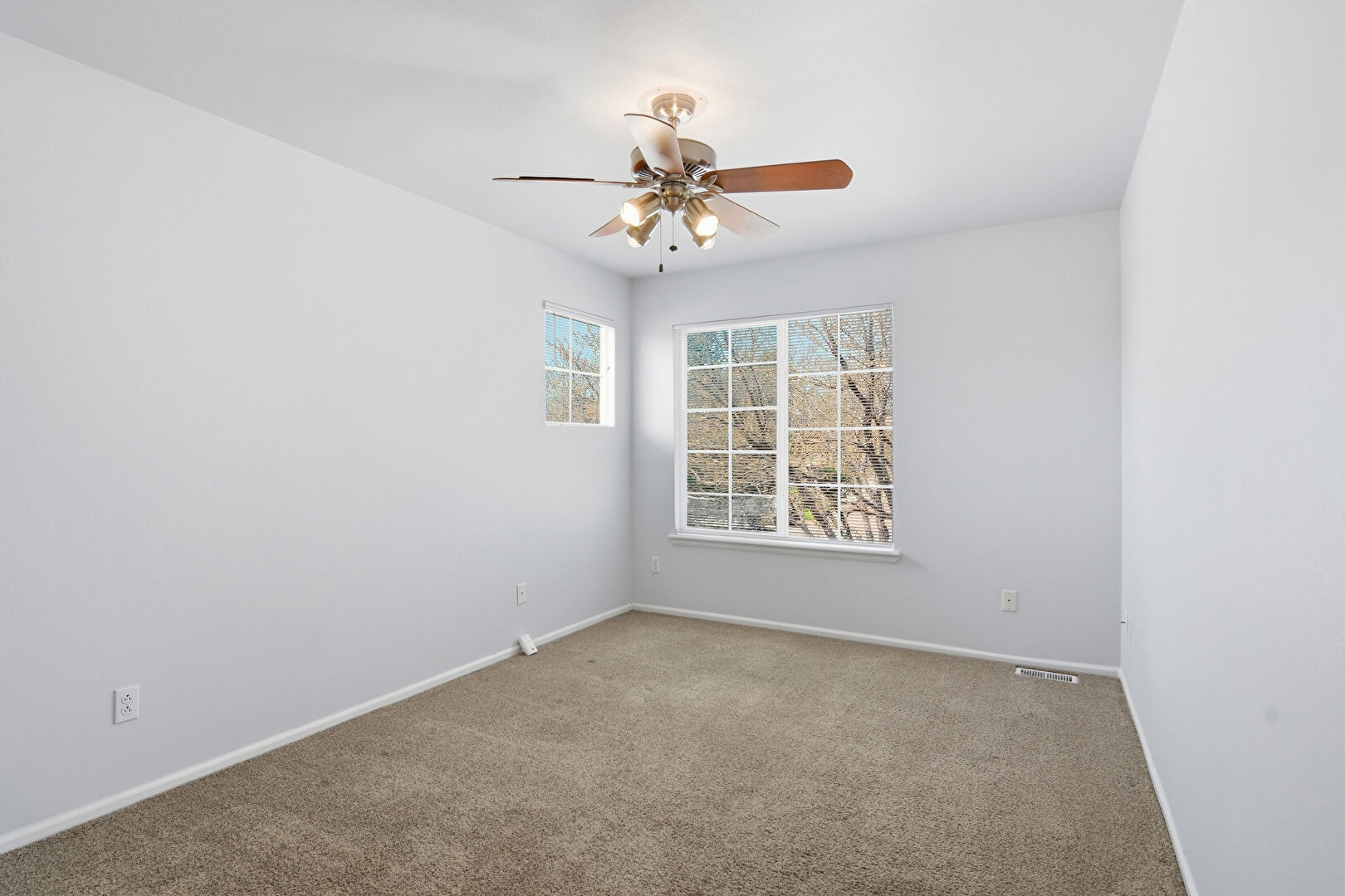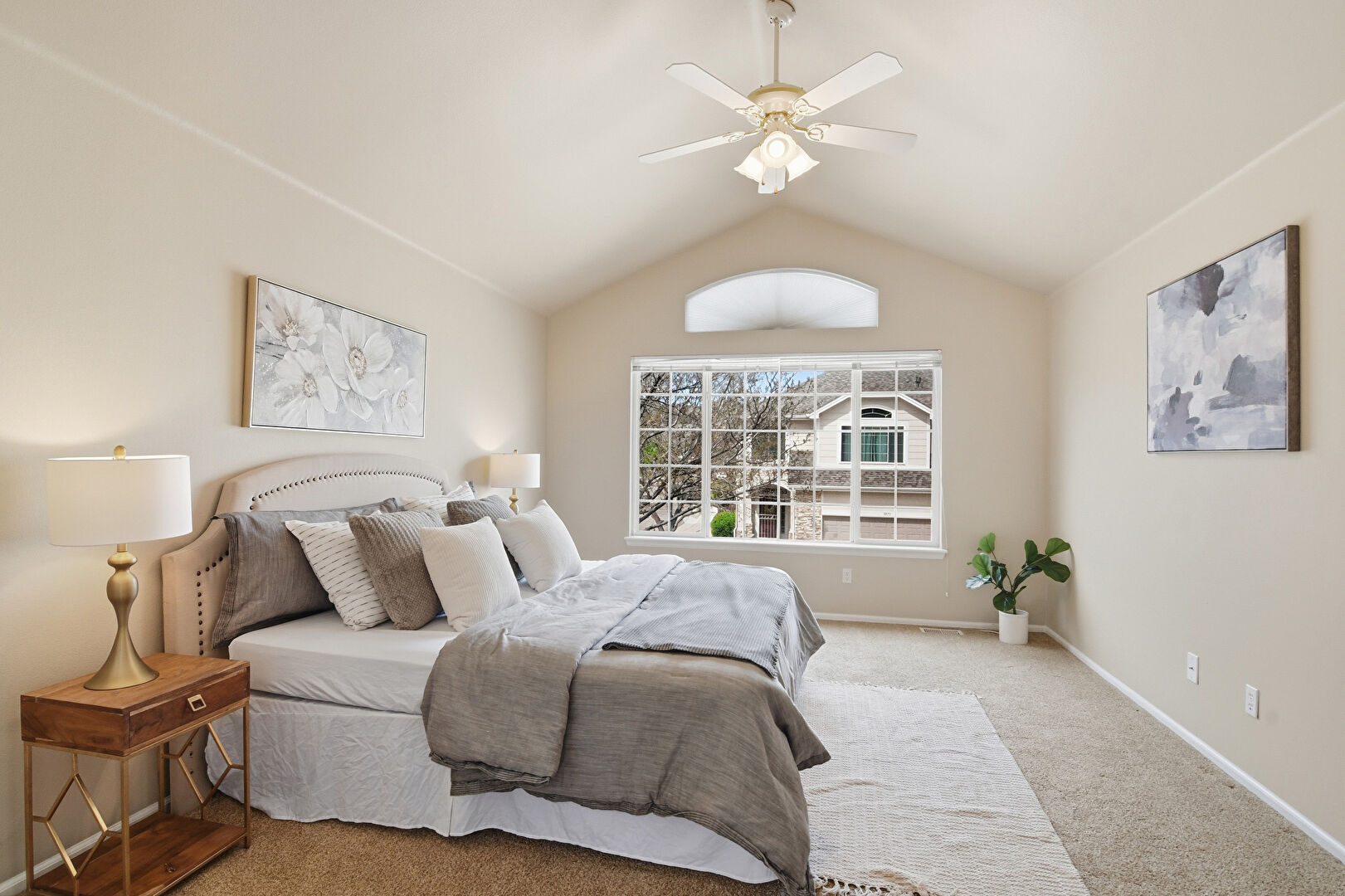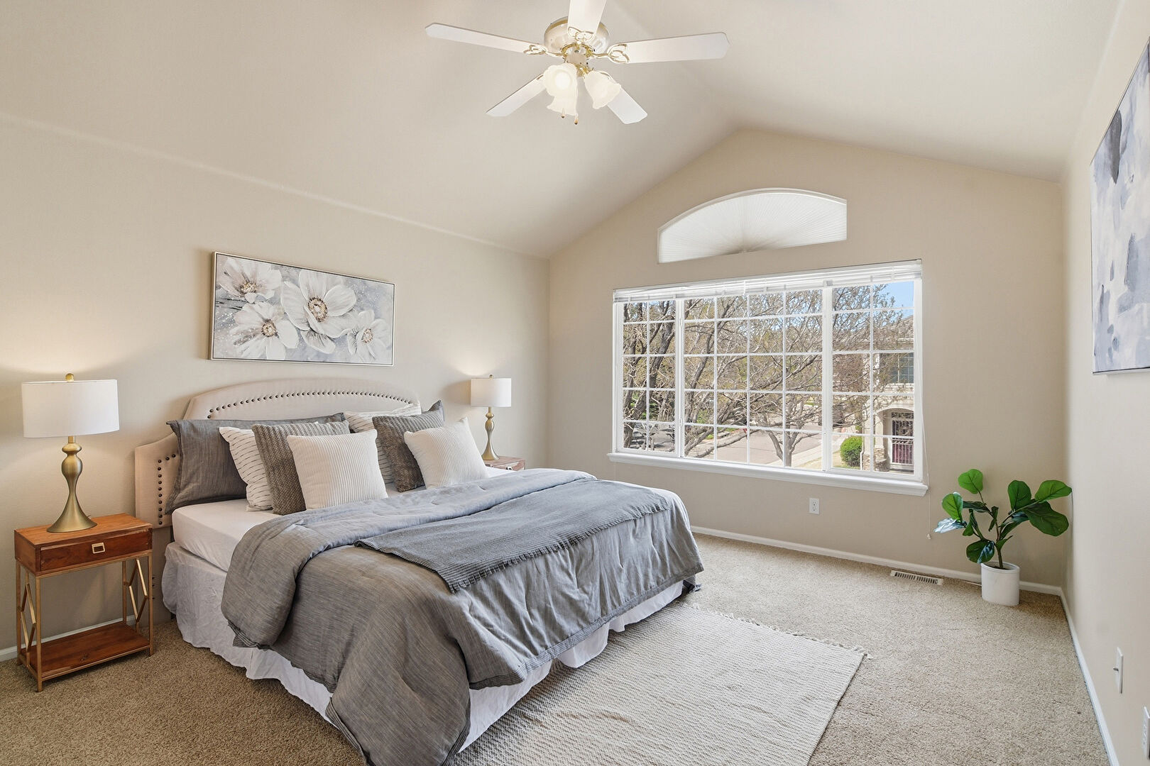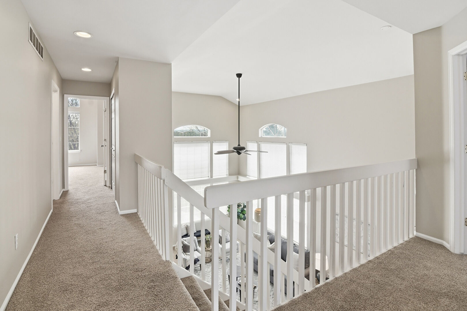 Arched Walkways, Baseboards Wall, Carpet, Cathedral Ceiling, Ceiling Fan, Drywall, Natural Light, Vaulted Ceiling, Vent, Baseboards Wall, Vent