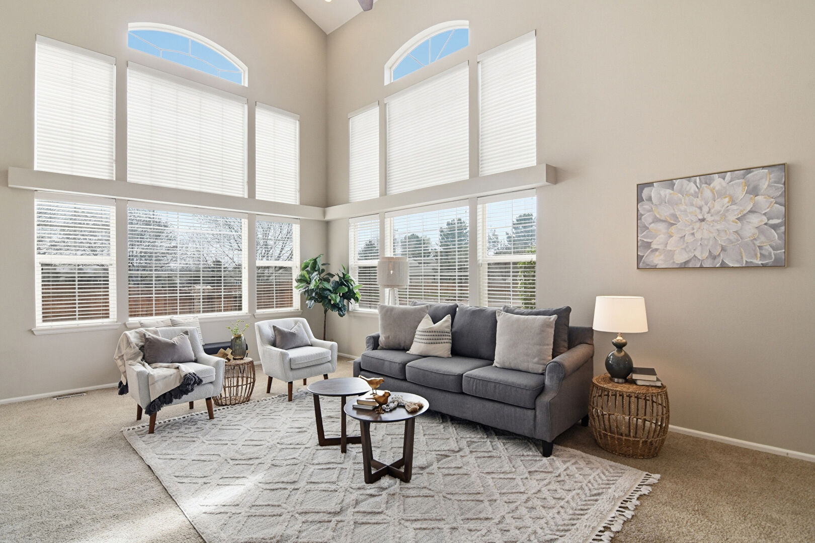 Baseboards Wall, Carpet, Ceiling Fan, Drywall, Fireplace, High Ceiling, Natural Light, Recessed Lighting, Smoke Carbon Monoxide Detector, Stairs, Vaulted Ceiling, Vent, Baseboards Wall, Carpet, Ceiling Fan, High Ceiling