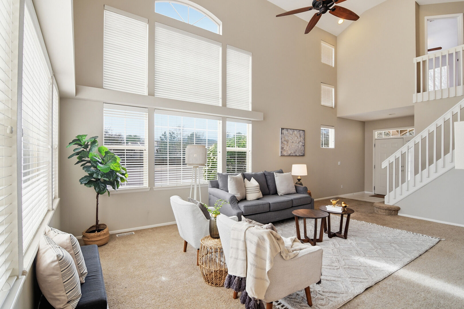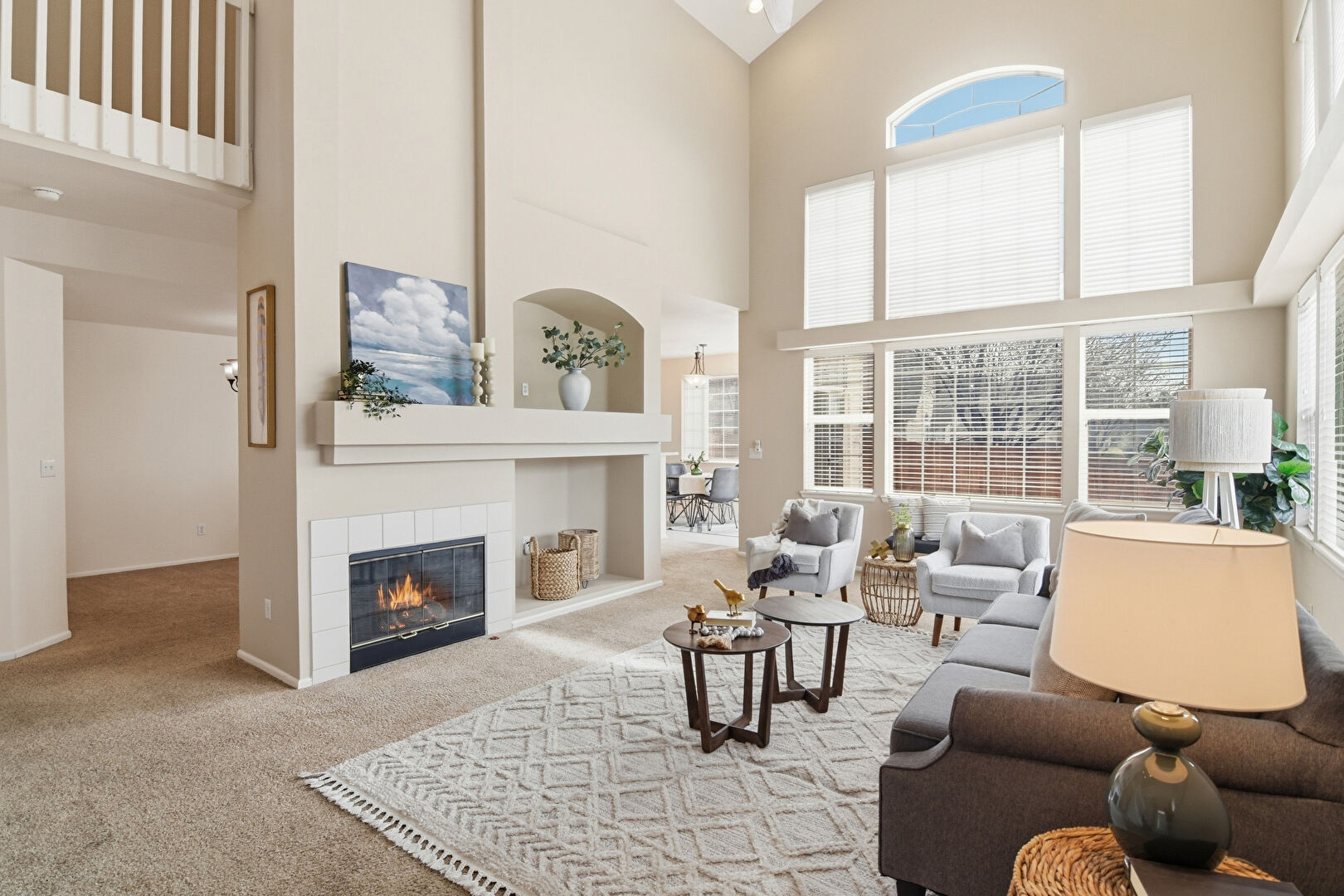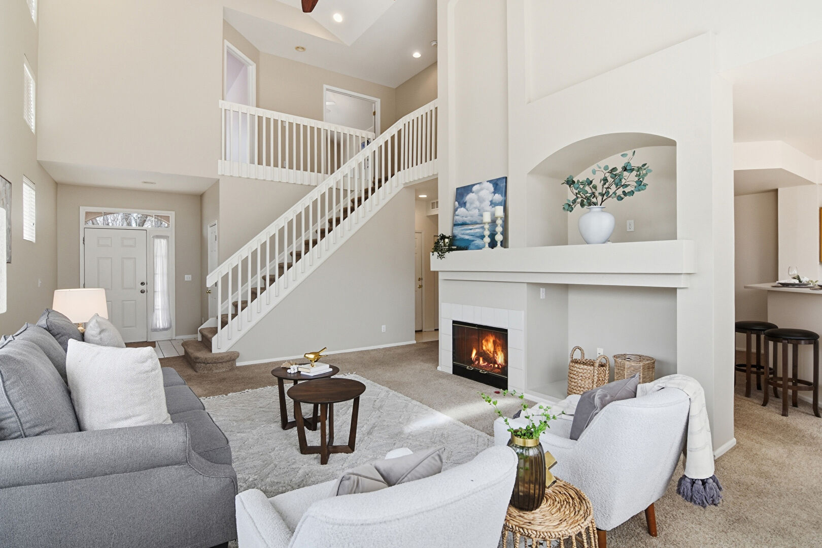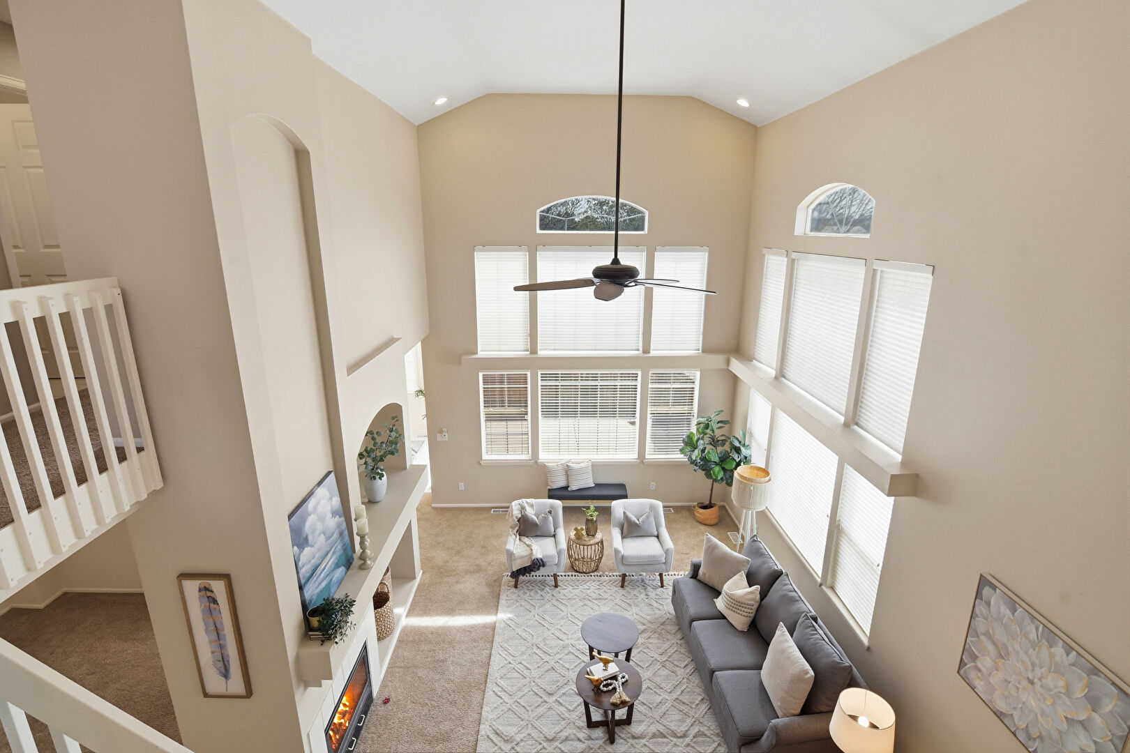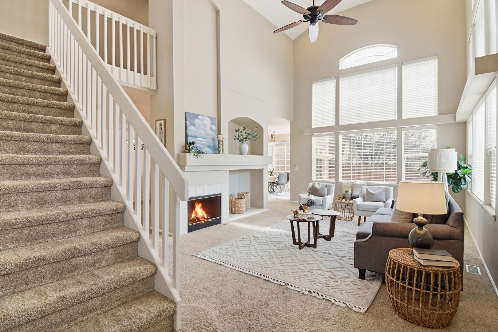 Baseboards Wall, Carpet, Ceiling Fan, Drywall, Fireplace, High Ceiling, Recessed Lighting, Stairs, Vaulted Ceiling, Natural Light