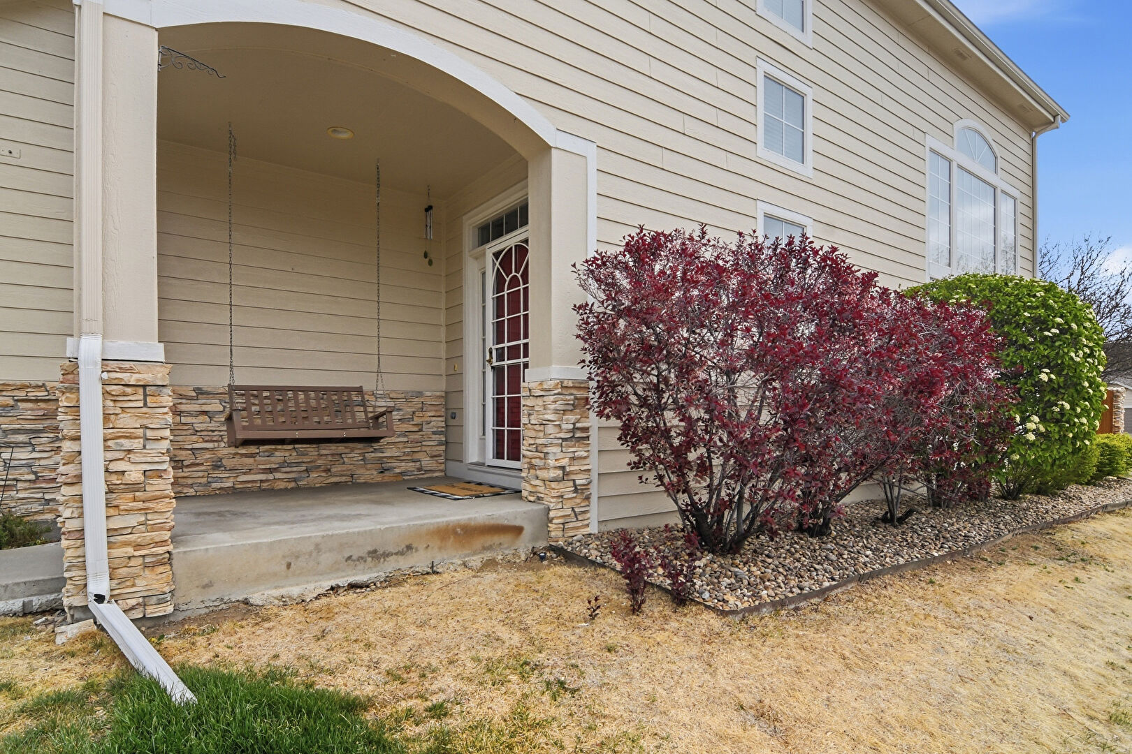 Downspout, Gutters, Horizontal Siding, Porch, Stone Siding, Horizontal Siding, Porch