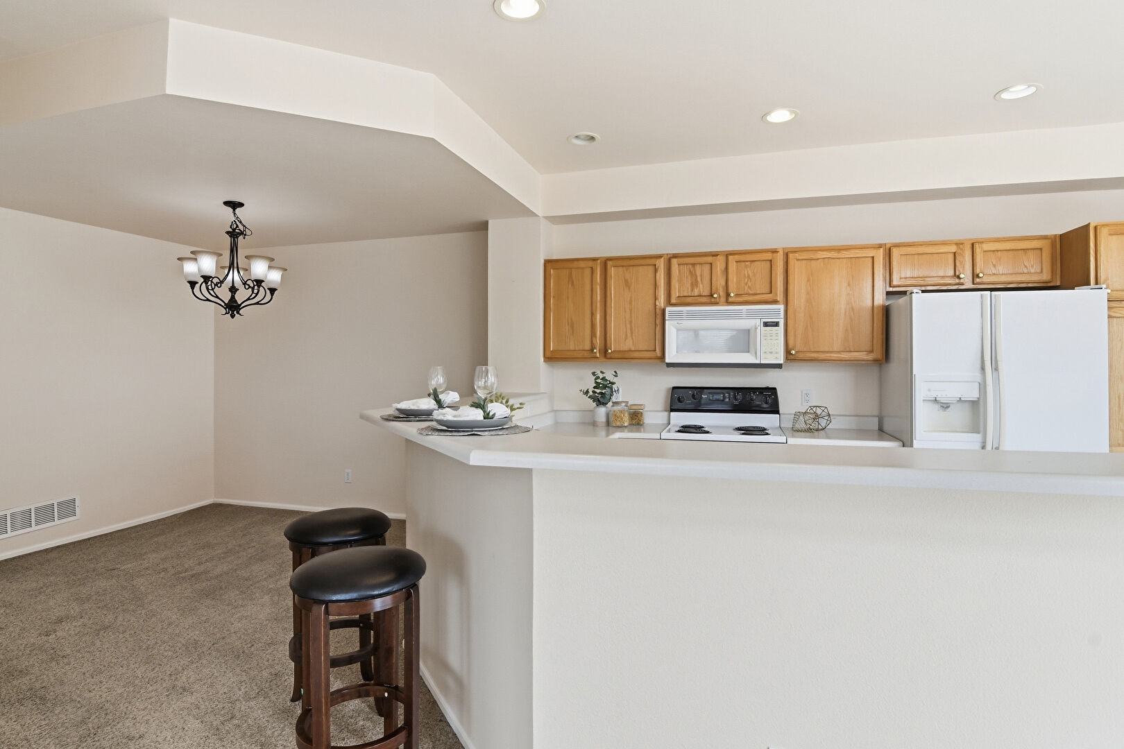 Baseboards Wall, Carpet, Drywall, Kitchen Bar, Kitchen Peninsula, Medium Brown Cabinets, Notable Chandelier, Pendant Lighting, Recessed Lighting, Shaker Cabinets, Vent