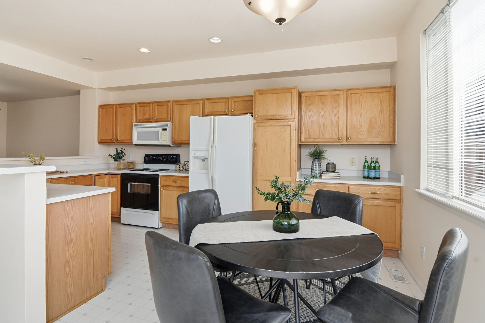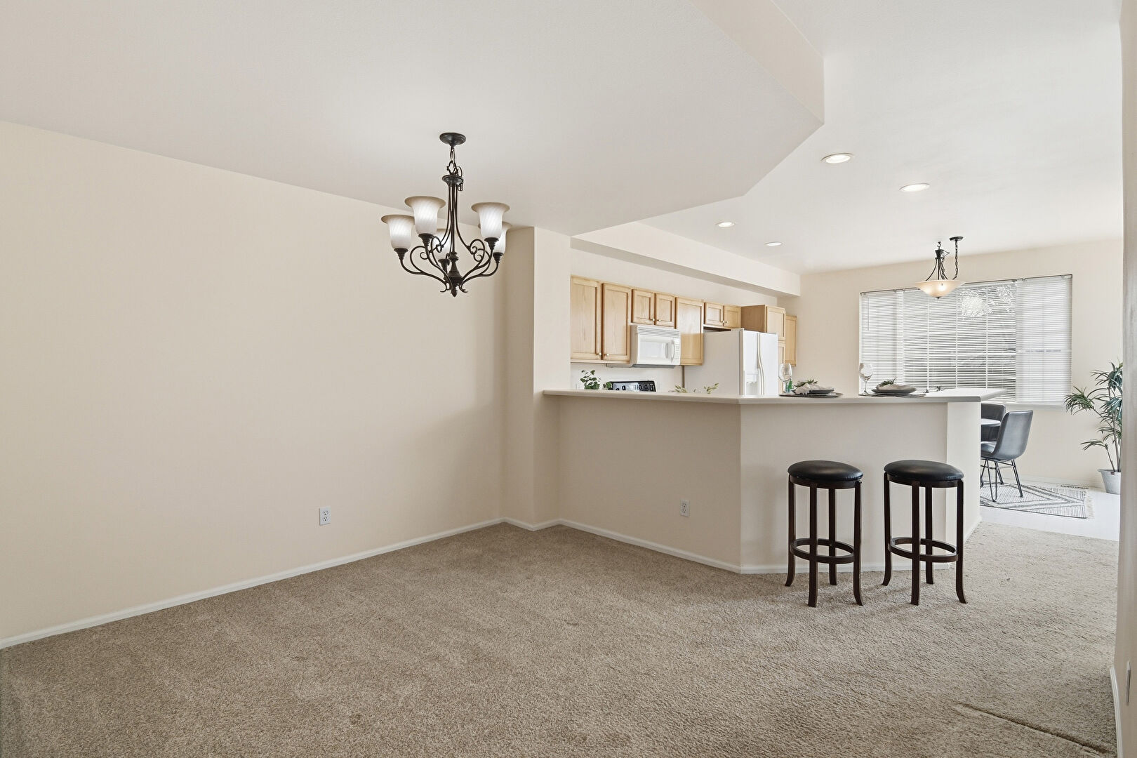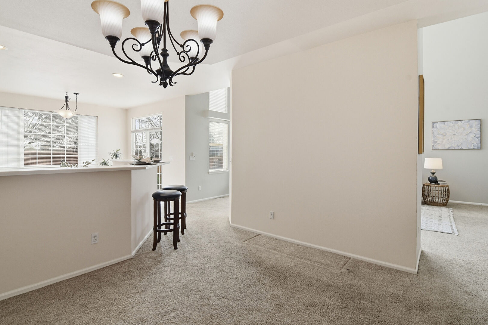 Baseboards Wall, Carpet, Drywall, Kitchen Bar, Kitchen Peninsula, Natural Light, Notable Chandelier, Pendant Lighting, Recessed Lighting, Shaker Cabinets, Vinyl Floor, Carpet, Drywall, Natural Light, Vent