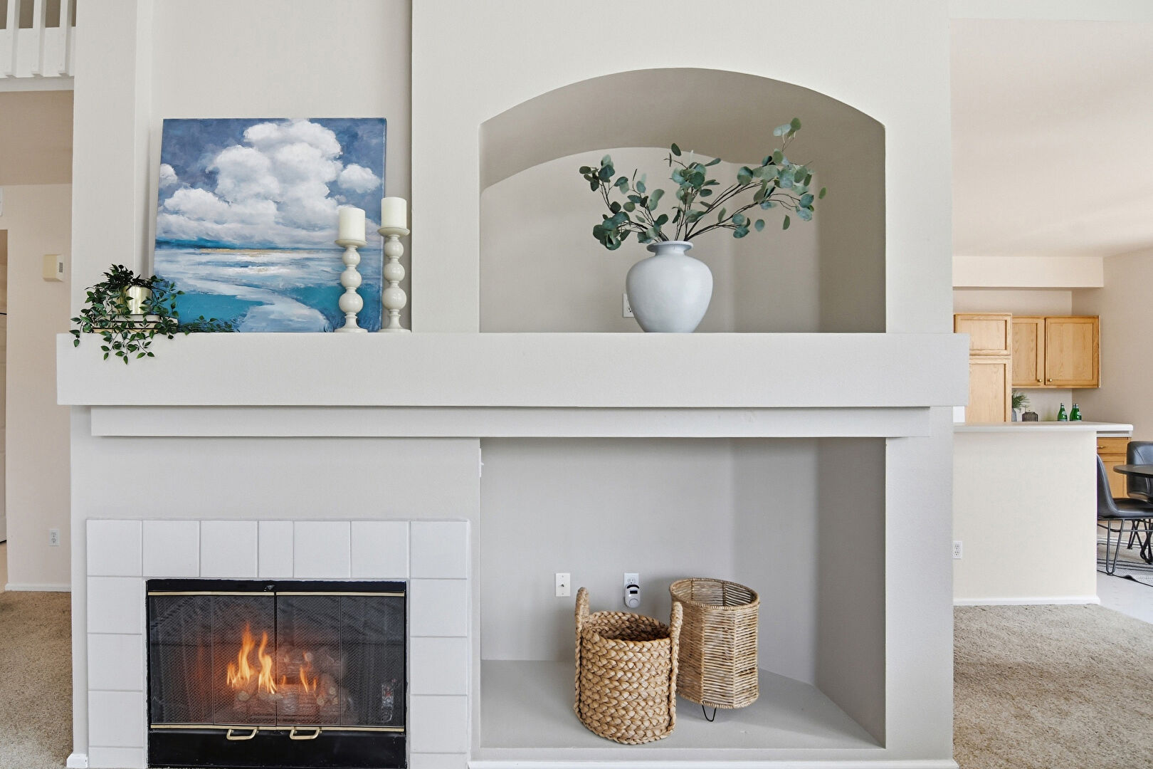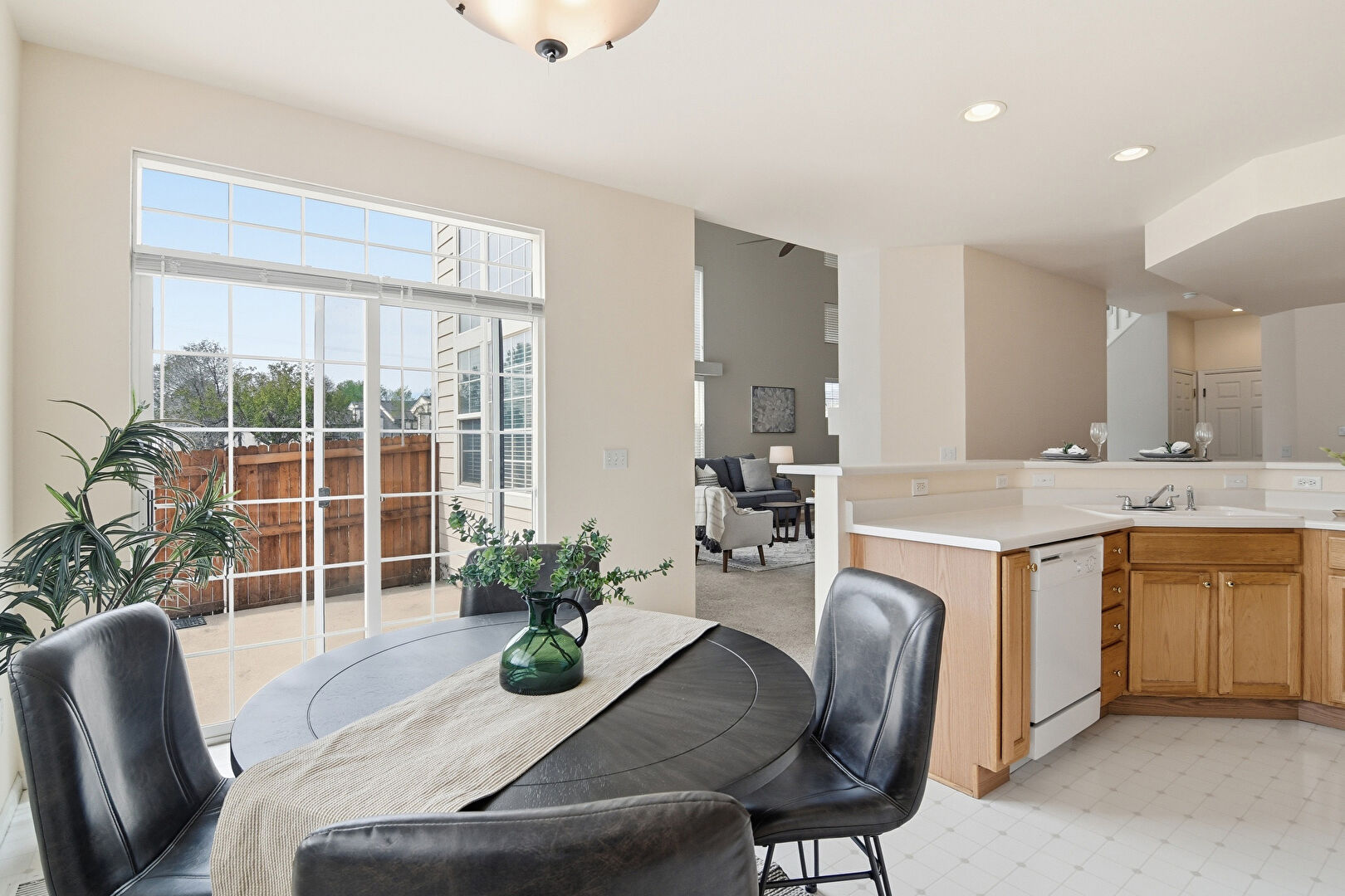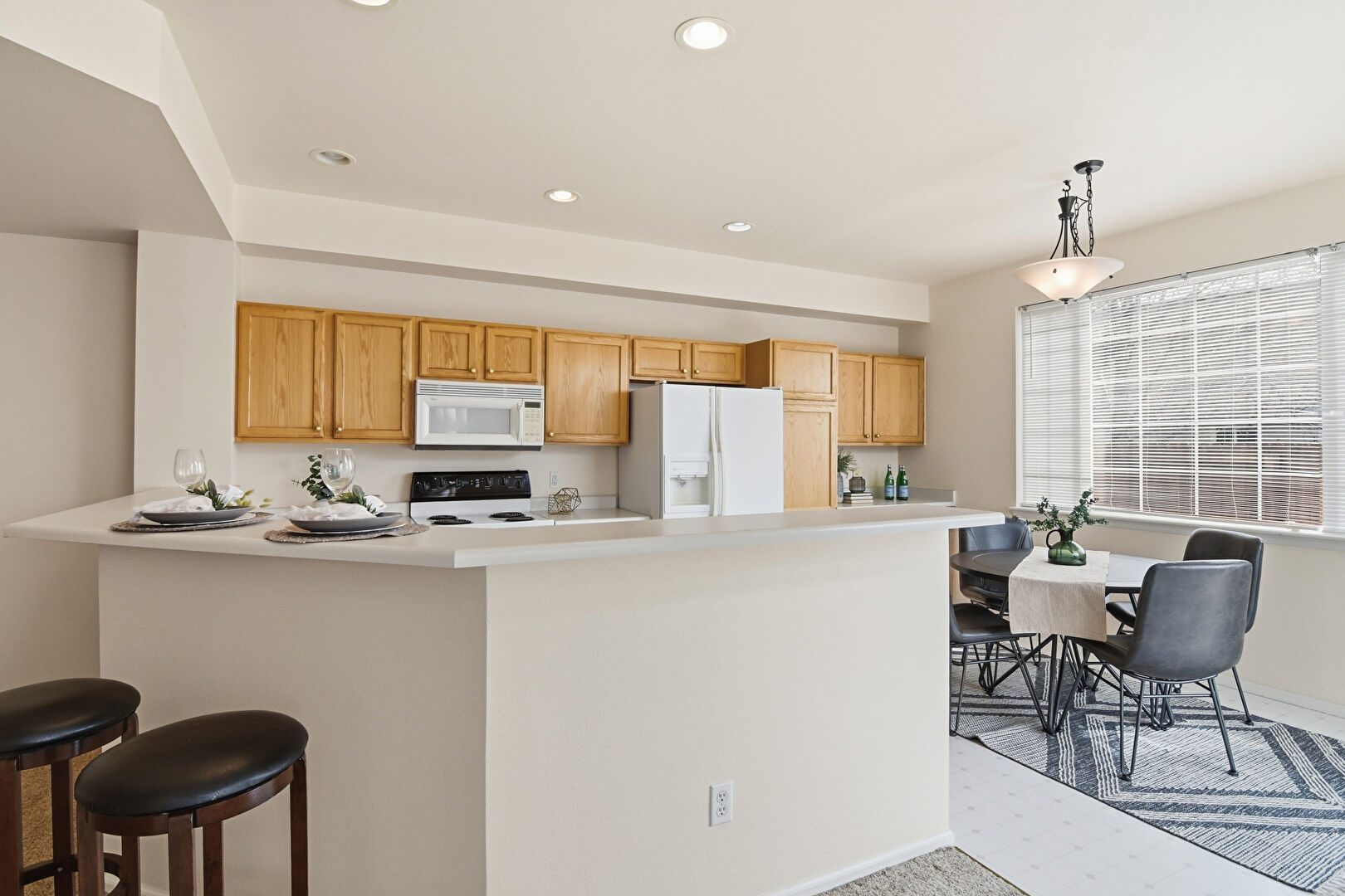 Baseboards Wall, Carpet, Drywall, Kitchen Bar, Kitchen Peninsula, Natural Light, Notable Chandelier, Pendant Lighting, Recessed Lighting, Shaker Cabinets, Vinyl Floor, Carpet, Drywall, Natural Light, Vent