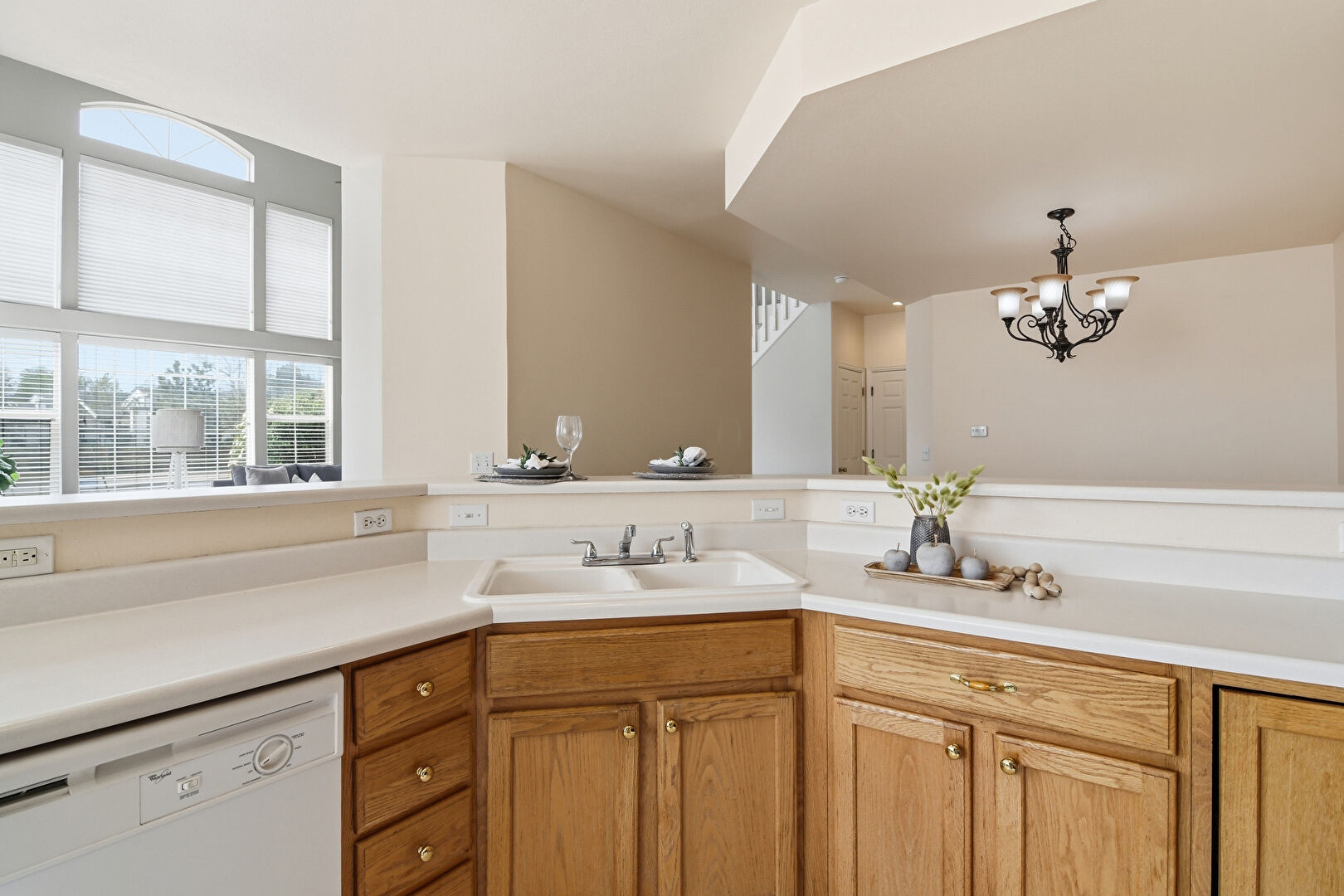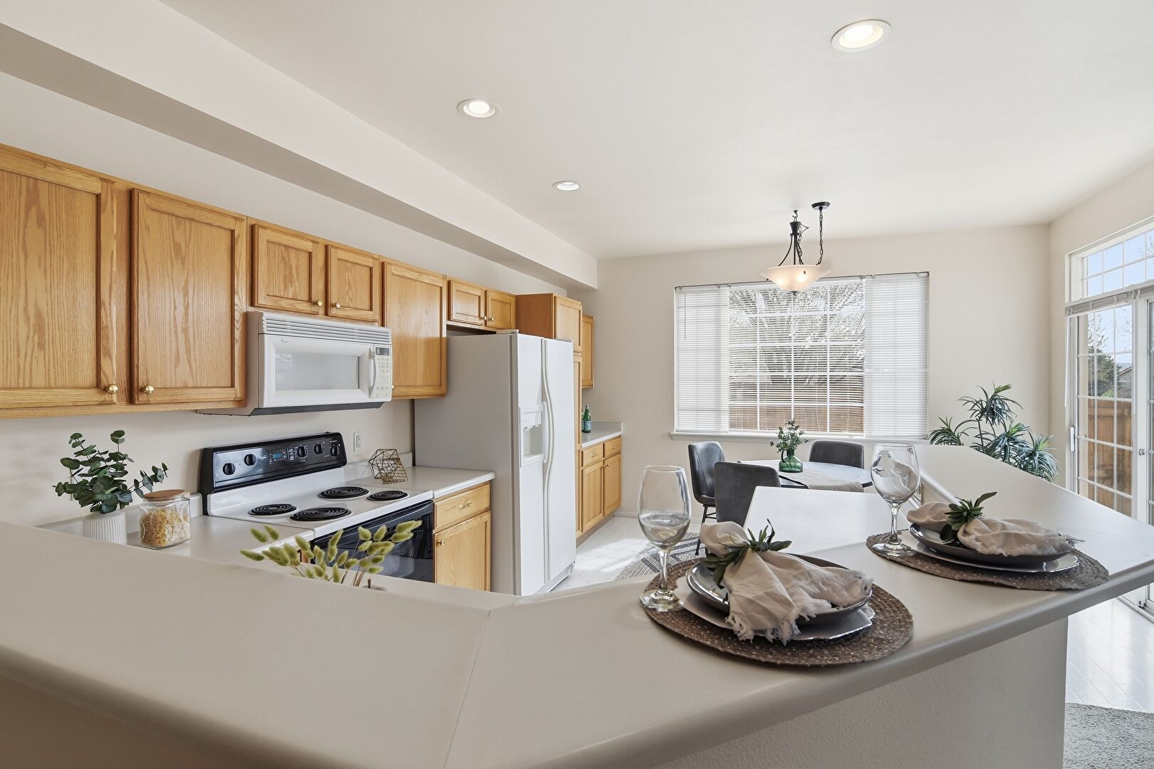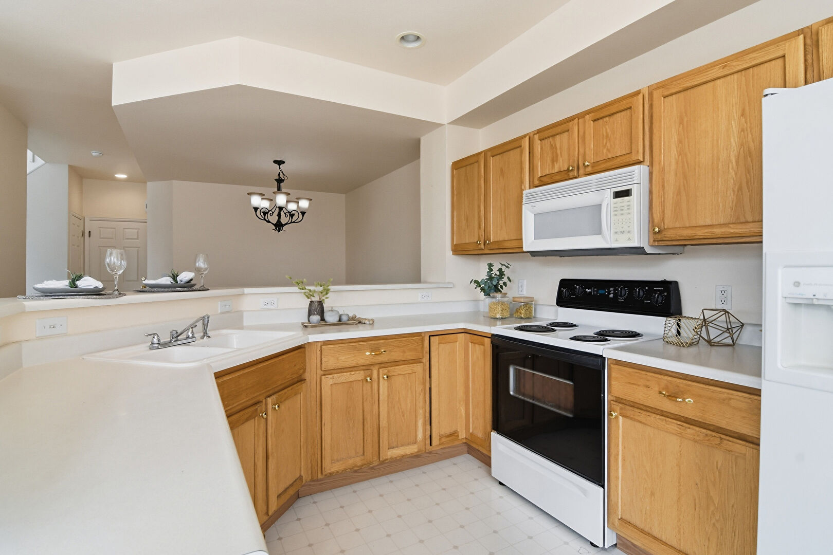 Baseboards Wall, Drywall, Kitchen Bar, Kitchen Peninsula, Medium Brown Cabinets, Natural Light, Notable Chandelier, Pendant Lighting, Recessed Lighting, Shaker Cabinets, U Shaped Kitchen, Vent, Vinyl Floor, Drywall, Pendant Lighting, Recessed Lighting, Vinyl Floor
