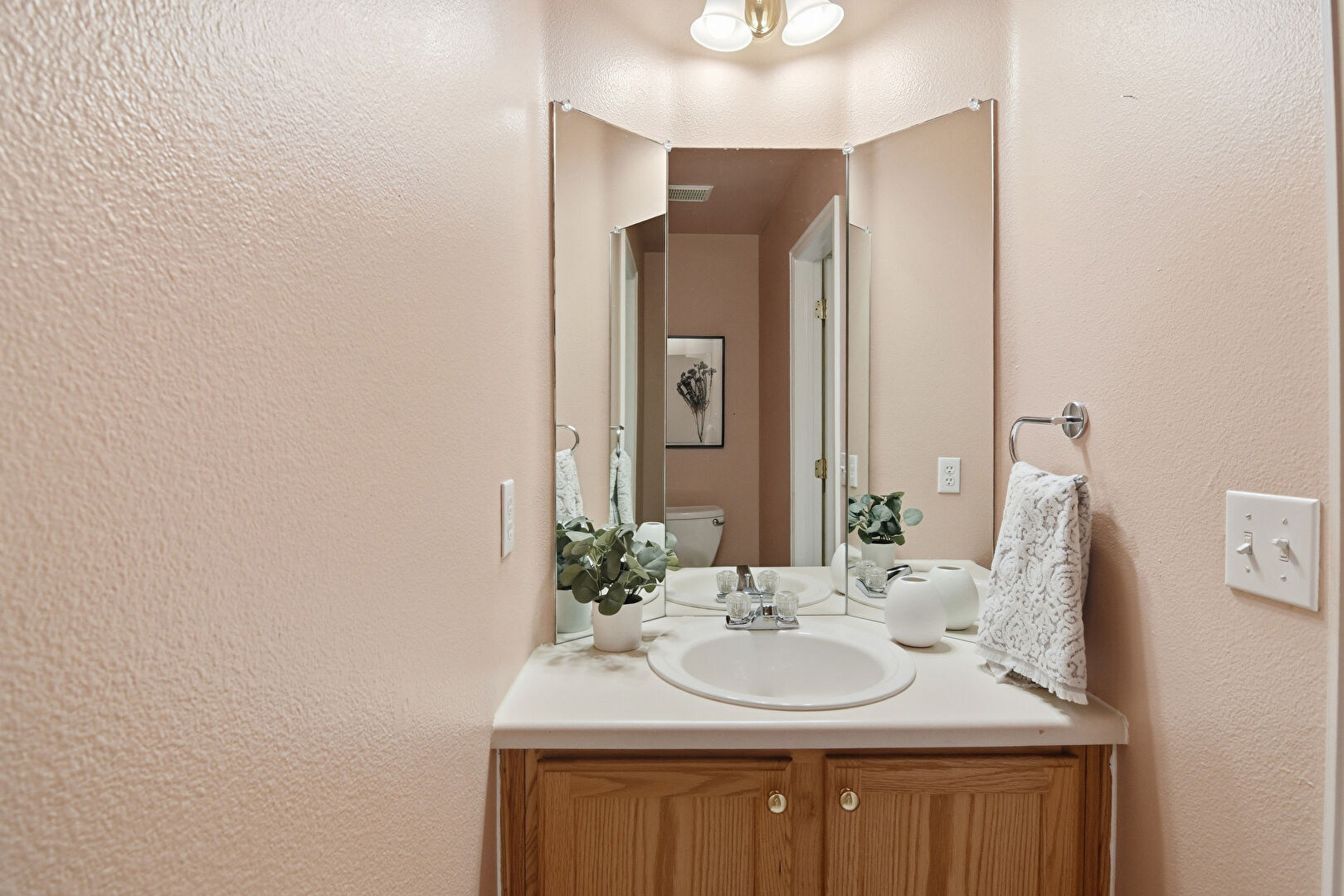 Drywall, Full Bathroom, Notable Chandelier, Textured Wall, Vanity, Combined Bath Shower, Half Bathroom