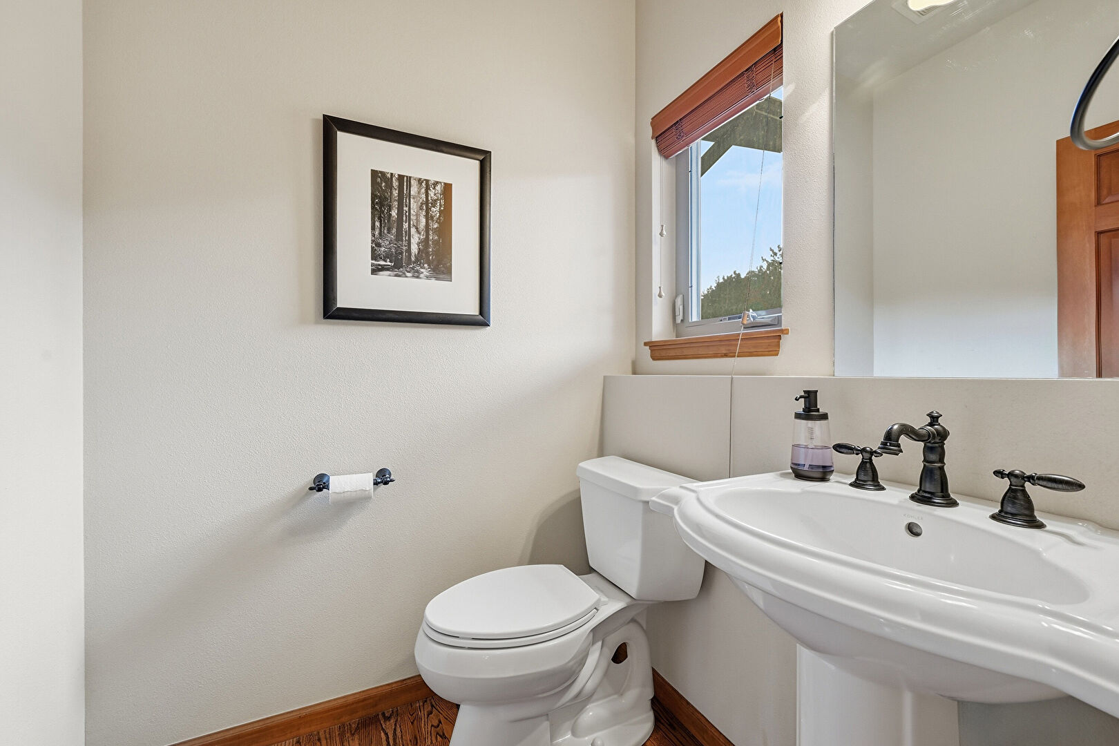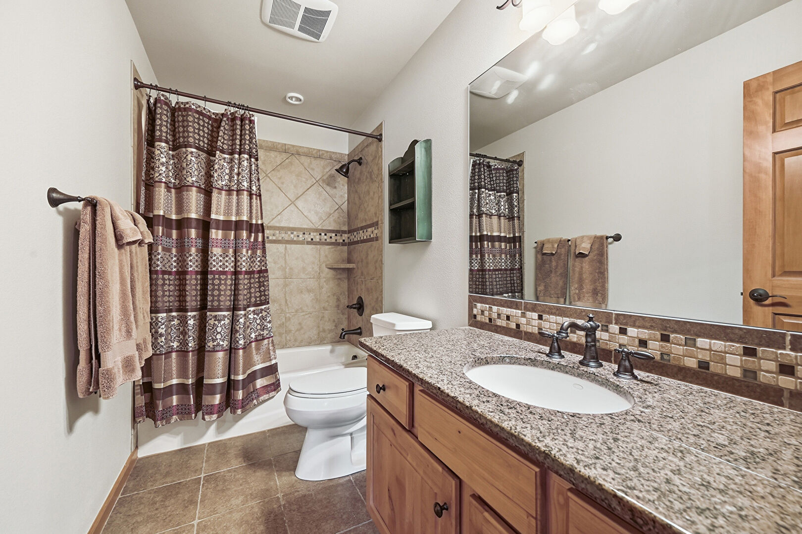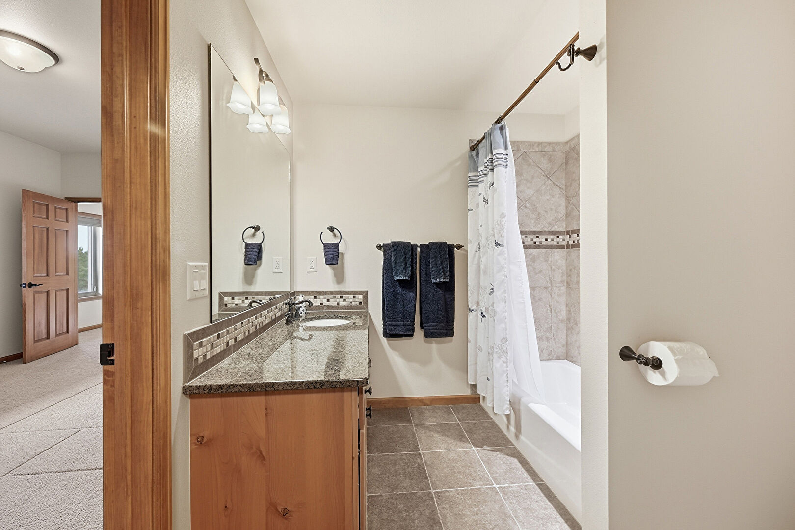 Baseboards Wall, Combined Bath Shower, Double Vanity, Drywall, Full Bathroom, Half Bathroom, Natural Light, Tile Floor, Vent, Wood Finish Floor, Baseboards Wall, Tile Floor, Vanity