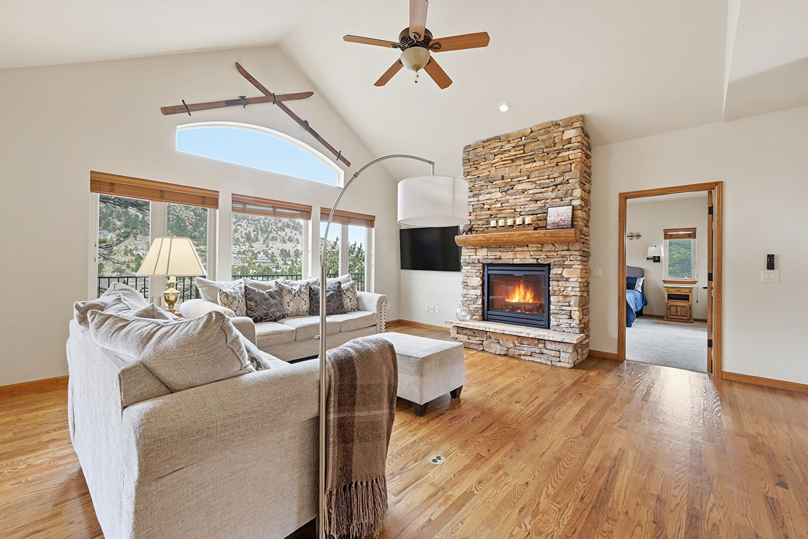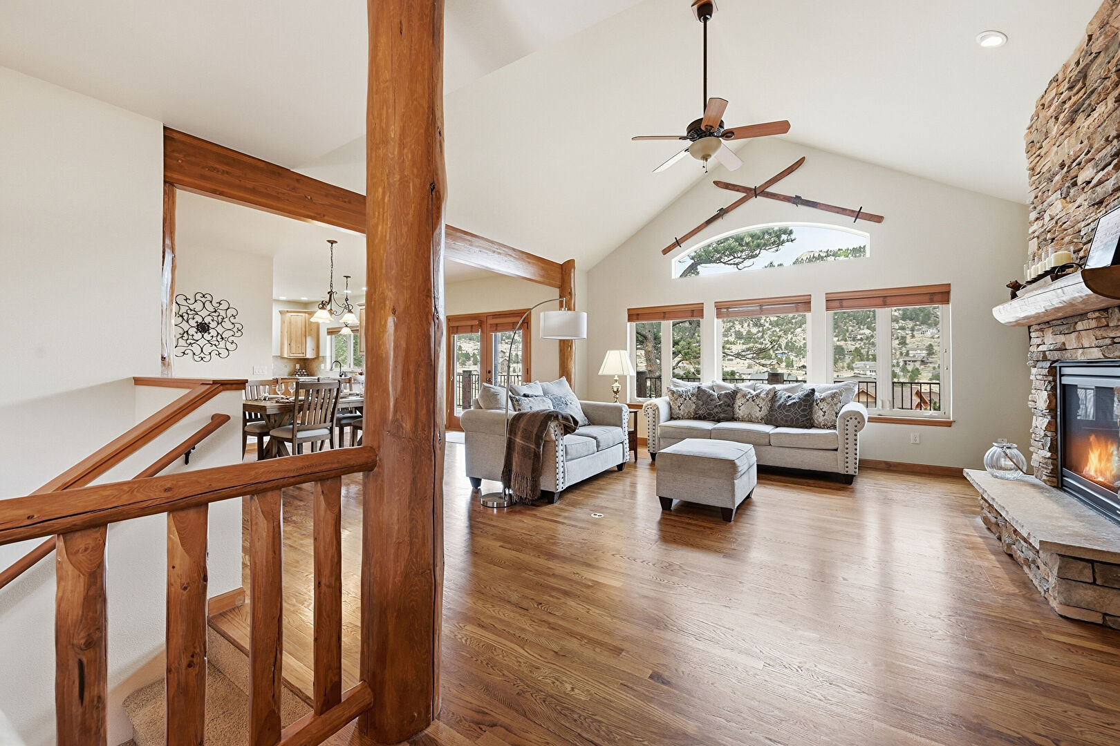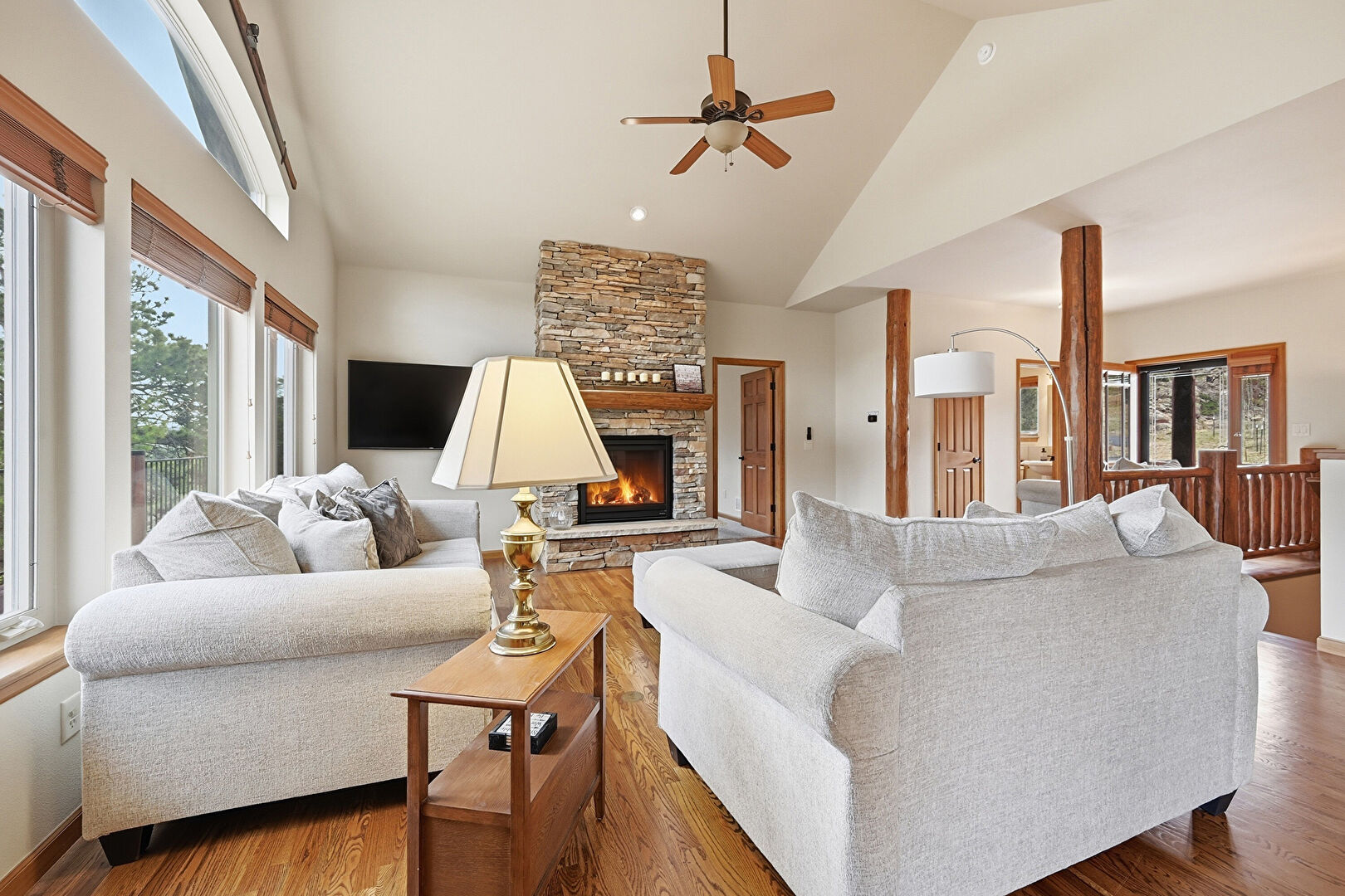 Baseboards Wall, Beamed Ceiling, Cathedral Ceiling, Ceiling Fan, Drywall, Fireplace, High Ceiling, Natural Light, Notable Chandelier, Recessed Lighting, Vaulted Ceiling, Wood Finish Floor, Baseboards Wall, Drywall, Fireplace, High Ceiling