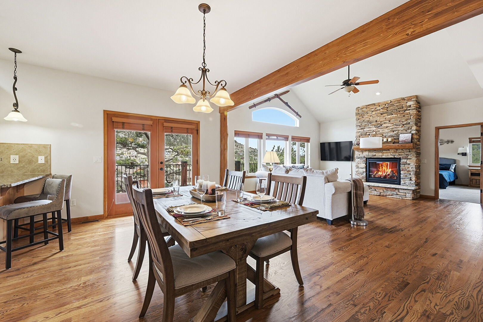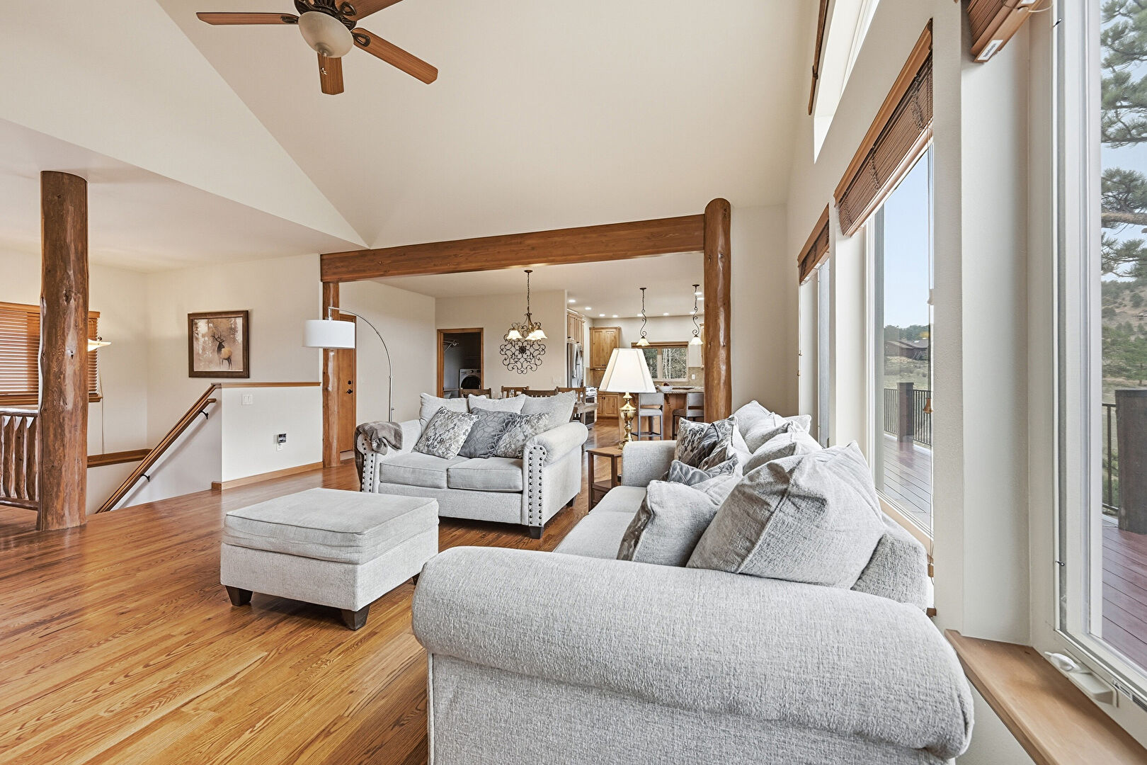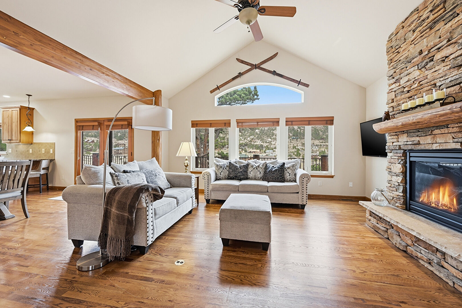 Baseboards Wall, Beamed Ceiling, Cathedral Ceiling, Ceiling Fan, Drywall, Fireplace, High Ceiling, Natural Light, Notable Chandelier, Recessed Lighting, Vaulted Ceiling, Wood Finish Floor, Baseboards Wall, Drywall, Fireplace, High Ceiling