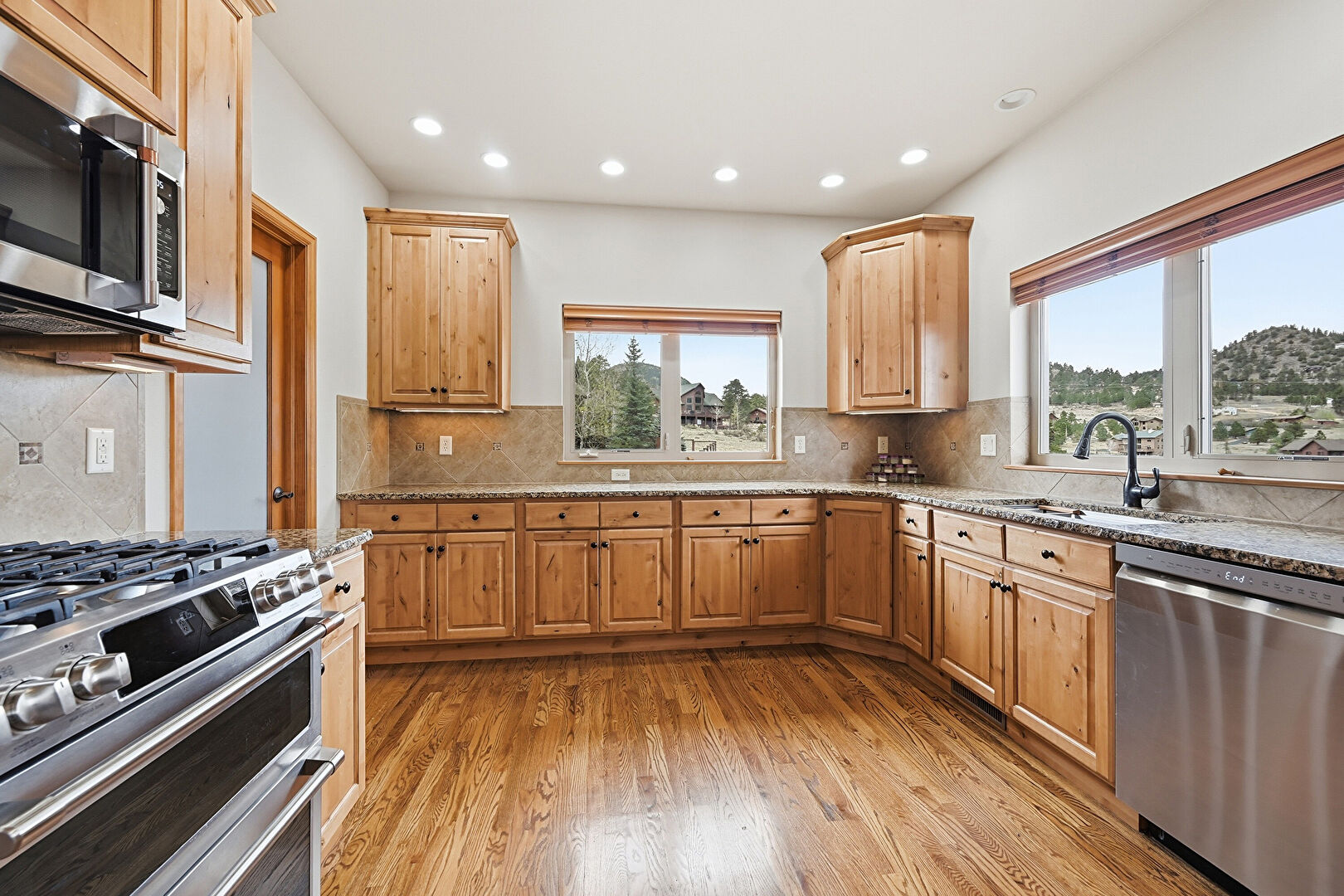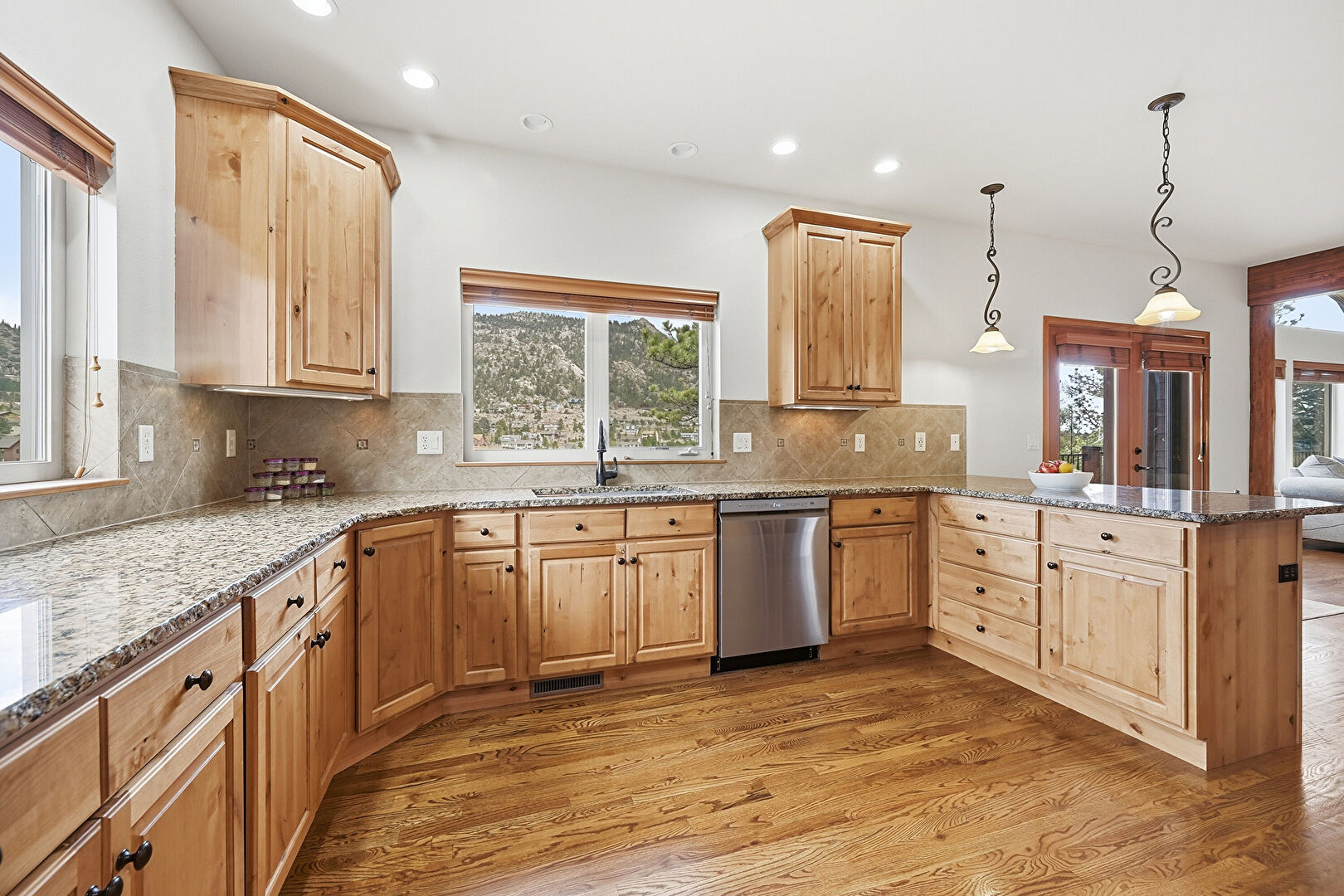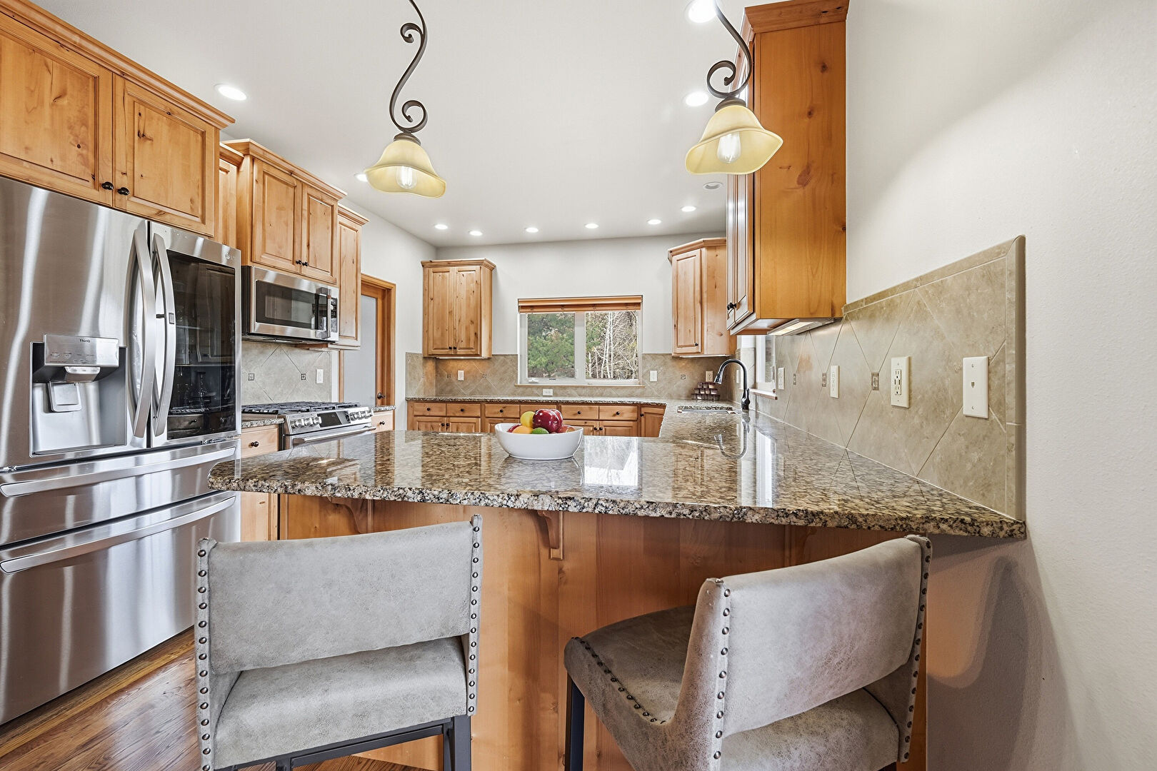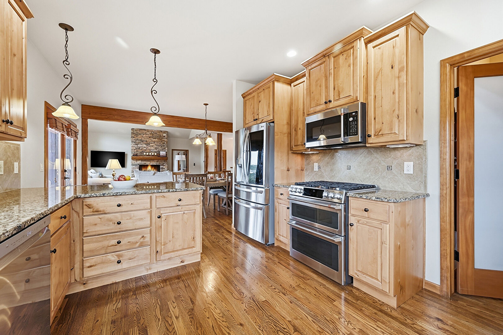 Crown Molding Cabinets, Drywall, Fireplace, G Shaped Kitchen, Kitchen Bar, Kitchen Peninsula, Natural Light, Opens To Living Area, Pendant Lighting, Raised Cabinets, Recessed Lighting, Stone Countertops, Vent, Wood Finish Floor, Drywall, Natural Light, Stone Countertops