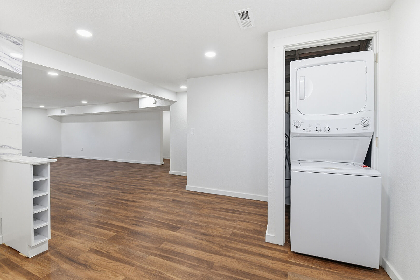 Baseboards Wall, Basement, Drywall, Laundry, Vent, Wood Finish Floor, Recessed Lighting
