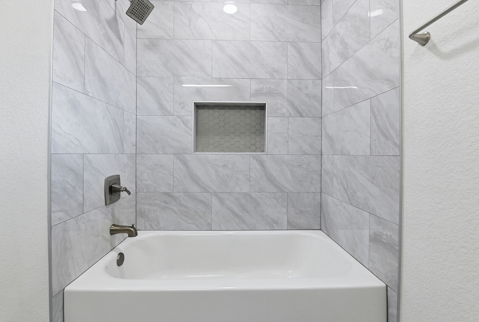 Baseboards Wall, Combined Bath Shower, Full Bathroom, Natural Light, Textured Wall, Vanity, Vent, Textured Wall, Tile Floor
