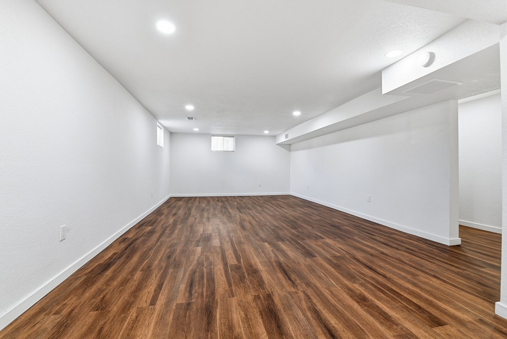 Baseboards Wall, Basement, Drywall, Natural Light, Recessed Lighting, Vent, Wood Finish Floor, Basement, Stairs