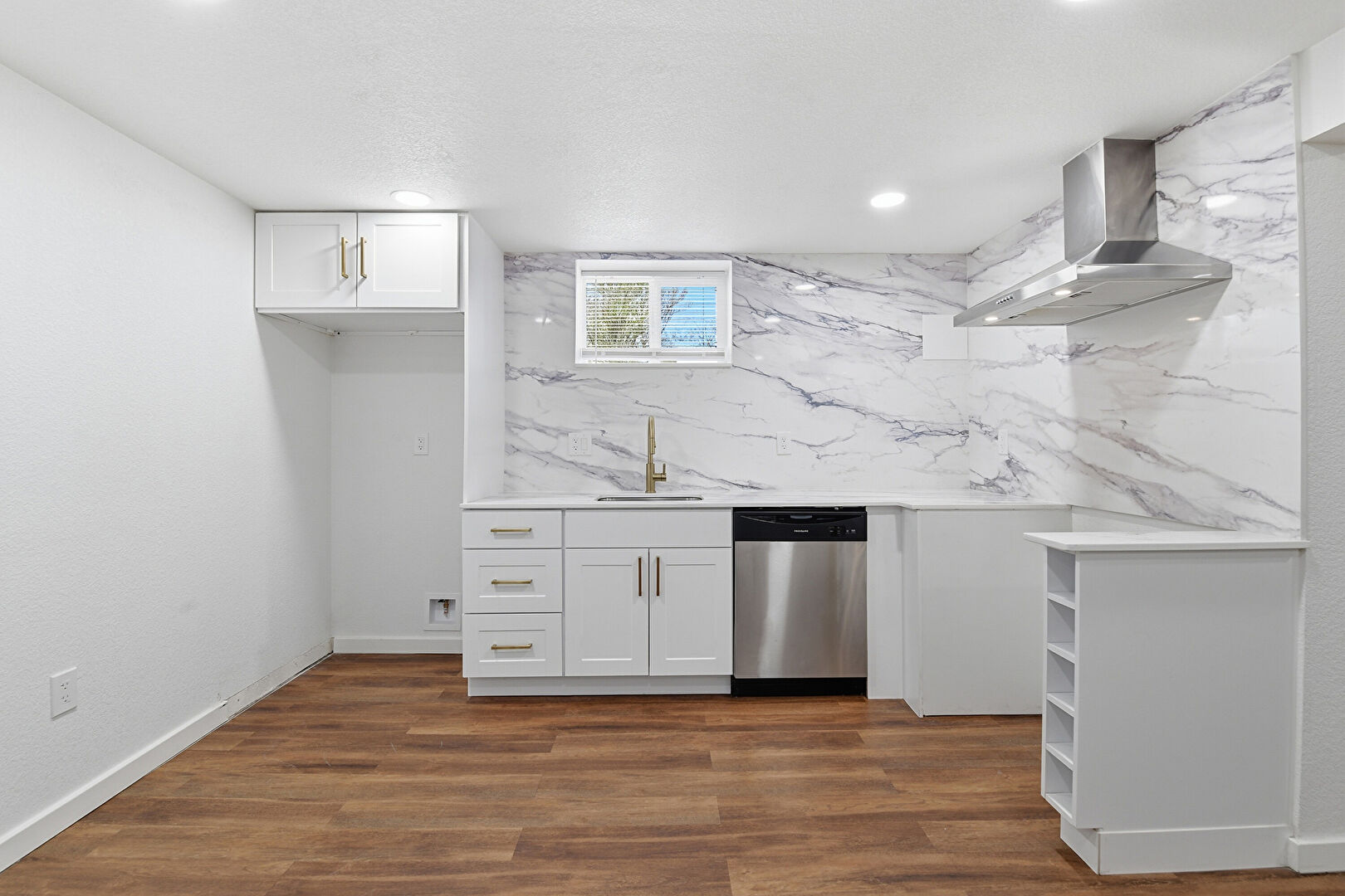 Baseboards Wall, Open Shelves, Recessed Lighting, Vent, Wood Finish Floor, Drywall