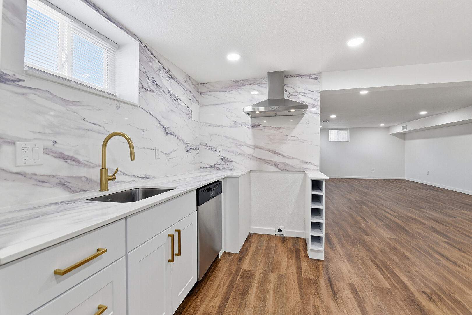 Baseboards Wall, Basement, Drywall, Natural Light, Open Shelves, Opens To Living Area, Recessed Lighting, Shaker Cabinets, Stone Countertops, Textured Ceiling, Vent, Wood Finish Floor, Recessed Lighting, Shaker Cabinets