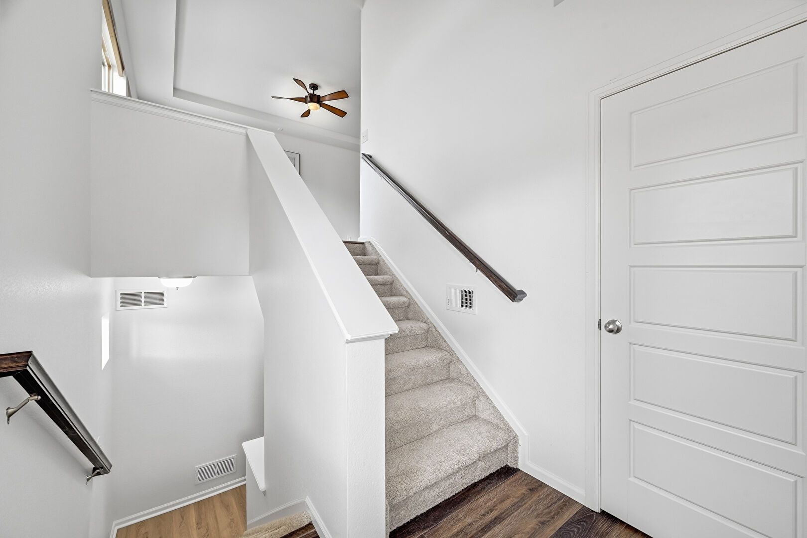 Baseboards Wall, Ceiling Fan, Drywall, Natural Light, Stairs, Vent, Wood Finish Floor, Drywall, High Ceiling