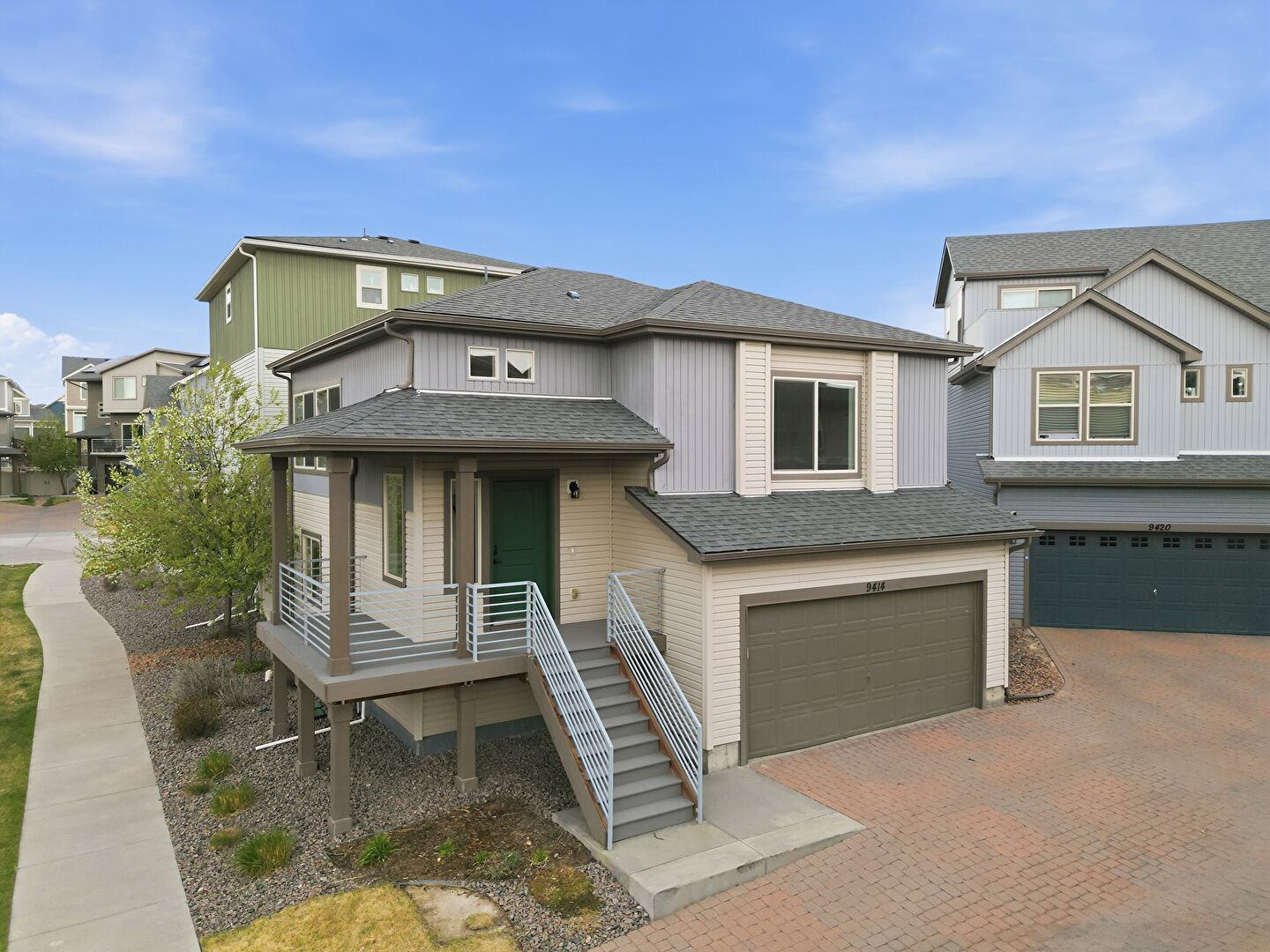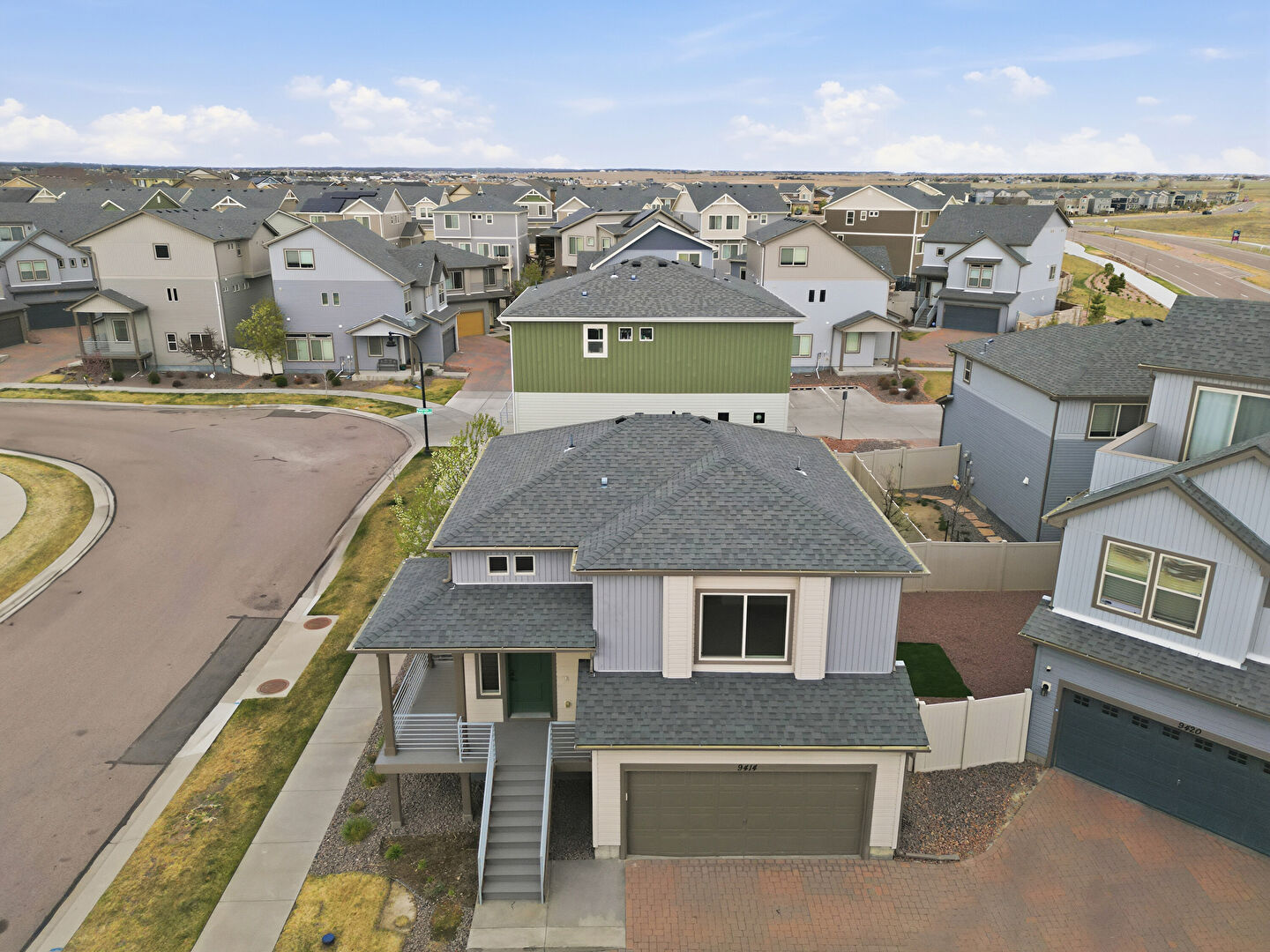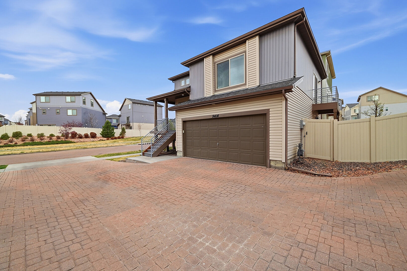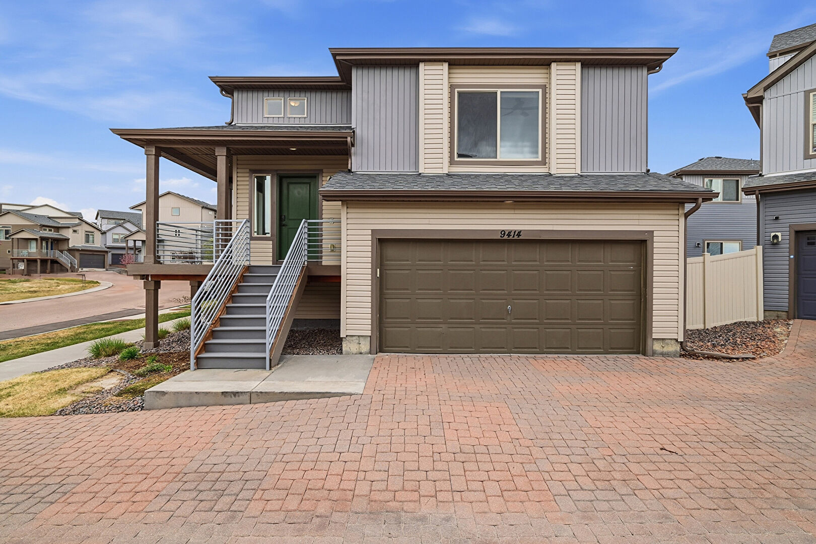Built In Garage, Concrete Foundation, Downspout, Driveway, Electric Meter, Fence, Gas Meter, Gate, Gutters, Horizontal Siding, Porch, Residential View, Shingle Roof, Stairs, Vertical Siding, Concrete Foundation, Gutters, Vertical Siding