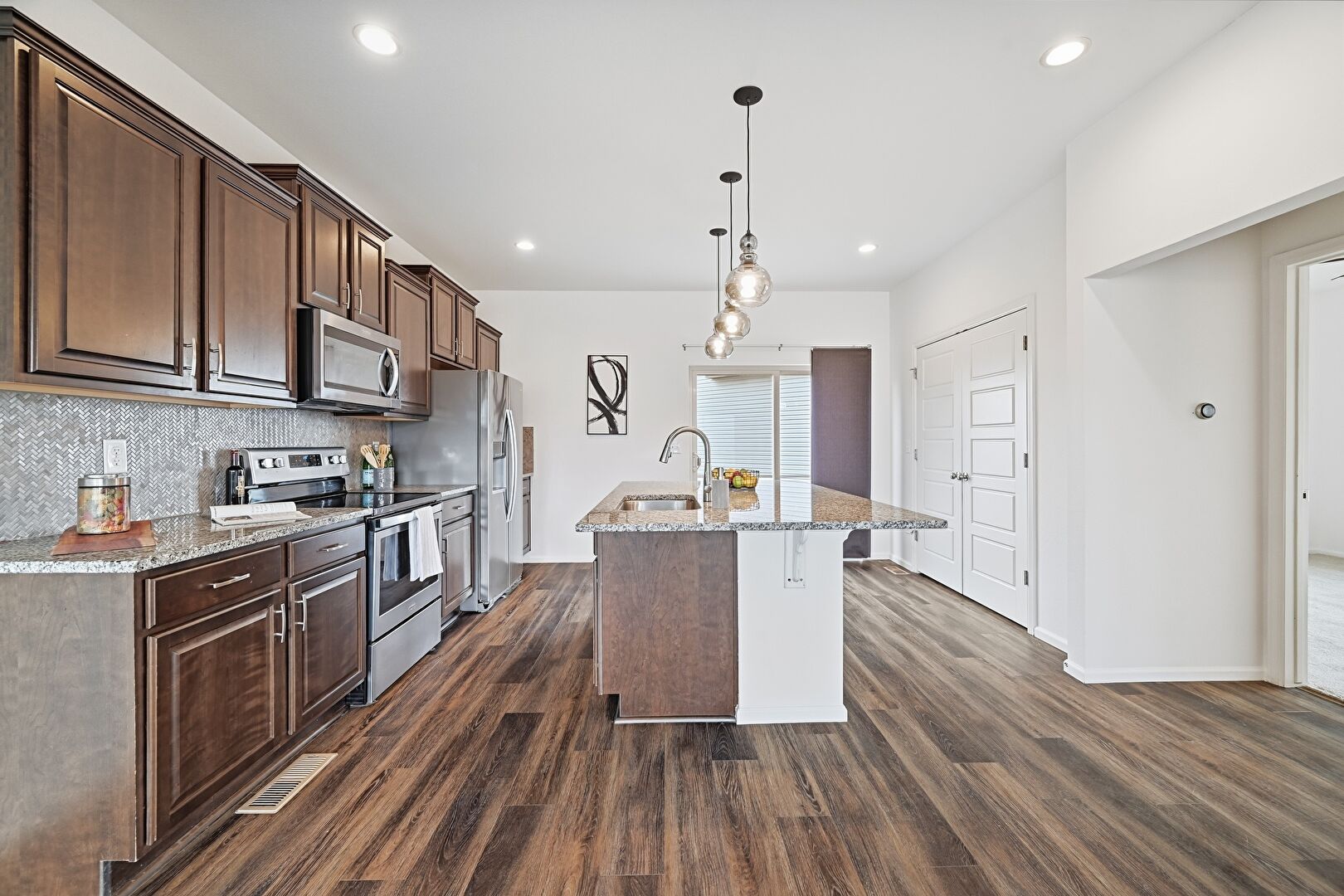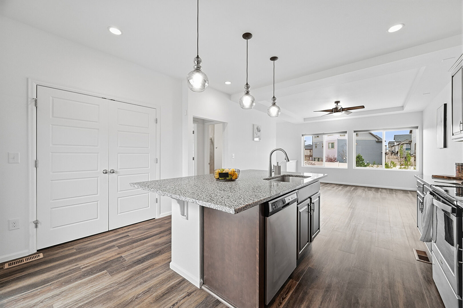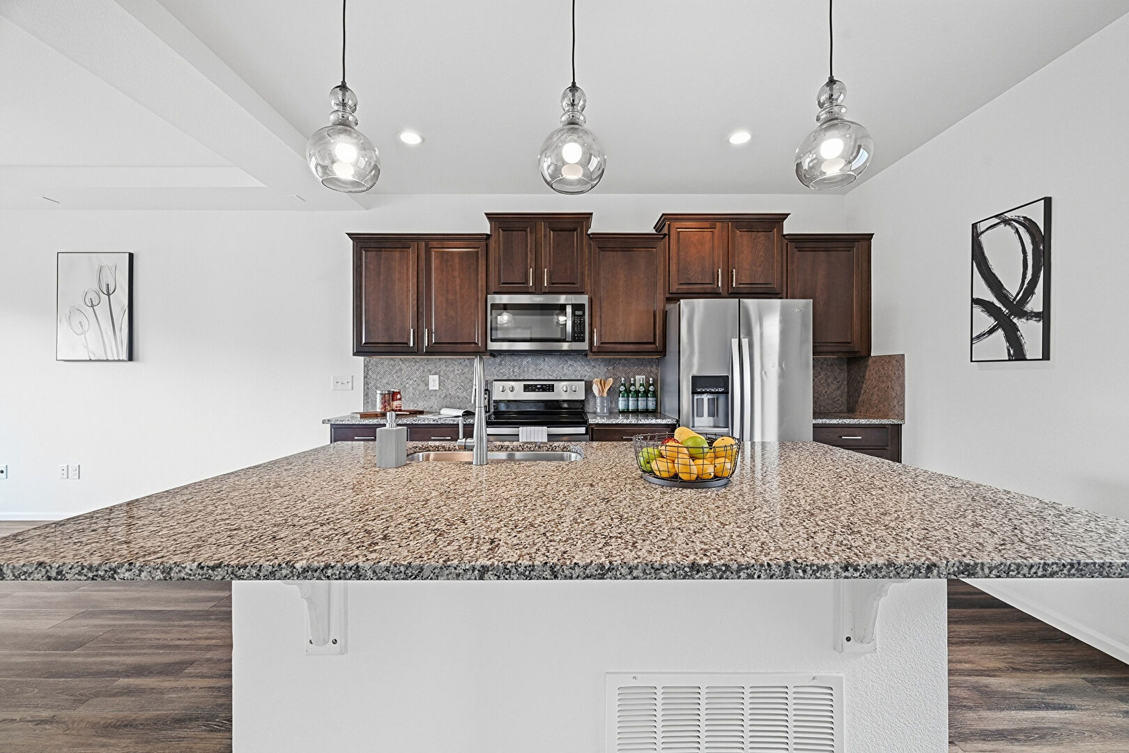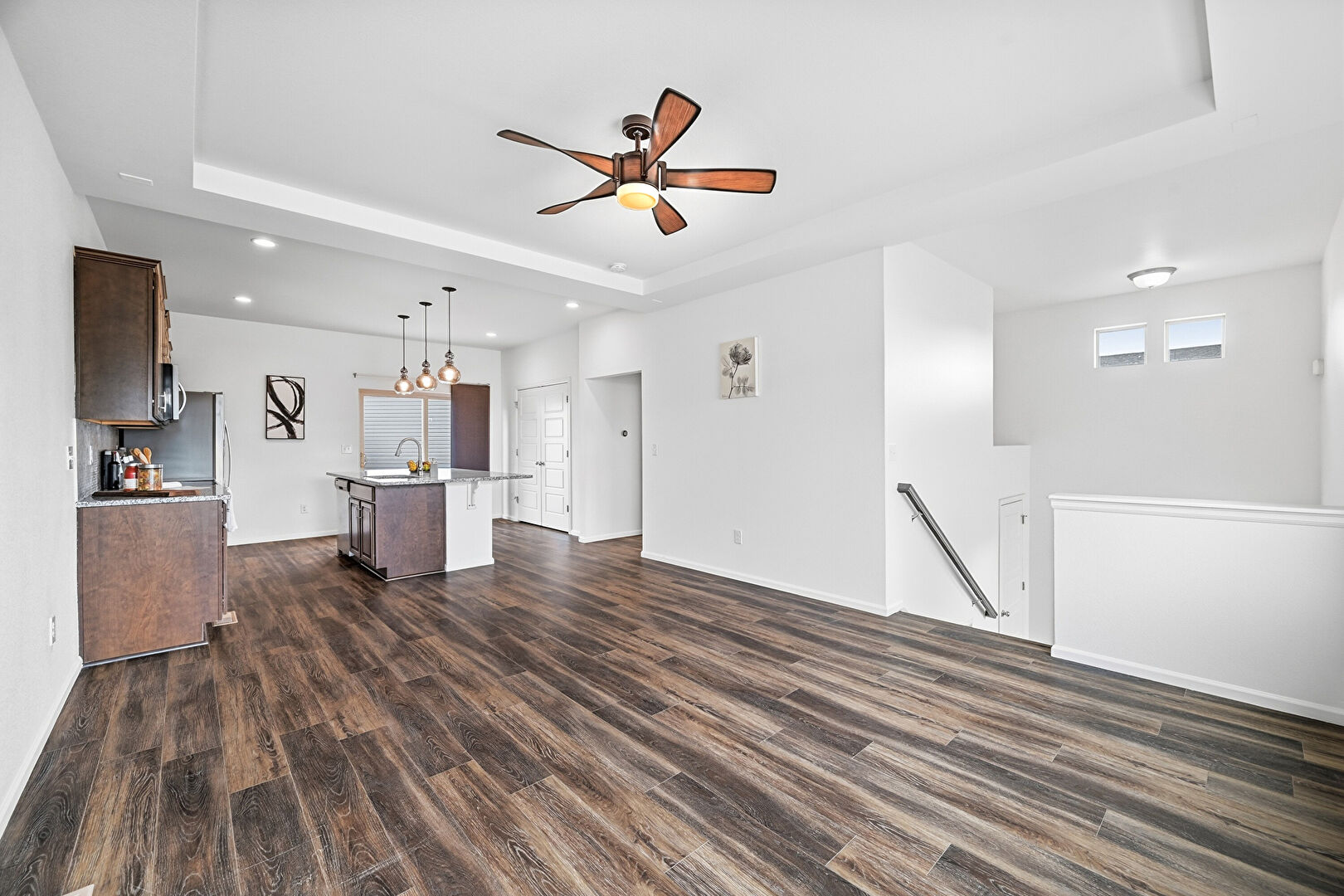 Baseboards Wall, Ceiling Fan, Crown Molding Cabinets, Dark Brown Cabinets, Drywall, Kitchen Bar, Kitchen Island, Natural Light, One Wall Kitchen, Opens To Living Area, Pendant Lighting, Raised Cabinets, Recessed Lighting, Shaker Cabinets, Stone Countertops, Tray Ceiling, Vent, Wood Finish Floor, Dark Brown Cabinets, Drywall, Raised Cabinets, Recessed Lighting, Stone Countertops