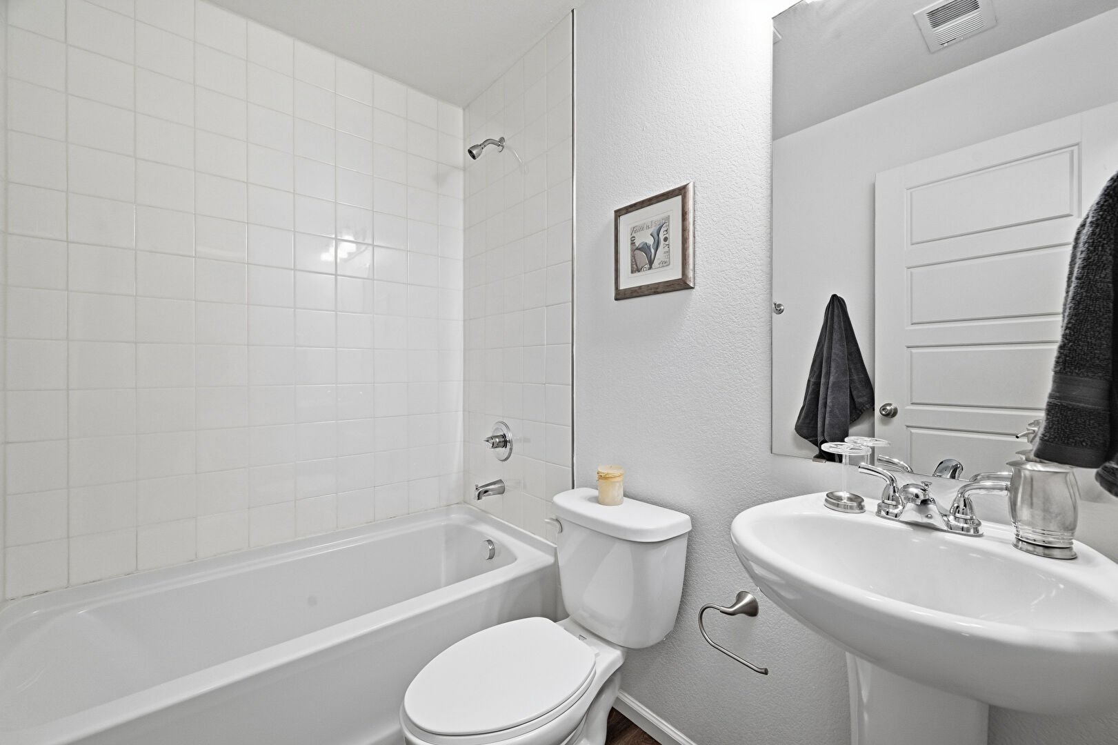 Baseboards Wall, Combined Bath Shower, Full Bathroom, Vent, Textured Wall