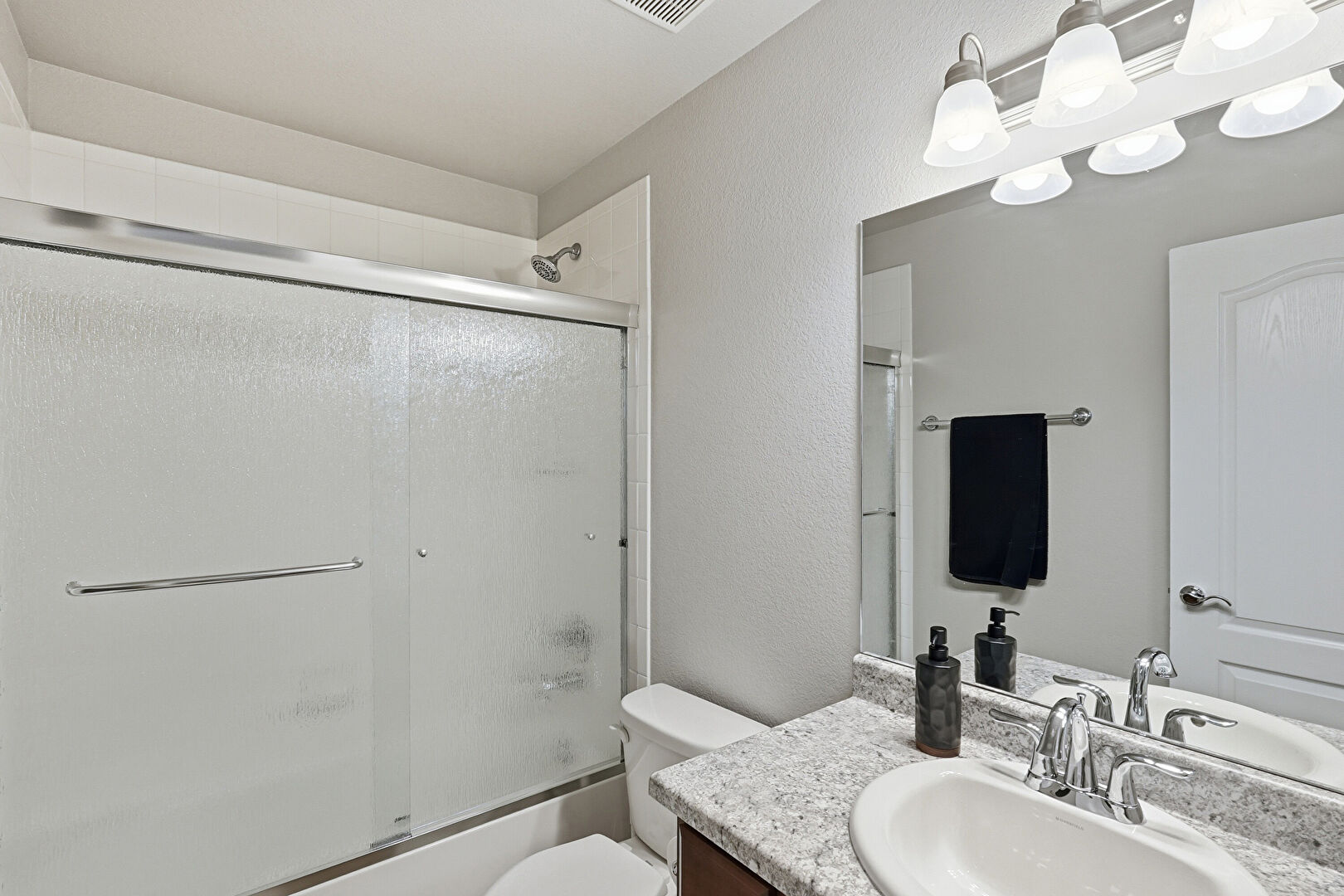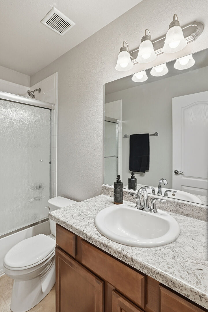 Combined Bath Shower, Full Bathroom, Textured Wall, Tile Floor, Vanity, Vent, Textured Wall, Vent