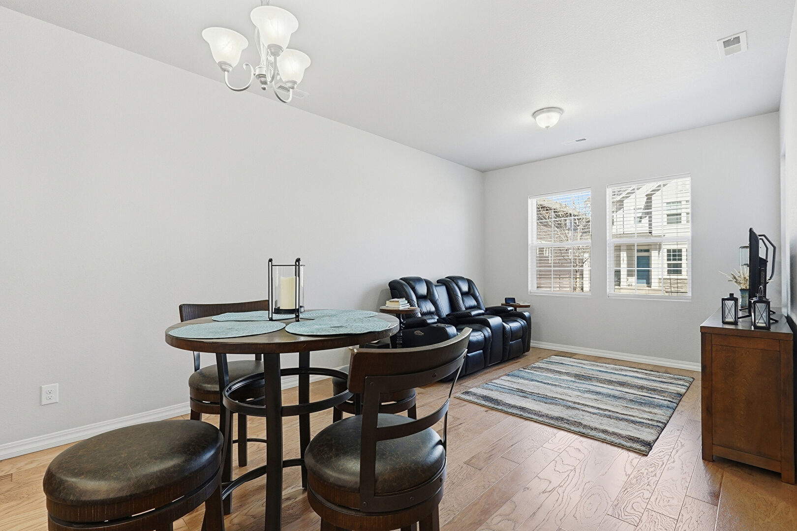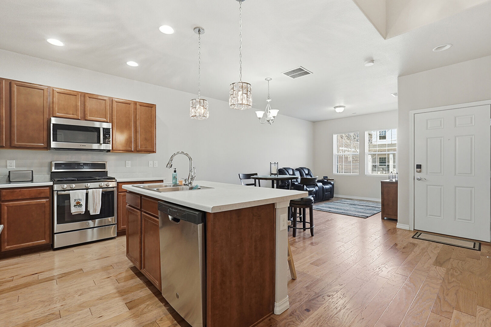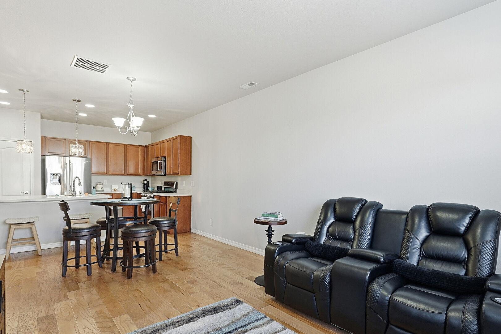 Baseboards Wall, Drywall, Natural Light, Notable Chandelier, Recessed Lighting, Vent, Wood Finish Floor, Baseboards Wall, L Shaped Kitchen, Natural Light