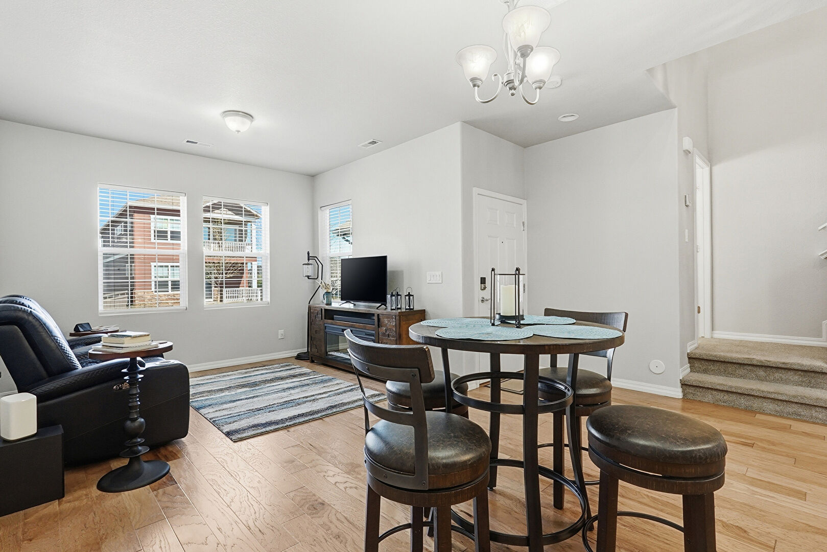 Baseboards Wall, Drywall, Natural Light, Notable Chandelier, Stairs, Vent, Wood Finish Floor, Baseboards Wall, Wood Finish Floor