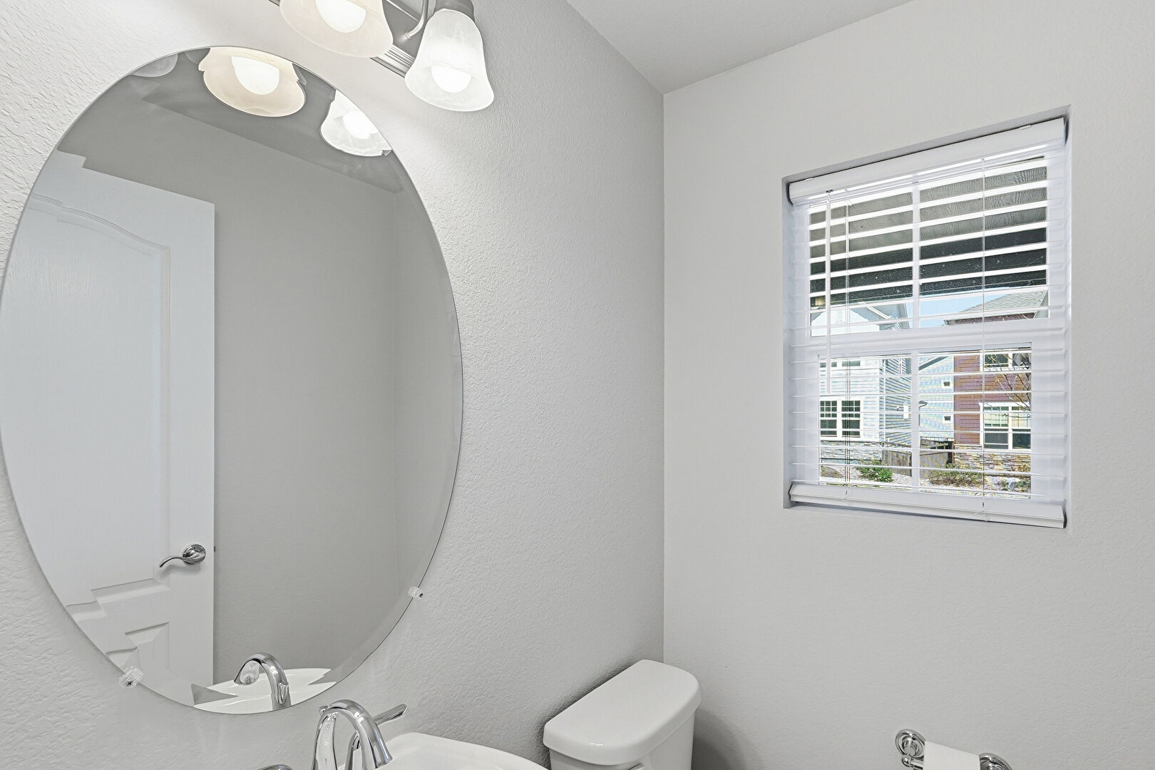 Baseboards Wall, Half Bathroom, Natural Light, Textured Wall, Vanity, Vent, Marble Finish Floor, Natural Light